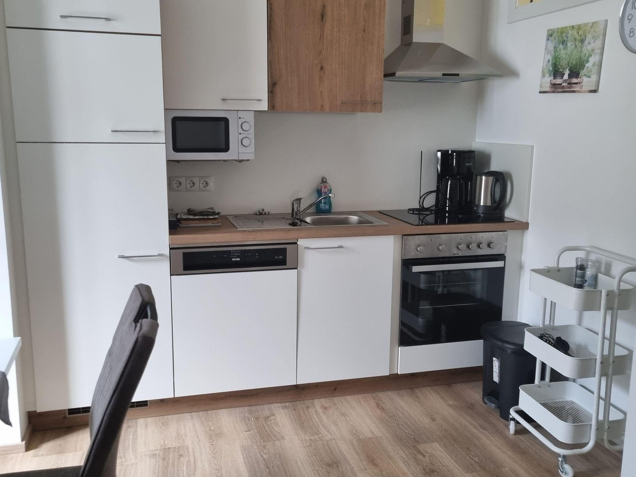 Die Küche ist mit Kühlschrank m. Gefrierfach, Kochfeld, Backofen, Spülmaschine, Wasserkocher u. Kaffeemaschine (Filter) ausgestattet.