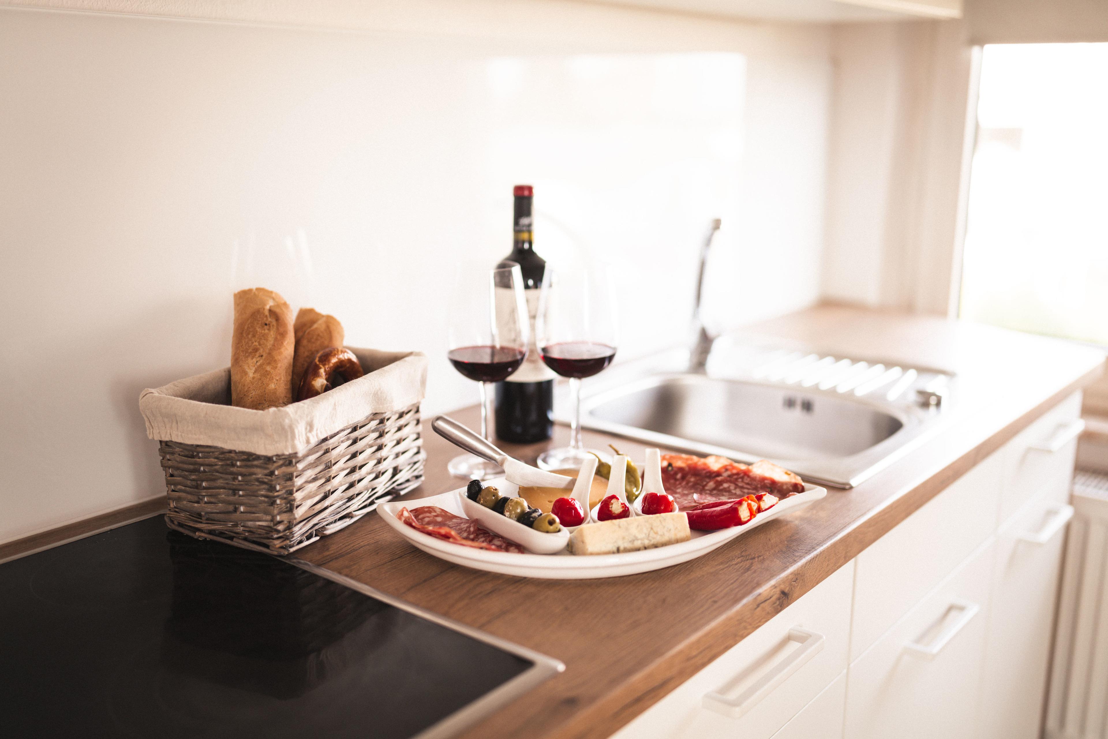 gegen Aufpreis bieten wir einen Brötchenservice an. Hier bekommen Sie Brötchen, Getränke, etc direkt an die Haustür geliefert. Ebenso bieten wir unseren "Sekt-Starter" (59€) an. Dieser beinhaltet eine Flasche Winzersekt, eine kleine Käseauswahl und frisches Baguette.