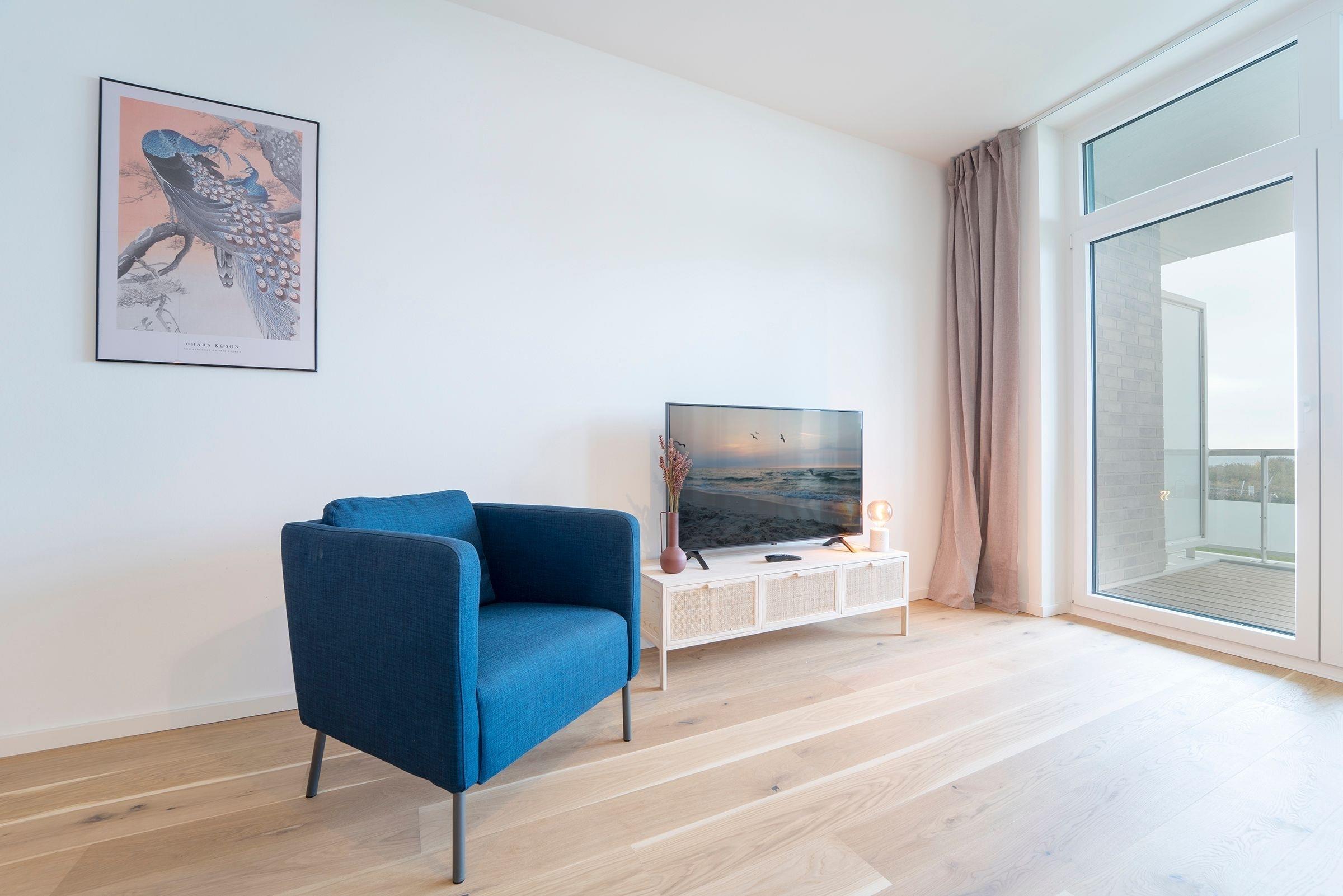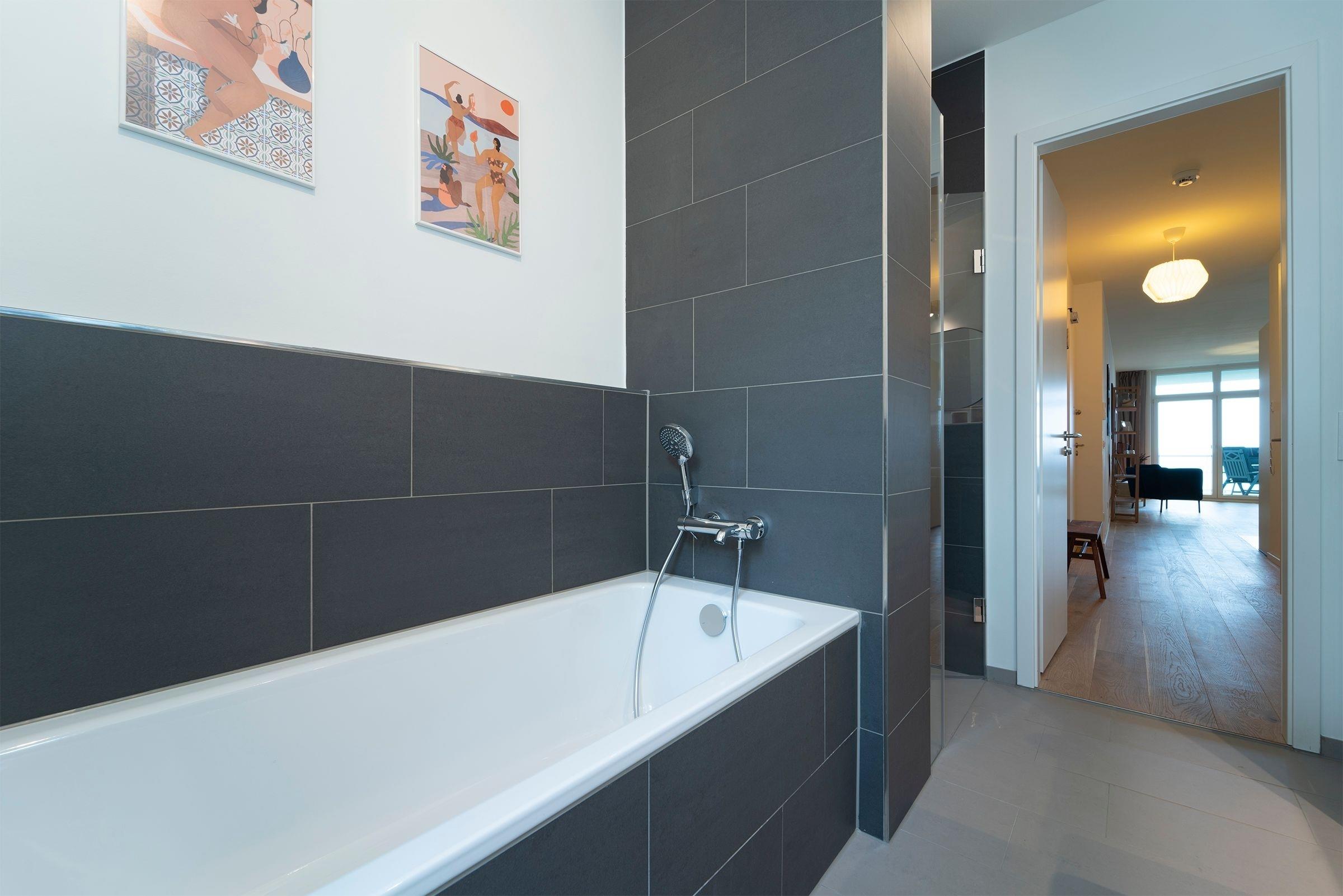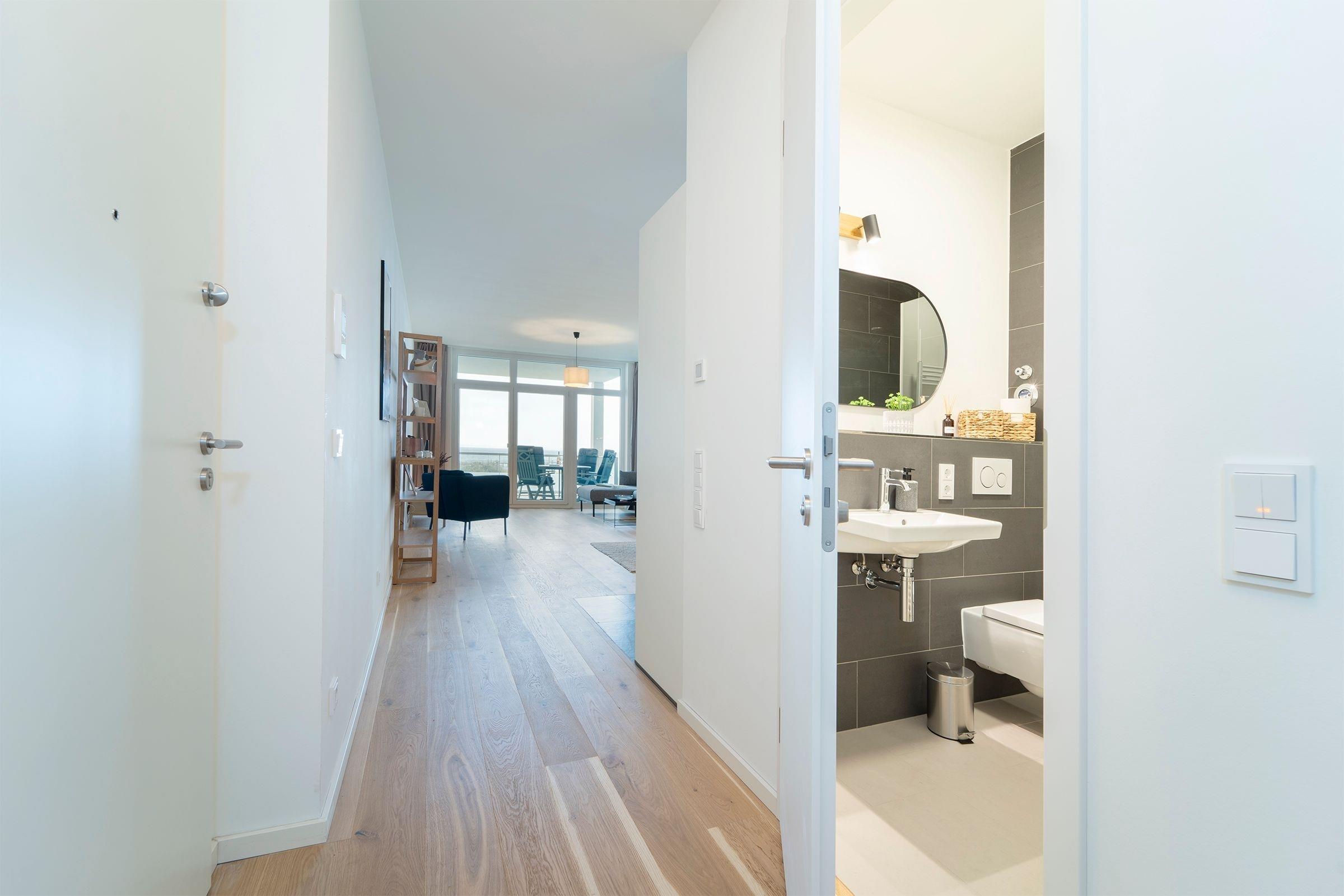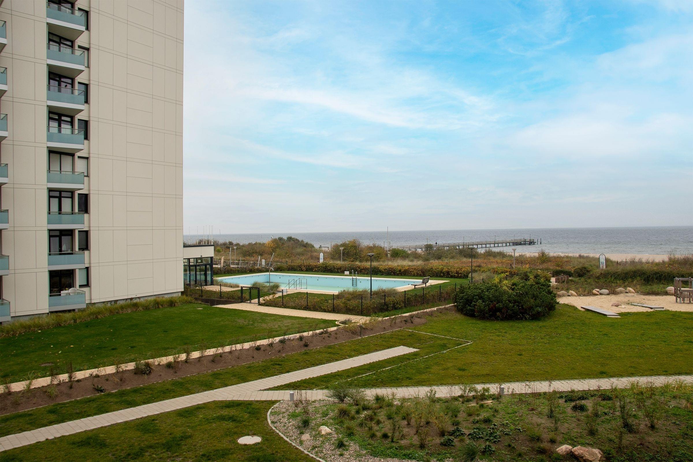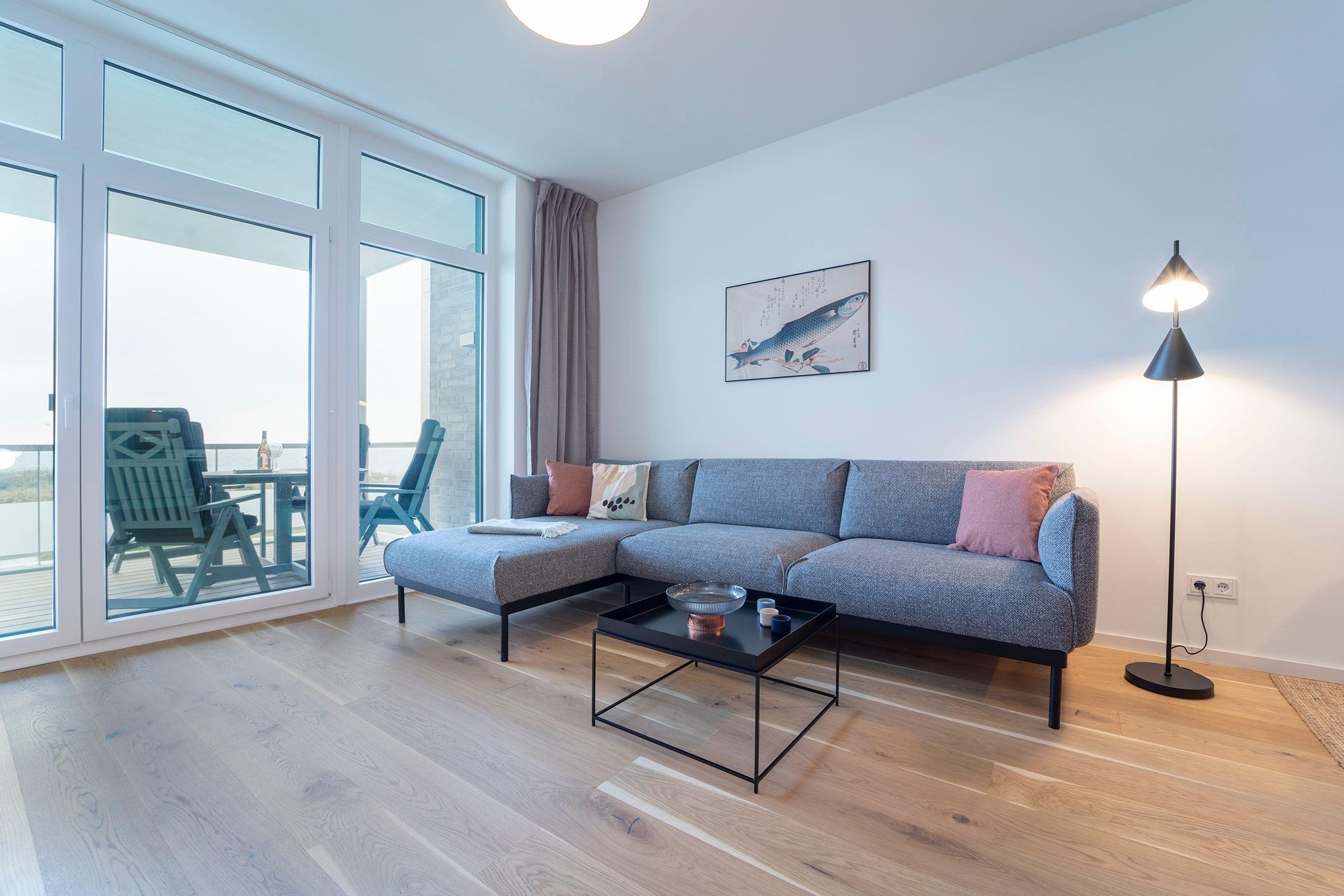Hier werden Sie sich wohlfühlen! Modern und hell begrüßt Sie das Herzstück der Wohnung - der große, offene Wohnraum mit integrierter, voll ausgestatteter Küche lädt Sie zu einer Auszeit ein. Vom überdachten, möblierten Balkon in Südausrichtung haben Sie freie Sicht auf die Ostsee. Schlafen und entspannen Sie sich im separaten Schlafzimmer mit bequemem Boxspringbett (2x 90x200cm) und Kleiderschrank. Ein zweites Schlafzimmer mit zwei Einzelbetten (je 90x200 cm) sorgt ebenfalls für ruhige Nächte. Außerdem sorgen gleich zwei hochwertig ausgestattete Badezimmer mit bodengleicher Dusche für Entschleunigung am Morgen - eines davon sogar mit Badewanne.