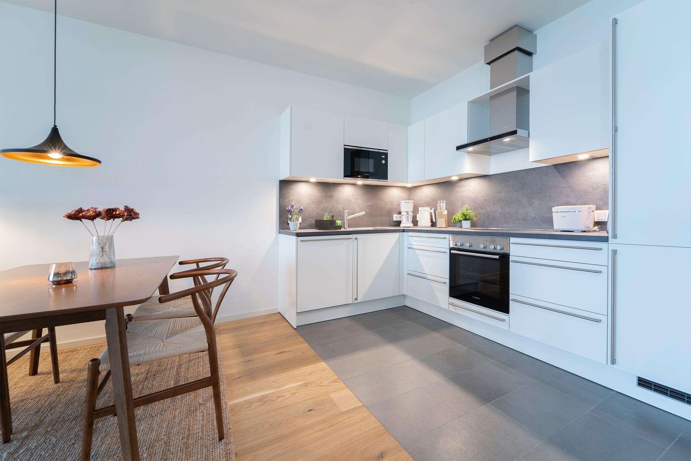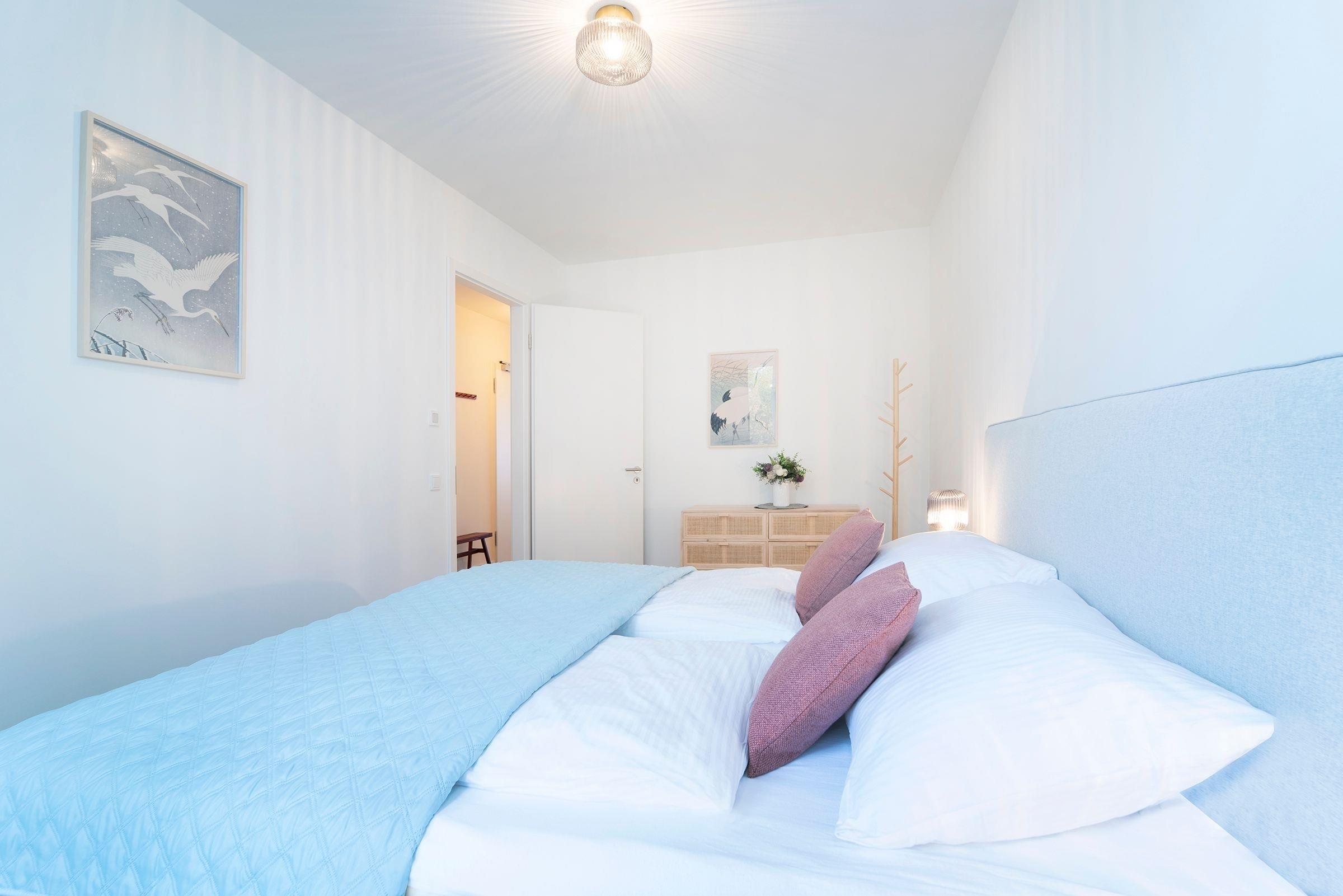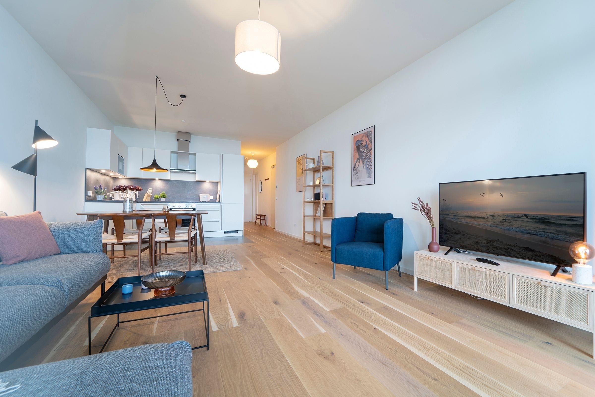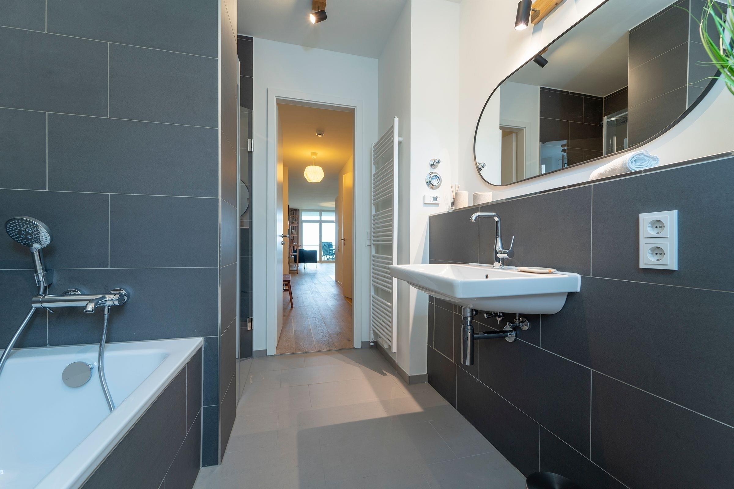 Hier werden Sie sich wohlfühlen! Modern und hell begrüßt Sie das Herzstück der Wohnung - der große, offene Wohnraum mit integrierter, voll ausgestatteter Küche lädt Sie zu einer Auszeit ein. Vom überdachten, möblierten Balkon in Südausrichtung haben Sie freie Sicht auf die Ostsee. Schlafen und entspannen Sie sich im separaten Schlafzimmer mit bequemem Boxspringbett (2x 90x200cm) und Kleiderschrank. Ein zweites Schlafzimmer mit zwei Einzelbetten (je 90x200 cm) sorgt ebenfalls für ruhige Nächte. Außerdem sorgen gleich zwei hochwertig ausgestattete Badezimmer mit bodengleicher Dusche für Entschleunigung am Morgen - eines davon sogar mit Badewanne.