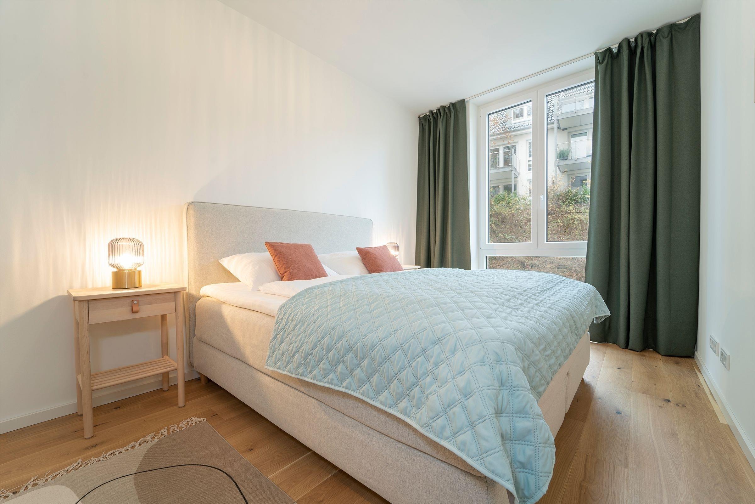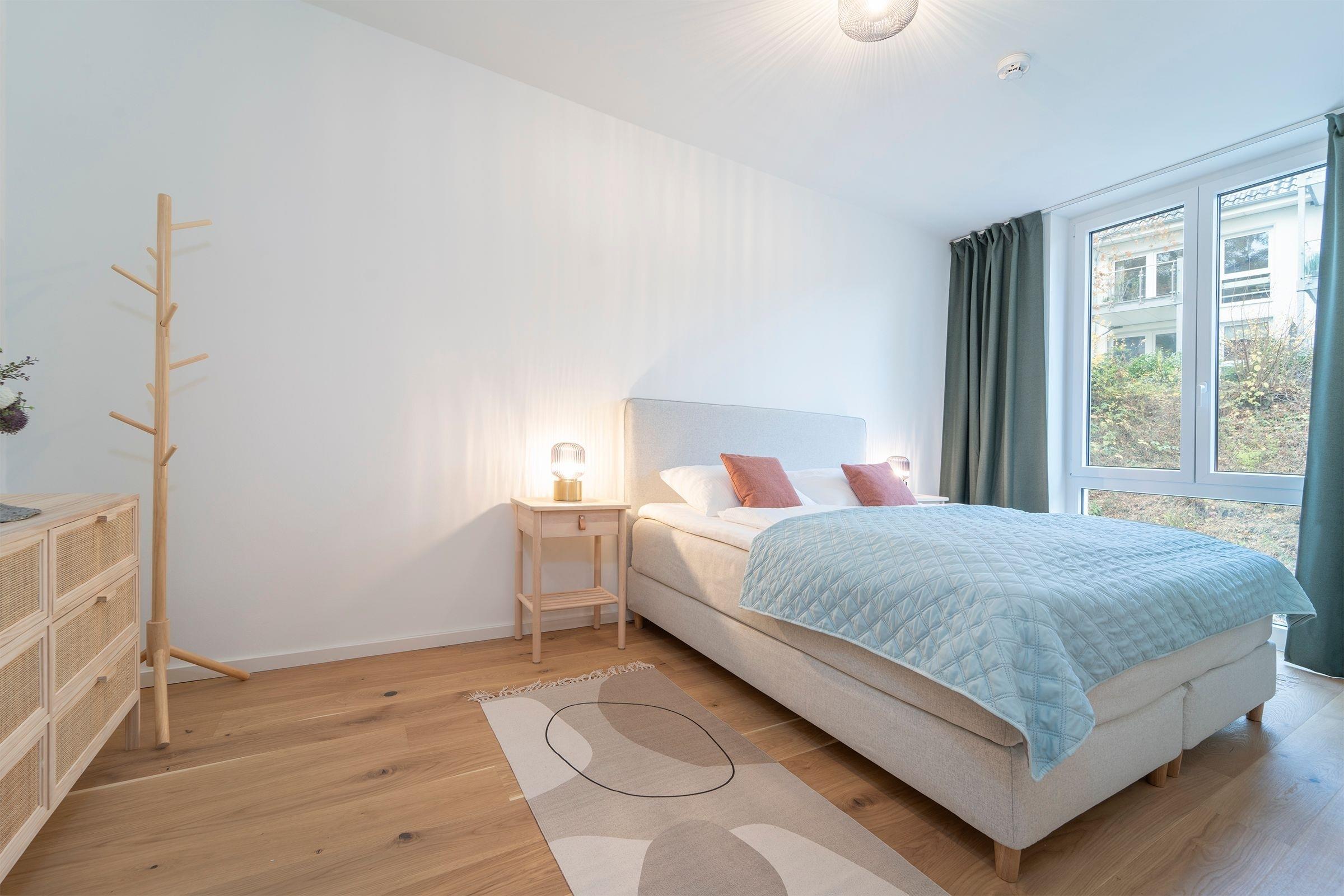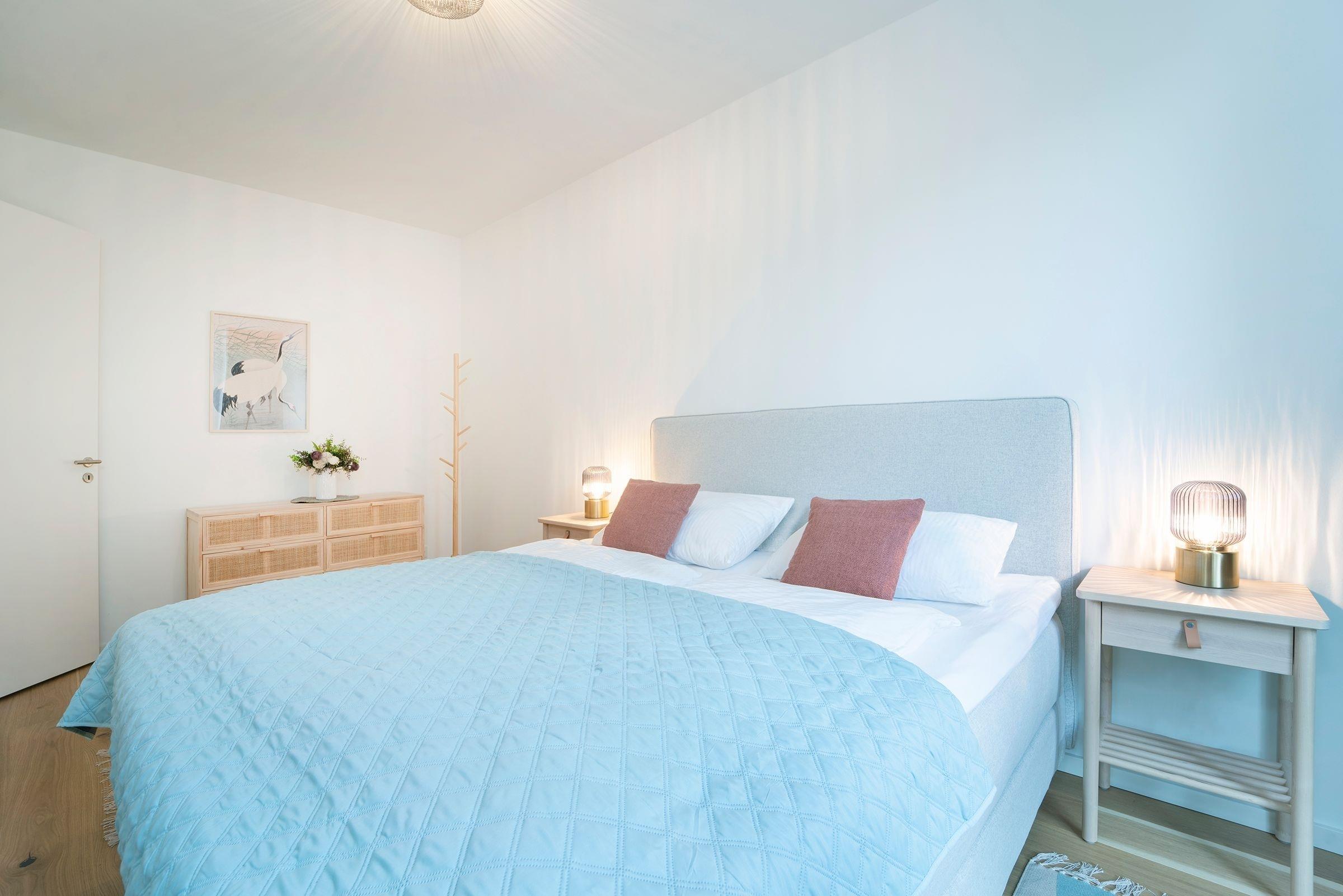 Schlafzimmer 1: 1 Boxspringbett (2x 90x200 cm), Verdunkelungsmöglichkeit, Platz für Babybett vorhanden