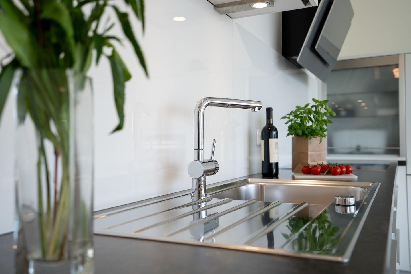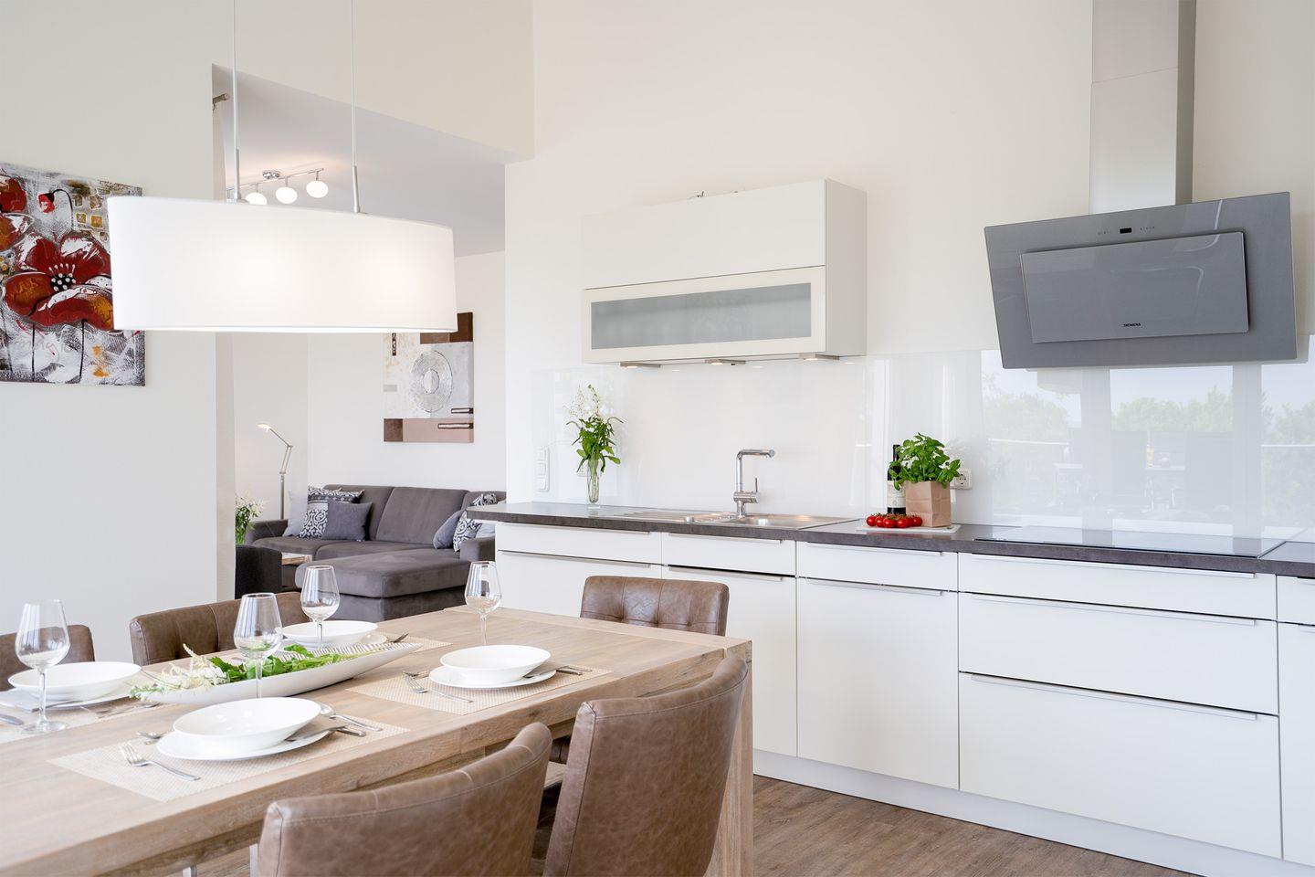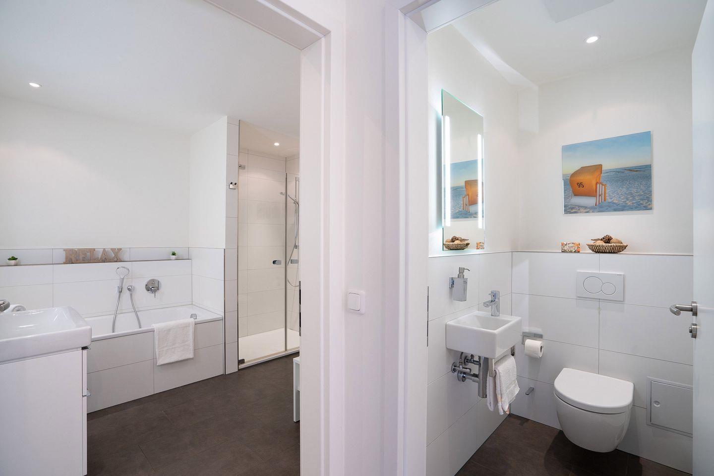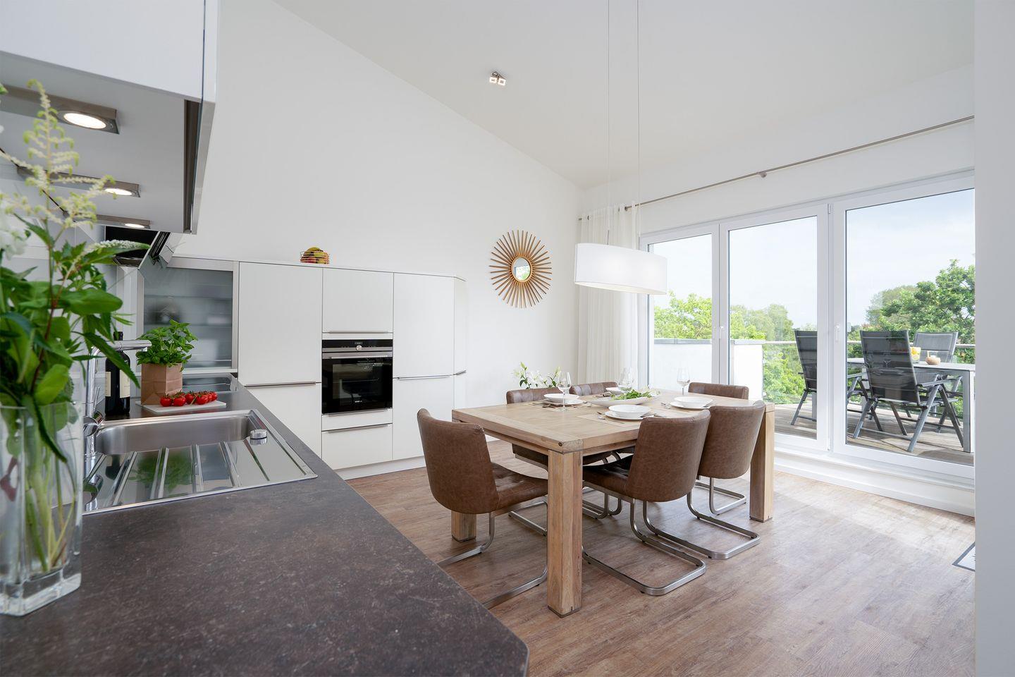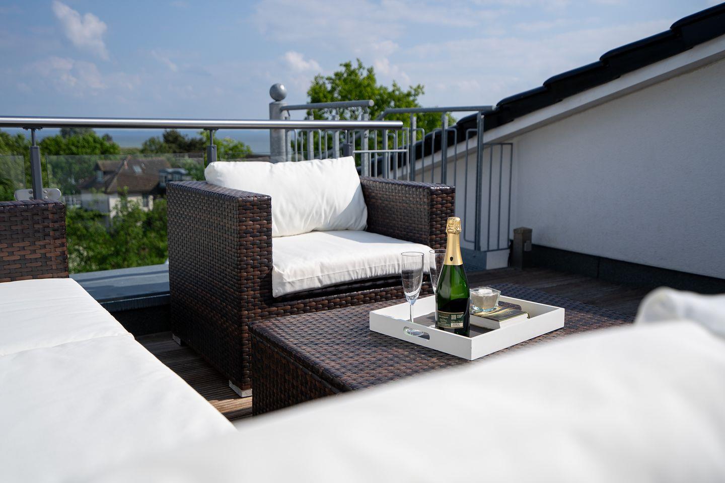Durch seine strandnahe Lage macht das Haus seinem Namen alle Ehre. Diese attraktive, moderne 3-Zimmer-Fewo befindet sich in der 3.Etage mit zwei Balkonen und einer wunderbaren 30 qm Dachterrasse mit Loungemöbeln, die zum Relaxen bei Blick aufs Meer einlädt. Die mit Spülmaschine, Backofen und Herd voll ausgestattete Küche ist in den kombinierten Wohn- und Essbereich integriert. Hier können Sie am großen Esstisch schöne gemeinsame Stunden mit Freunden und Familie verbringen, oder aber in der Sofaecke den Tag entspannt ausklingen lassen. Beide Schlafräume sind mit komfortablen Boxspringbetten ausgestattet. Im ersten Schlafraum steht ein Doppelbett (180 x 200 cm) und im zweiten Schlafraum zwei Einzelbetten (je 100 x 200 cm). Das große, moderne Bad verfügt über eine Badewanne und eine Dusche, zusätzlich gibt es noch ein Gäste-WC. Im Haus gibt es die Möglichkeit zu waschen. PKW-Stellplatz inklusive.