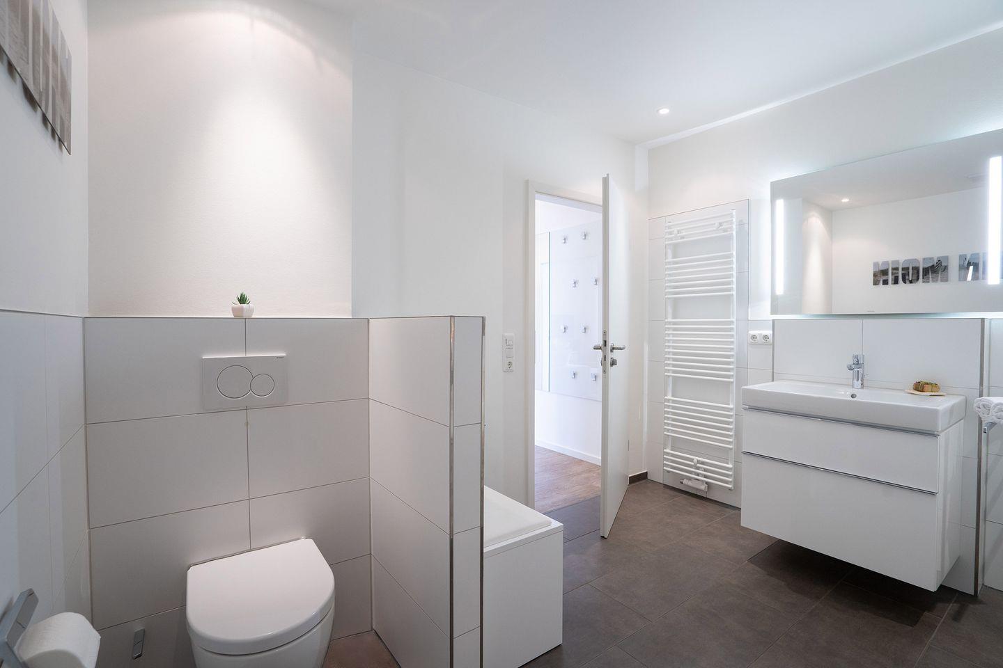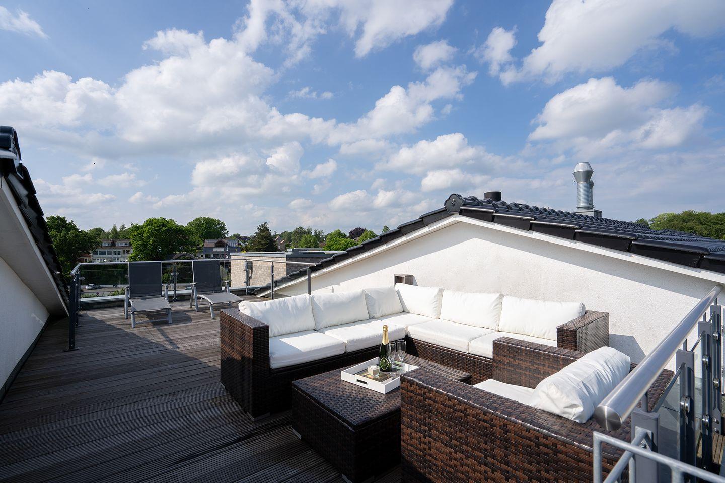 Durch seine strandnahe Lage macht das Haus seinem Namen alle Ehre. Hier befindet sich diese komfortable, moderne 3-Zimmer-Fewo in der 3.Etage mit zwei Balkonen und einer wunderbaren 30 qm Dachterrasse mit Loungemöbeln. Die Schlafräume sind mit Boxspringbetten von 1 x 180 cm x 200 cm und 2 x 100 cm x 200 cm ausgestattet. Die Küchenzeile ist zum Ess- und Wohnbereich offen. Das moderne Bad verfügt über eine Badewanne und eine Dusche, zusätzlich gibt es noch ein Gäste-WC. WLAN ist inklusive.