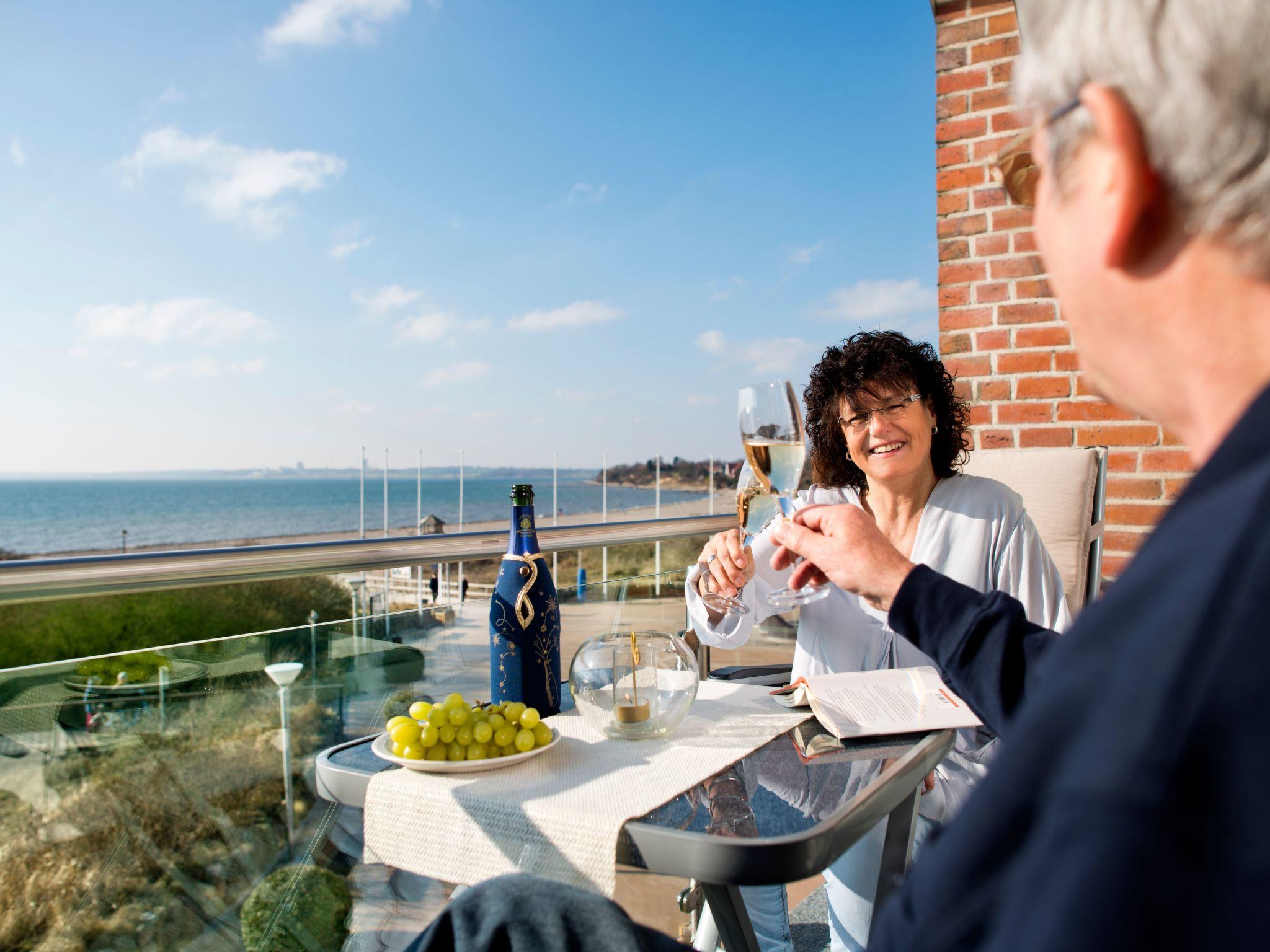 The roofed, south-facing balcony enjoys an optimal location right by the beach, affording an unforgettable panoramic sea view over the whole Lübeck bay with sunshine from the morning to the evening. In the evening and at night-time you can discover the difference between this and a typical sea view: here the horizon is not dark, but illuminated by the lights of Lübeck bay from Neustadt to Travemünde, where ships come and go. This is impressive all year round, not only in summer. The balcony has a garden table with garden chairs, as well as an electric grill. You can use a carport parking space free of charge. Pets are not allowed.