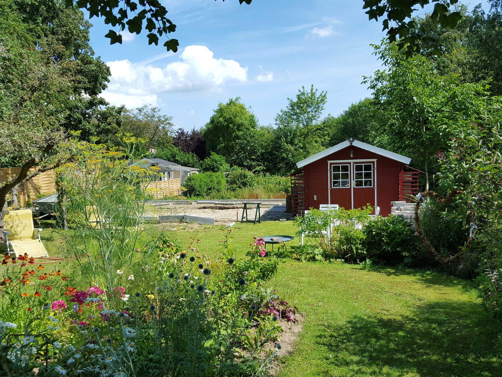 Das Wohnzimmer verfügt über ein Sofa mit Couchtisch, einen Korbsessel und SAT-TV. Die offene Einbauküche mit Herd, Backofen, Mikrowelle und natürlich Geschirrspüler liegt der Essecke gegenüber. Das Schlafzimmer mit Blick in den Garten und über die angrenzenden Felder ist mit Doppelbett, Einbaukleiderschrank und Kommode ausgestattet. Neben dem Schlafzimmer befindet sich das modere Duschbad/WC. Noch ein wichtiger Hinweis: die Deckenhöhe beträgt im Wohnzimmer und im Schlafzimmer lediglich 2 Meter!