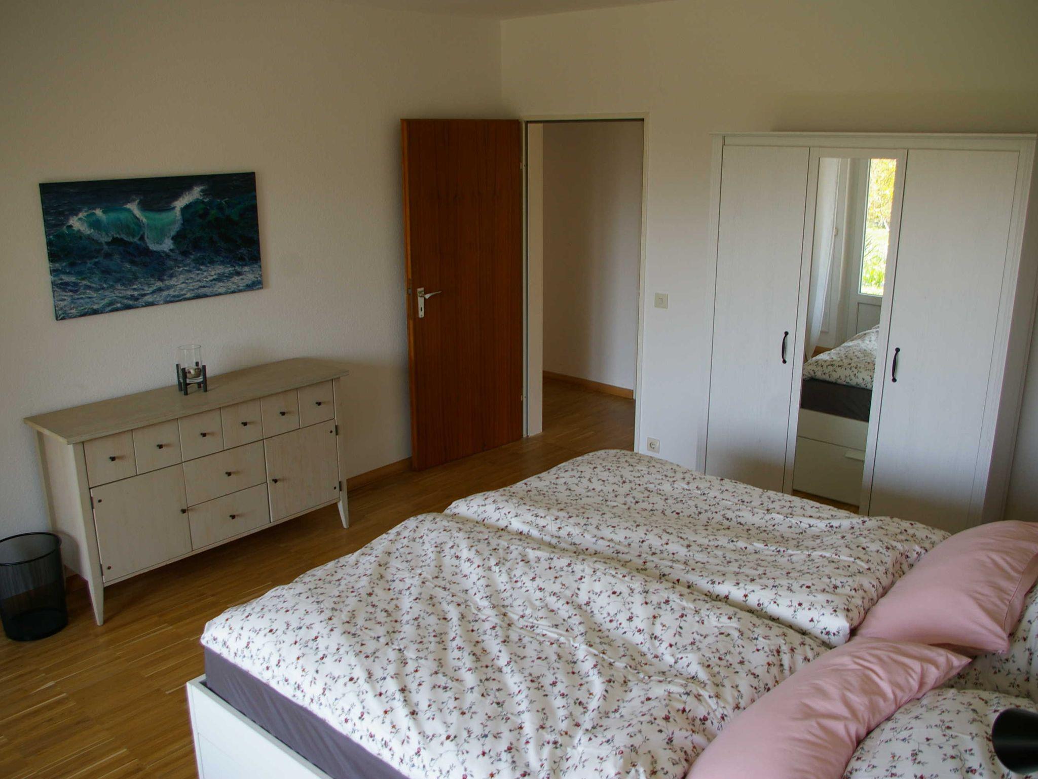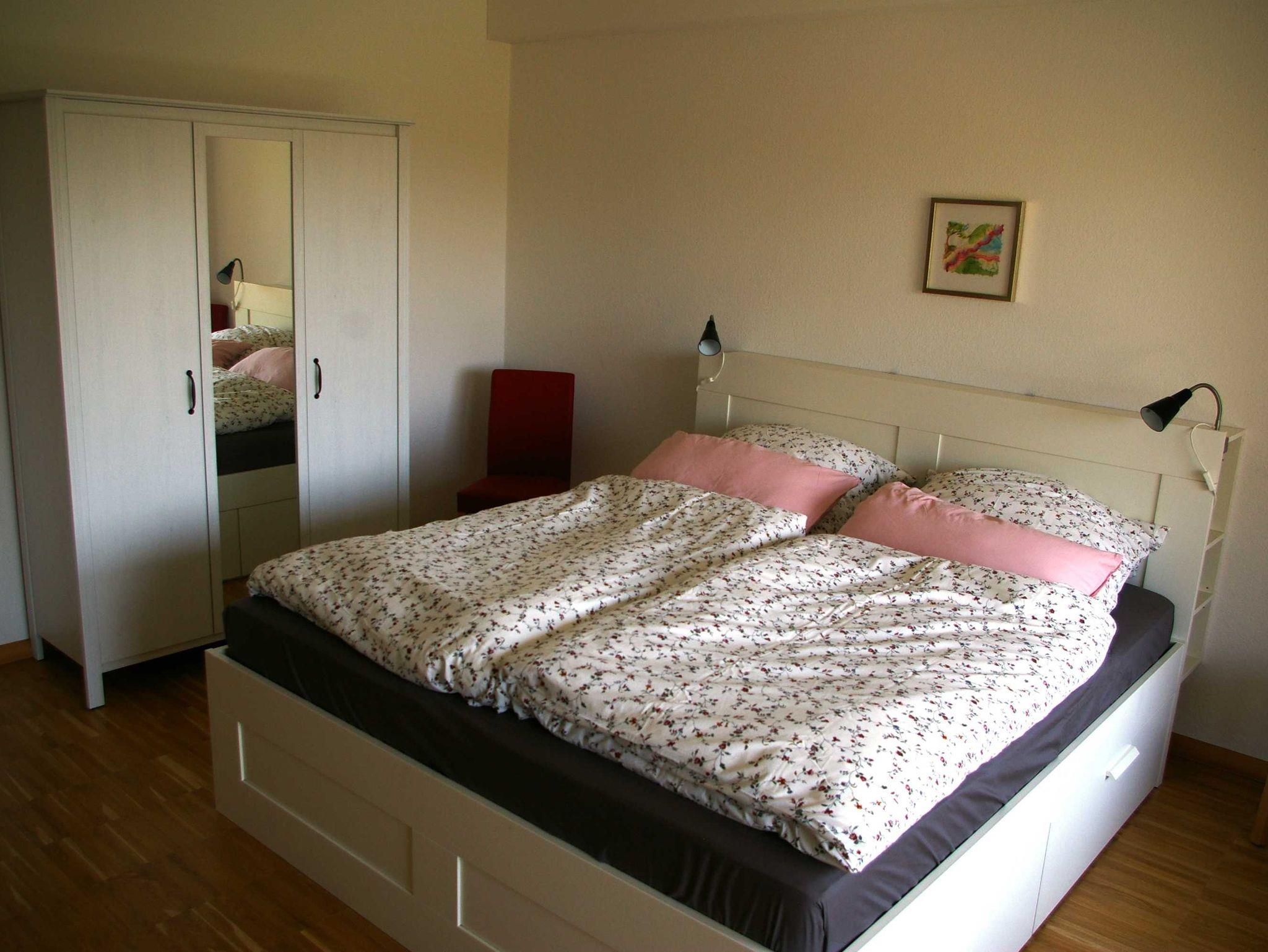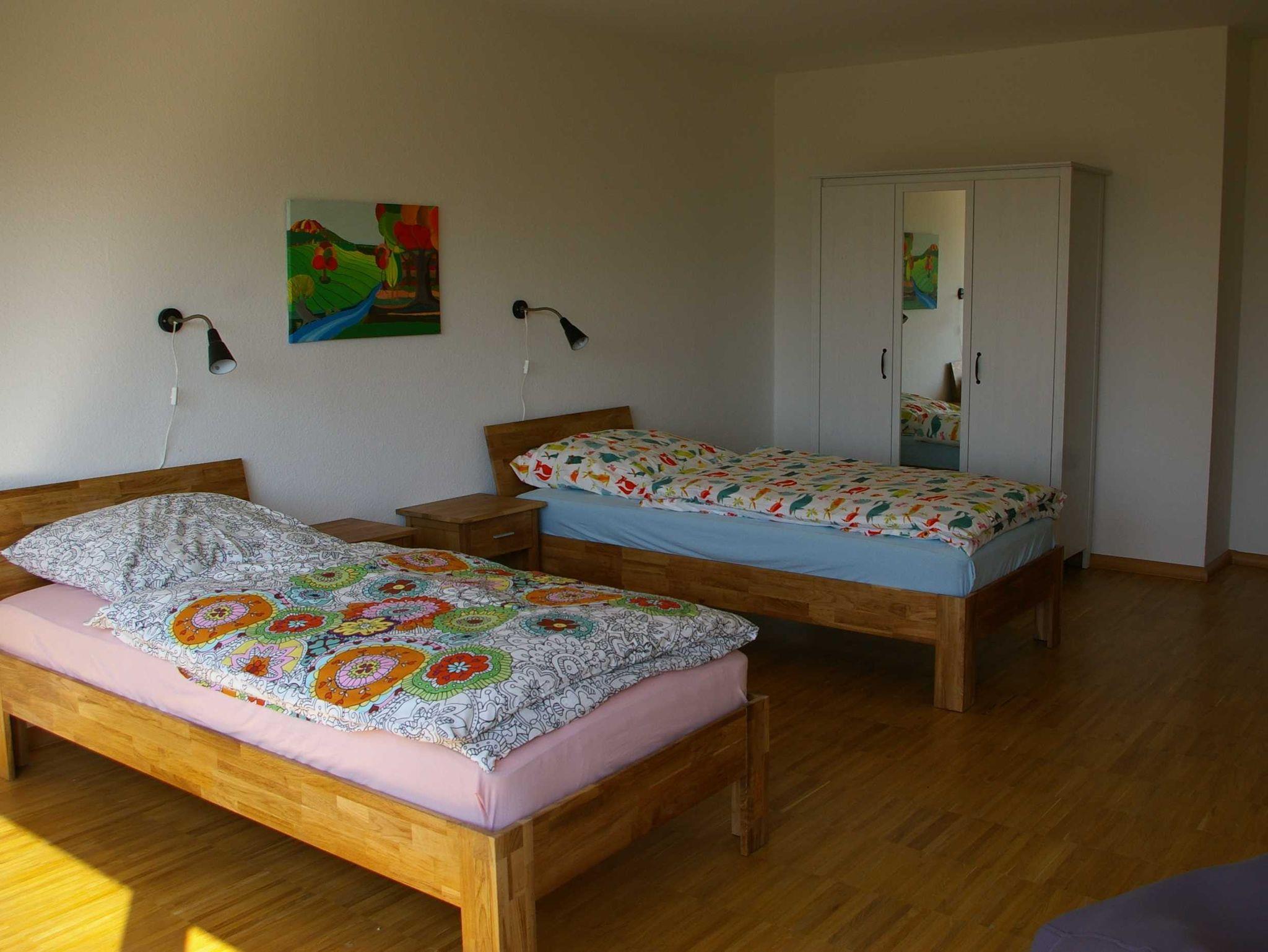 Unsere Gäste betreten die im Sockelgeschoss liegende, individuell gestaltete Wohnung über das gemeinsame Treppenhaus. Die zwei Schlafräume und das Wohnzimmer haben Parkett und jeweils einen separaten Gartenzugang. Von Wohn- und Kinderzimmer aus kann man die Ostsee sehen ? besonders in der blattlosen Zeit. Vom Elternschlafzimmer und vom Wohnzimmer gelangt man direkt auf die überdachte Terrasse mit Gartenmöbeln und Grill. Die Küche ist mit Induktionsherd, Backofen, Spülmaschine und einem Kühlschrank mit Gefrierfach ausgestattet. Der Essplatz befindet sich im Wohnzimmer. Hier stehen außerdem ein großes Sofa, der Fernseher und eine Kommode. Im Elternschlafzimmer steht ein Doppelbett (180 x 200 cm) mit Decken in Überlänge (220cm). Das Kinderzimmer verfügt über zwei Einzelbetten (90 x 200 cm), die zu einem Doppelbett (dann ohne Kinderbettwäsche) und mit Decken in Überlänge (220cm) zusammengestellt werden können. Im Kinderzimmer gibt es außerdem einen Sitzsack. Beide Schlafzimmer sind mit einem Kleiderschrank (mit Spiegeltür) ausgestattet. Das moderne Badezimmer verfügt über Doppelwaschbecken, Badewanne und ebenerdige Dusche. Die Betten sind bei Anreise bezogen. Handtücher sind bitte mitzubringen.