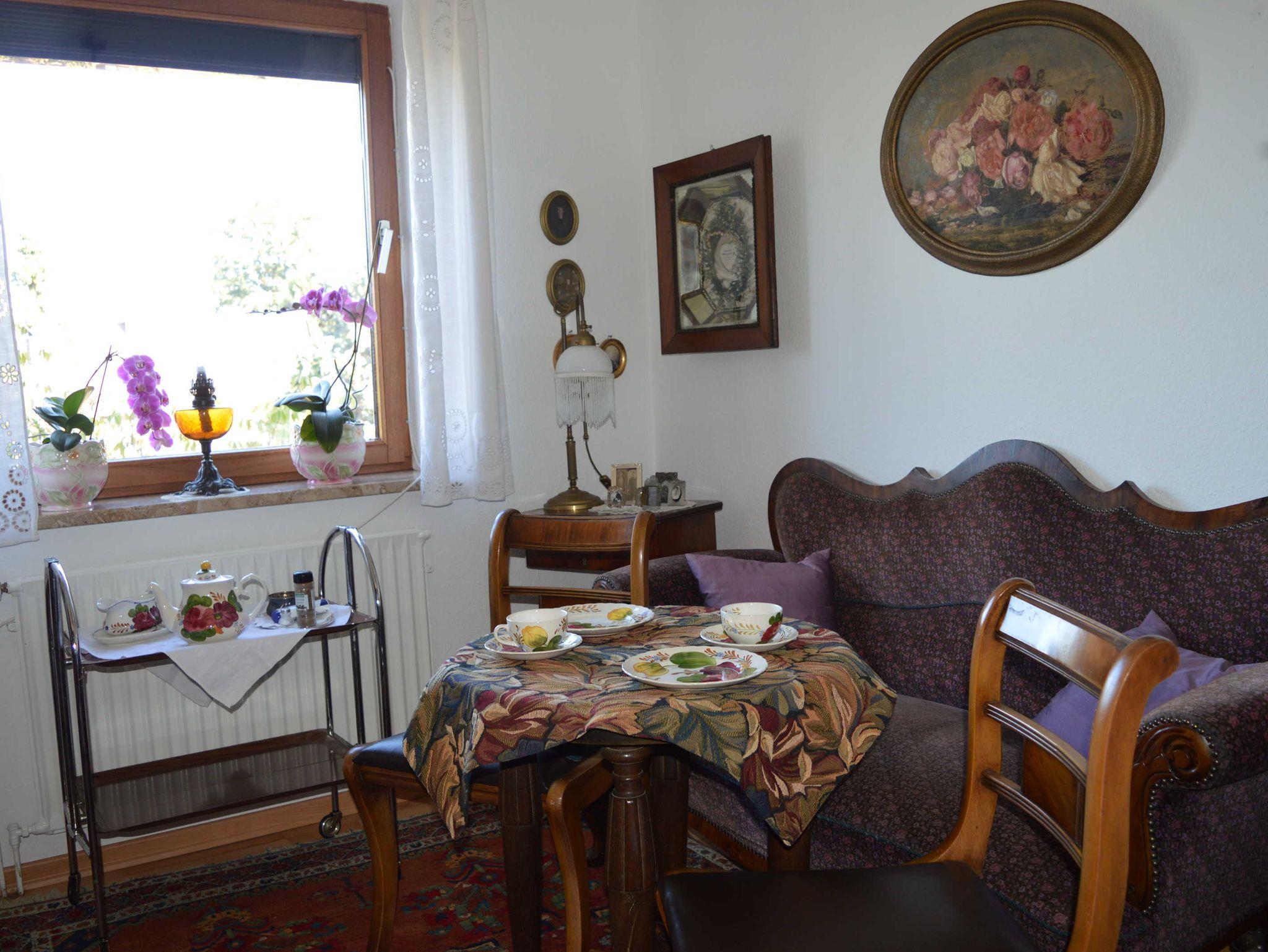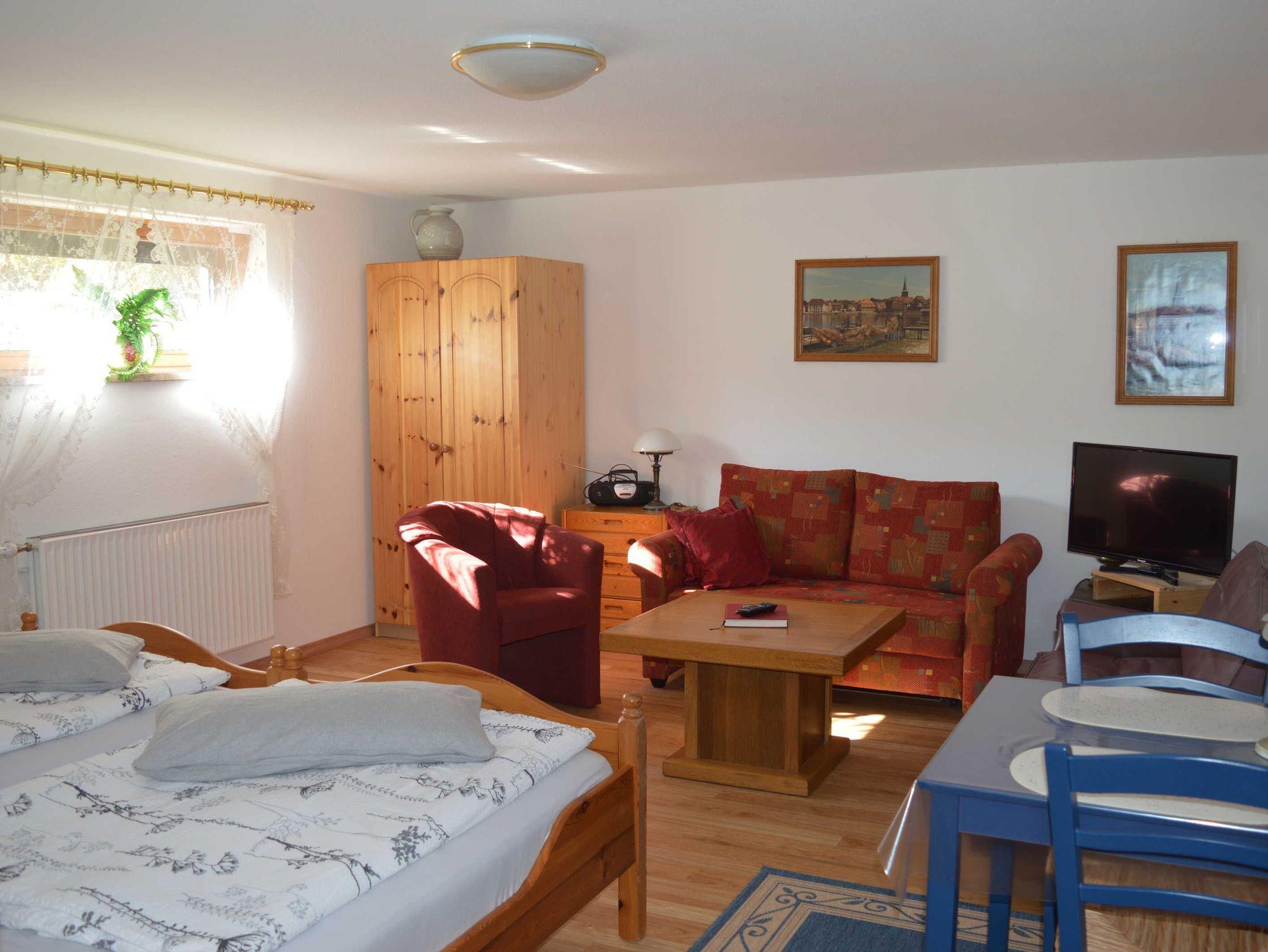 Geschmackvoll eingerichtetes Doppelzimmer im Kellergeschoss mit eigenem Eingang. Auf dem Flur vor dem Zimmer stehen ein Kühlschrank, ein Wasserkocher und eine Mikrowelle für die Gäste bereit. Das Zimmer verfügt über zwei zusammenstellbare Einzelbetten, Kleiderschrank, eine Sitzgruppe mit Schlafcouch, kleinen Esstisch, SAT-TV und Radio/CD-Player. Zum Zimmer gehört ein eigenes Duschbad mit WC auf der gleichen Etage. Das Frühstück wird im separaten Frühstückszimmer serviert. Eine zusätzliche Person kann auf der Schlafcouch übernachten.