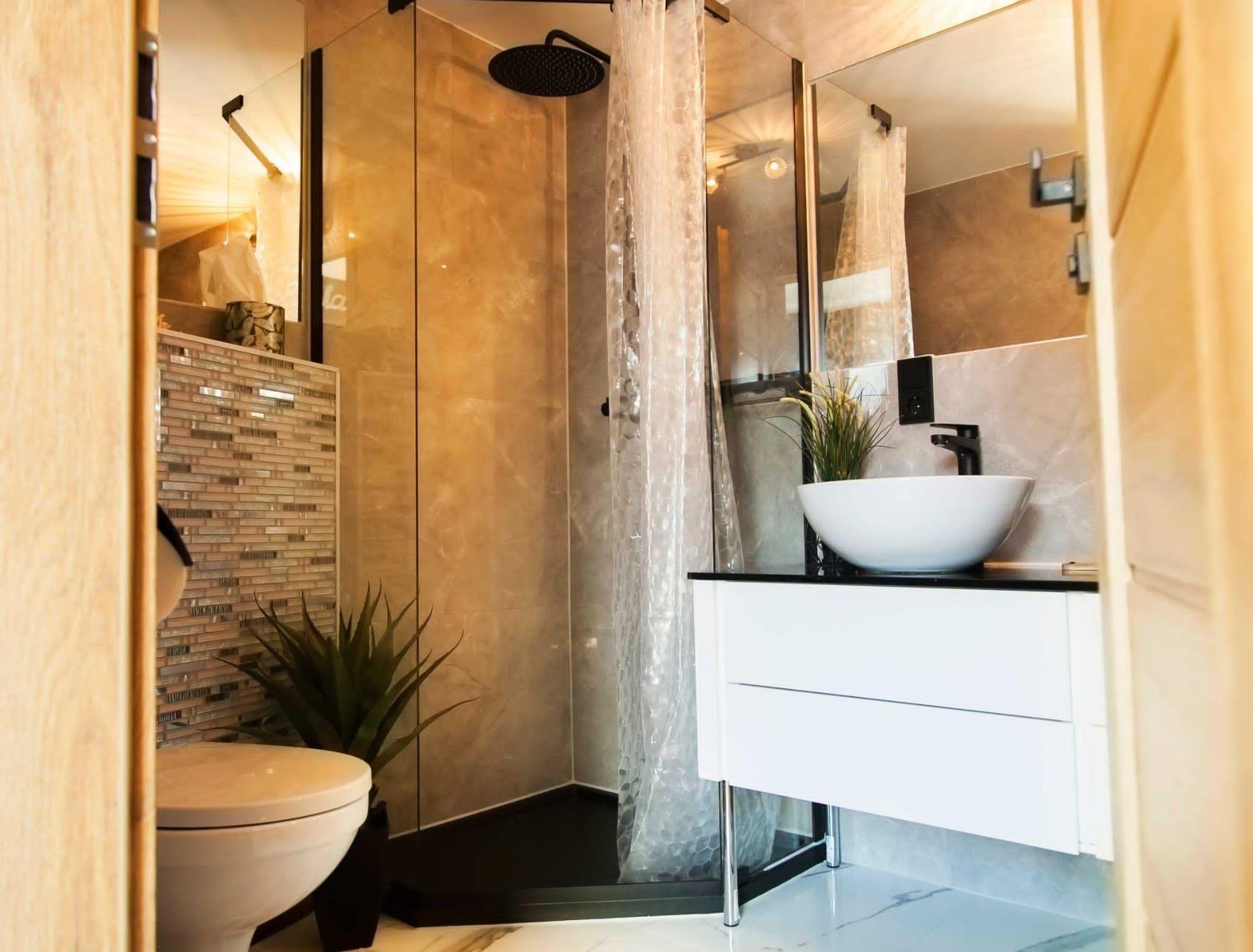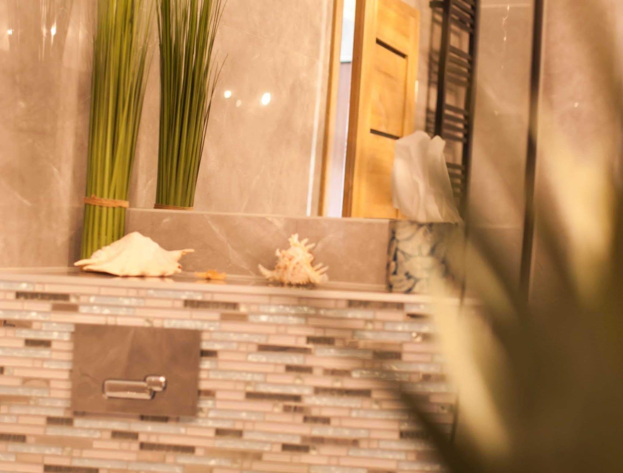 Sanitärbereich: 2 Waschbecken, Dusche, Badewanne, Toilette.