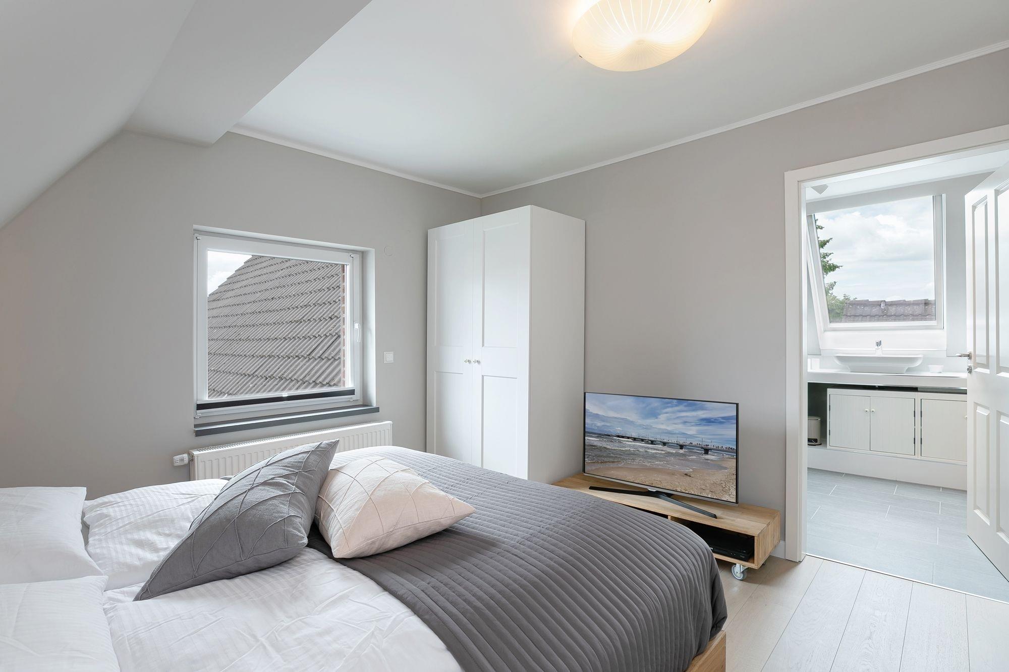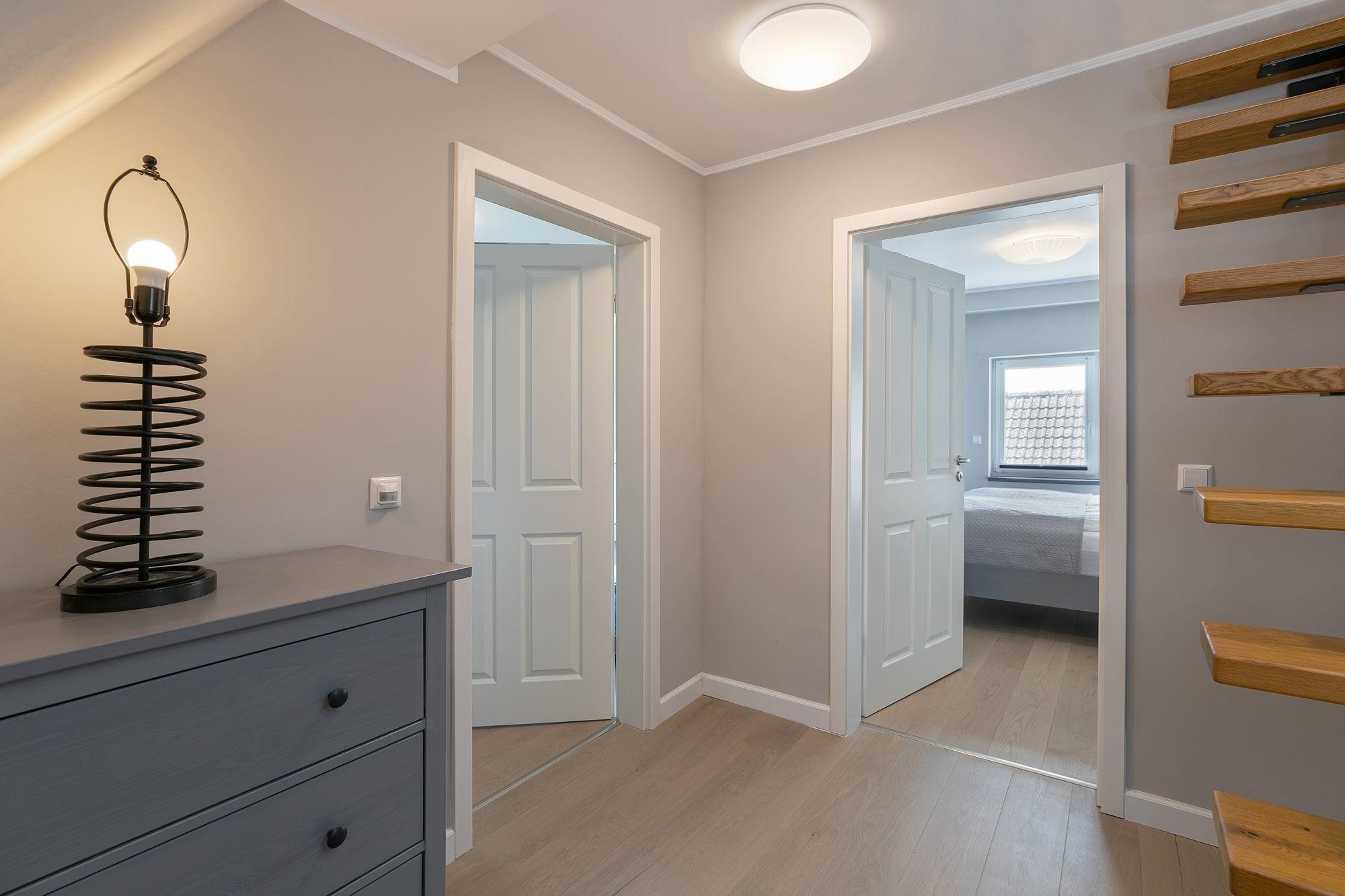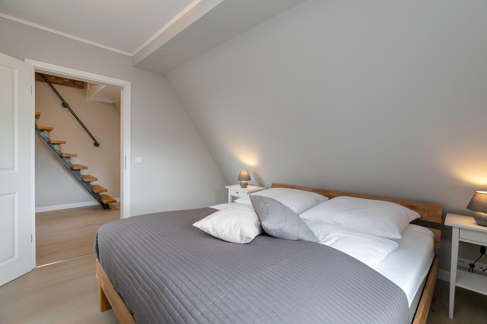 Über eine Treppe im Eingangsbereich erreichen Sie die 1. Etage. Hier befinden sich 2 separate Schlafräume: Ein Schlafzimmer mit Doppelbett (160x200 cm) und Kleiderschrank und ein weiteres Schlafzimmer mit Doppelbett (180x200 cm), Flachbildfernseher und einem weiteren Kleiderschrank. Von einem Schlafzimmer aus gelangen Sie in das separate Badezimmer mit Dusche, WC, beheizbarer Handtuchheizung und Stauraum für Ihre Badutensilien. Über eine Treppe im Flur der 1. Etage erreichen Sie den Spitzboden mit zwei getrennt stehenden Einzelbetten (je 90x200 cm), einem Nachttisch sowie einem Veluxfenster. Alle Schlafräume lassen sich zur Nacht mit elektrischen Außenrolladen angenehm verdunkeln.