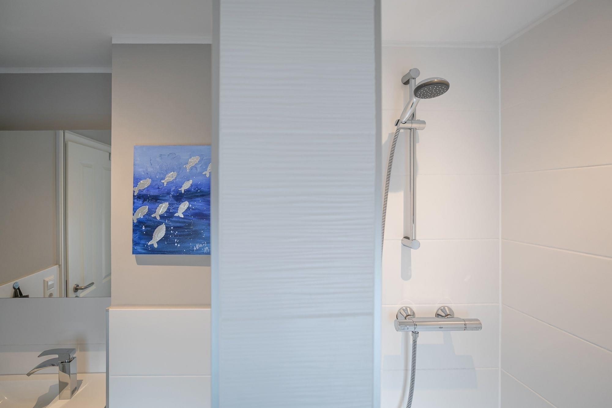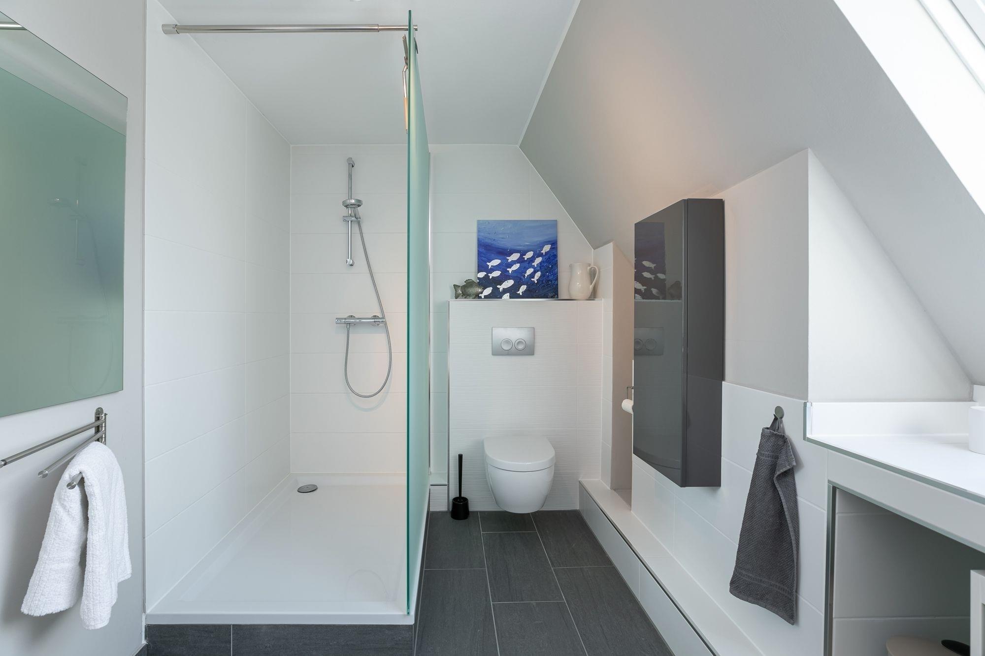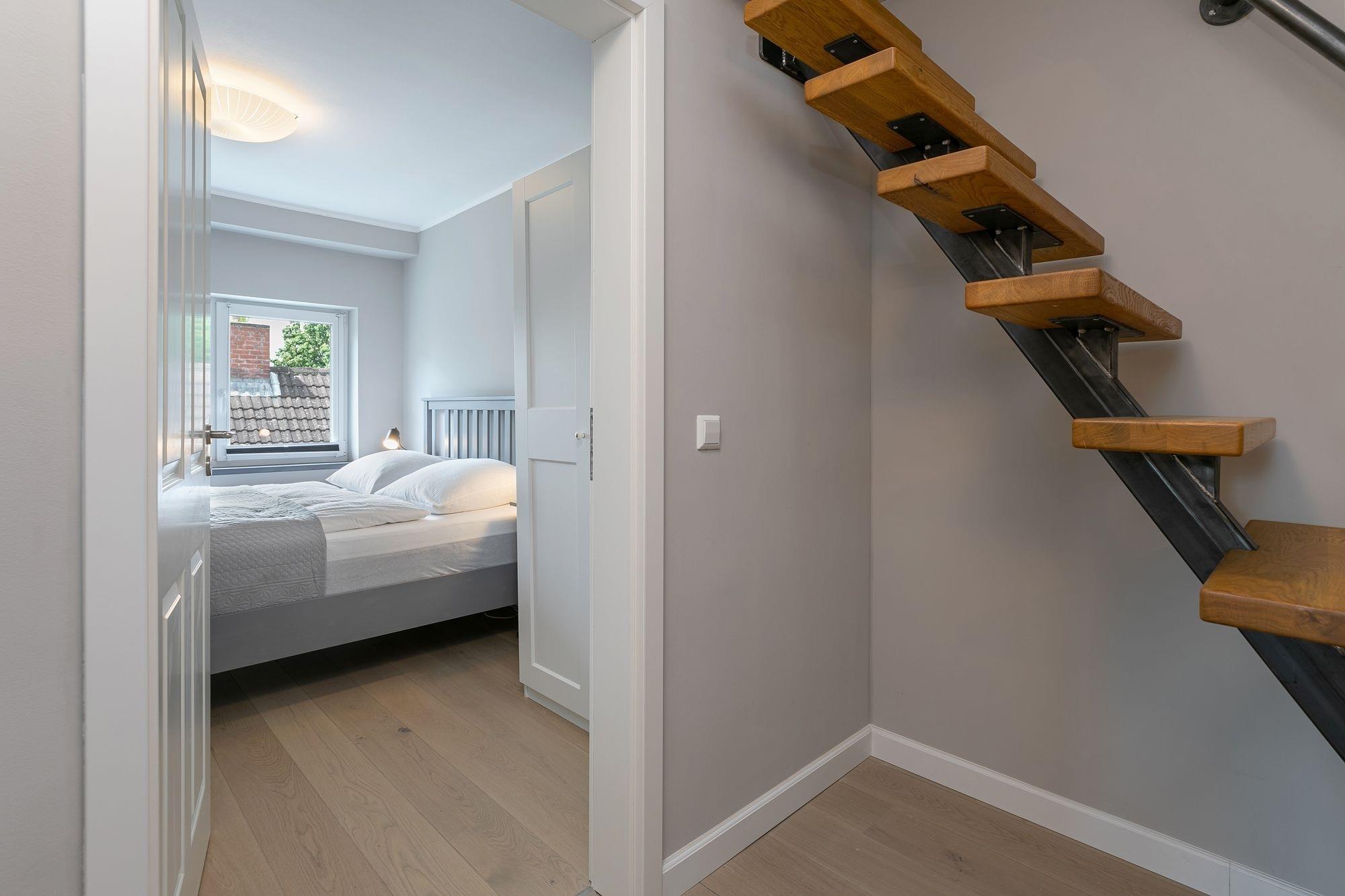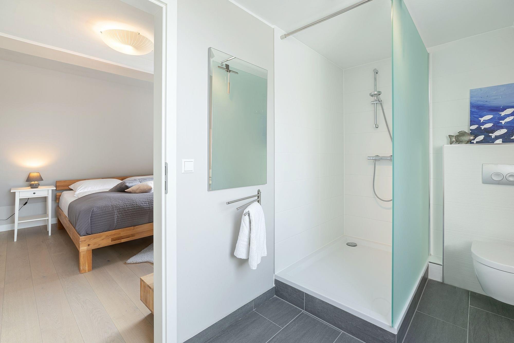Über eine Treppe im Eingangsbereich erreichen Sie die 1. Etage. Hier befinden sich 2 separate Schlafräume: Ein Schlafzimmer mit Doppelbett (160x200 cm) und Kleiderschrank und ein weiteres Schlafzimmer mit Doppelbett (180x200 cm), Flachbildfernseher und einem weiteren Kleiderschrank. Von einem Schlafzimmer aus gelangen Sie in das separate Badezimmer mit Dusche, WC, beheizbarer Handtuchheizung und Stauraum für Ihre Badutensilien. Über eine Treppe im Flur der 1. Etage erreichen Sie den Spitzboden mit zwei getrennt stehenden Einzelbetten (je 90x200 cm), einem Nachttisch sowie einem Veluxfenster. Alle Schlafräume lassen sich zur Nacht mit elektrischen Außenrolladen angenehm verdunkeln.