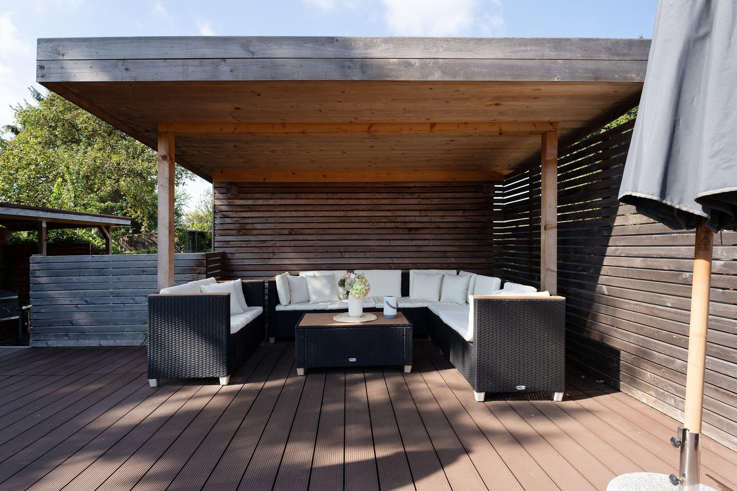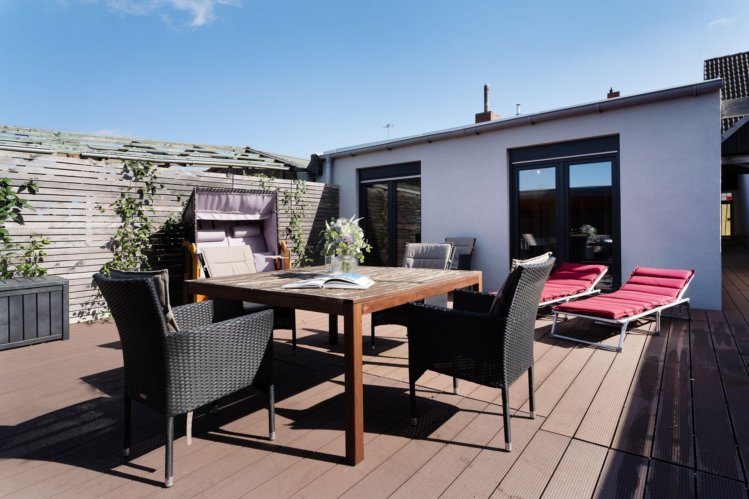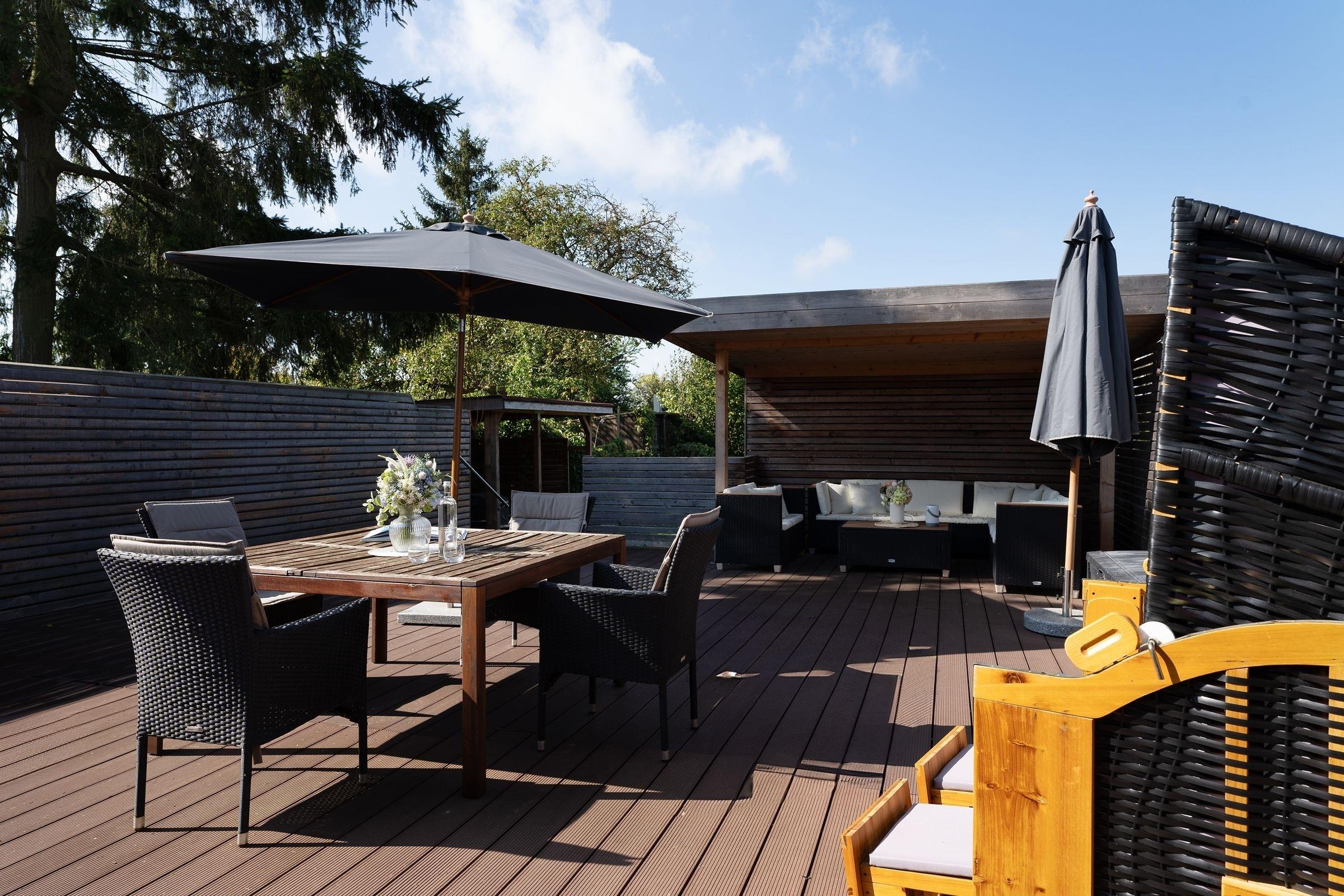 Die große Holzterrasse mit Gartenmöbeln, Sonnenschirm, Strandkorb sowie exklusiven Lounge-Möbeln ist das absolute Highlight dieser wunderschönen Ferienunterkunft und der perfekte Ort, um einen ereignisreichen Urlaubstag mit einem Glas Wein ausklingen zu lassen. Über wenige Stufen von der Terrasse hinab erreichen Sie den eigenen Garten, der zu genussvollen Grillabenden einlädt.