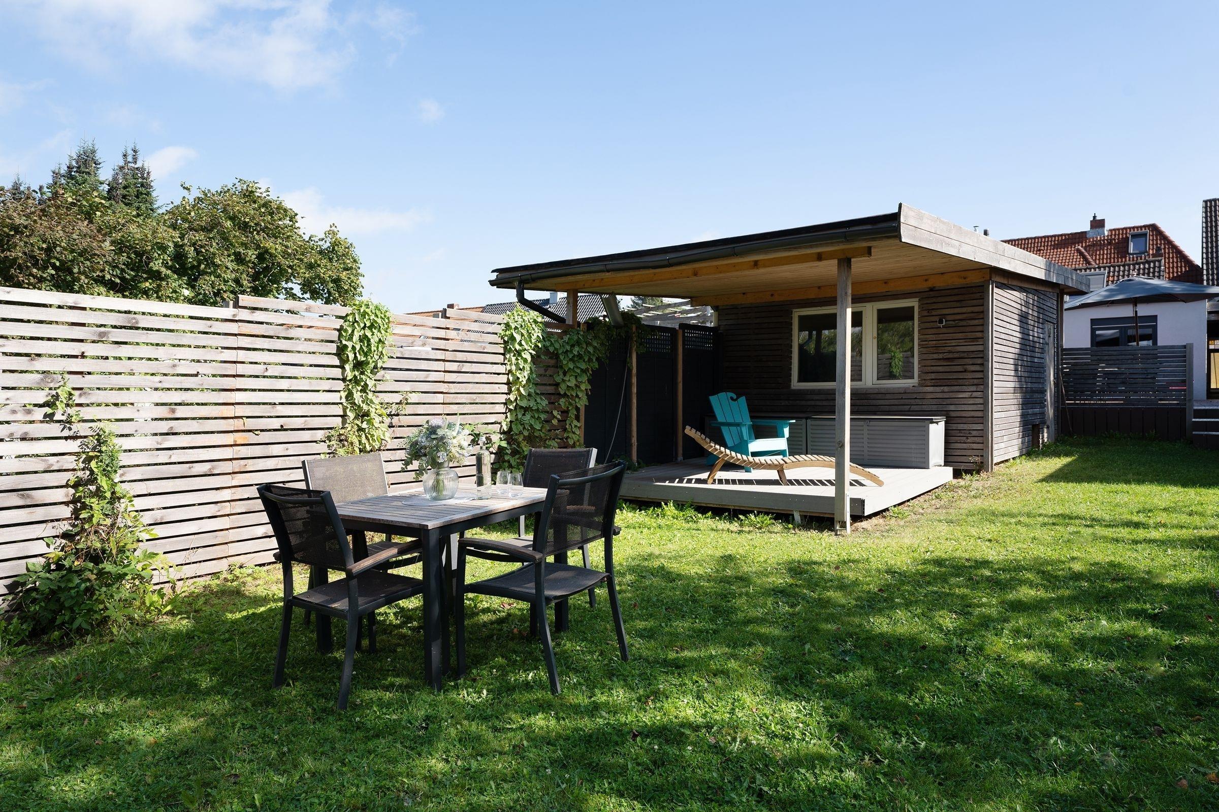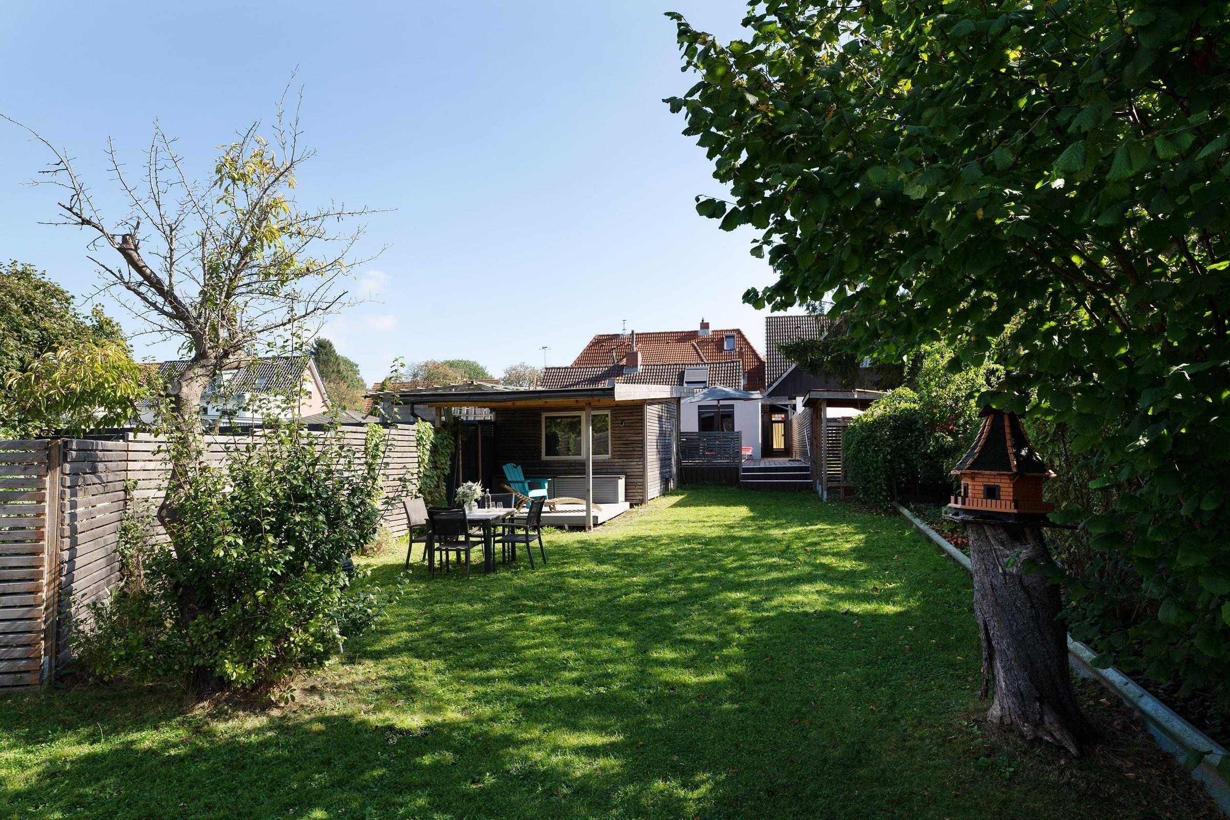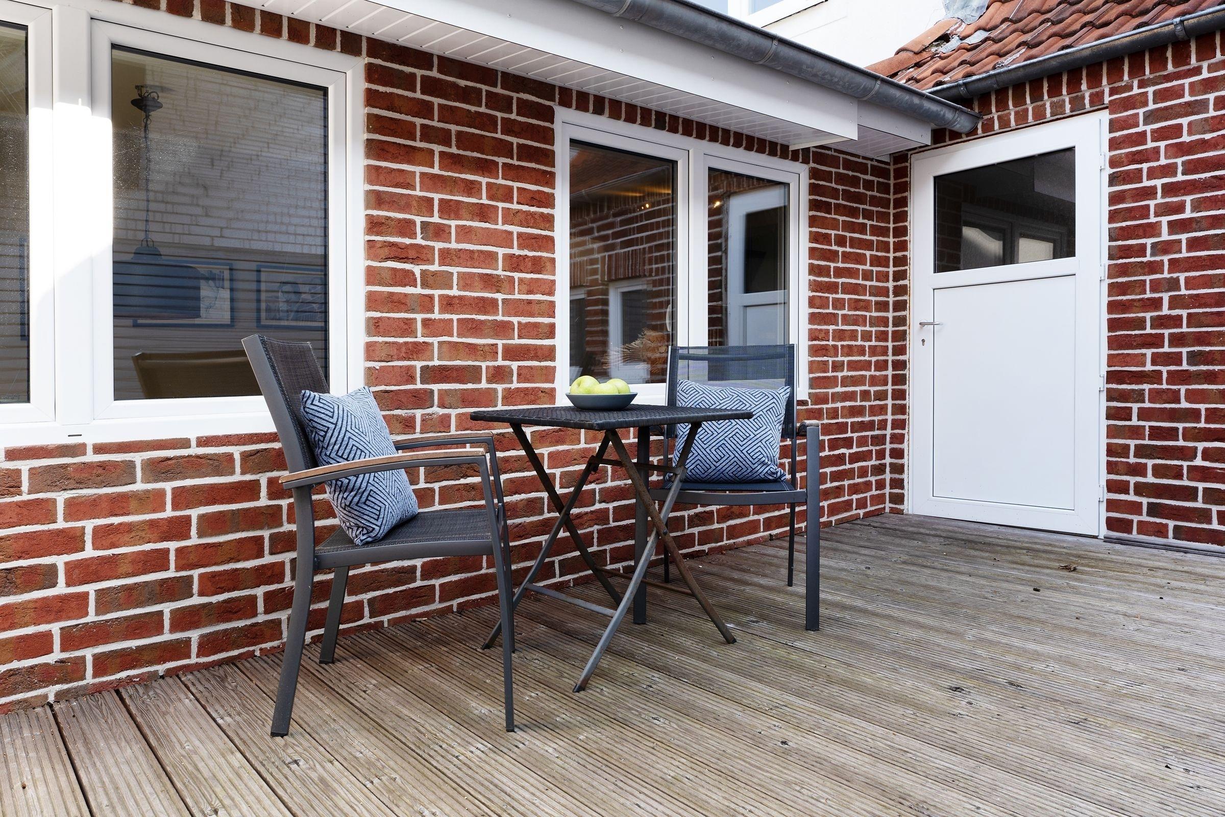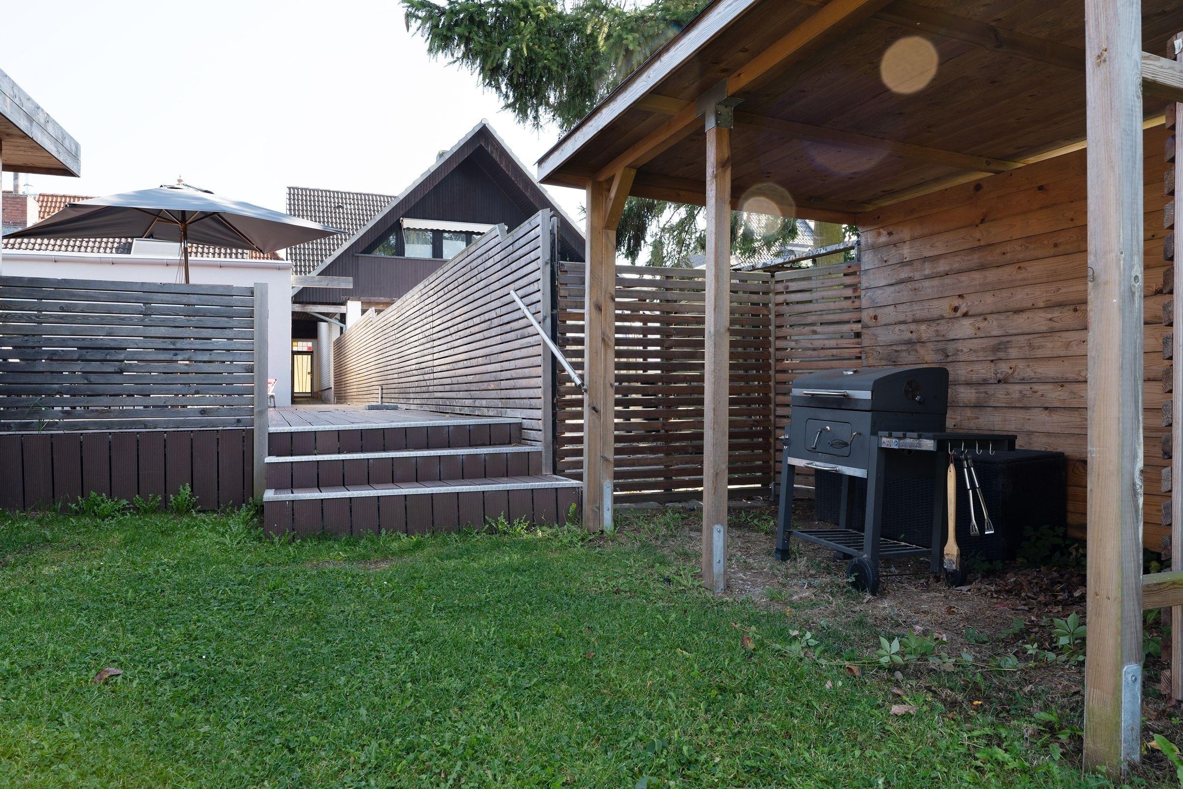 Die große Holzterrasse mit Gartenmöbeln, Sonnenschirm, Strandkorb sowie exklusiven Lounge-Möbeln ist das absolute Highlight dieser wunderschönen Ferienunterkunft und der perfekte Ort, um einen ereignisreichen Urlaubstag mit einem Glas Wein ausklingen zu lassen. Über wenige Stufen von der Terrasse hinab erreichen Sie den eigenen Garten, der zu genussvollen Grillabenden einlädt.