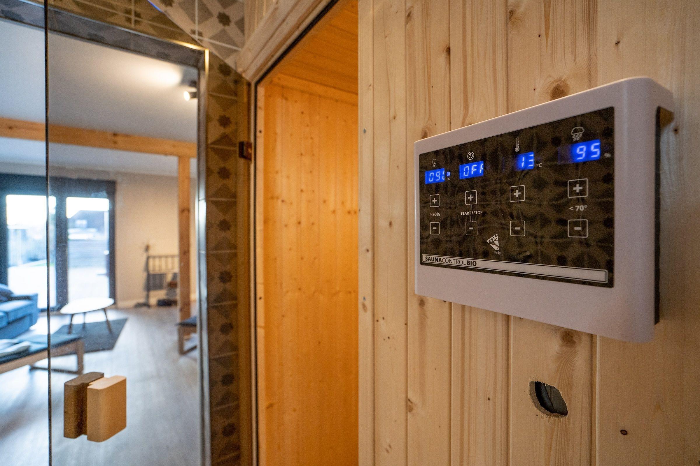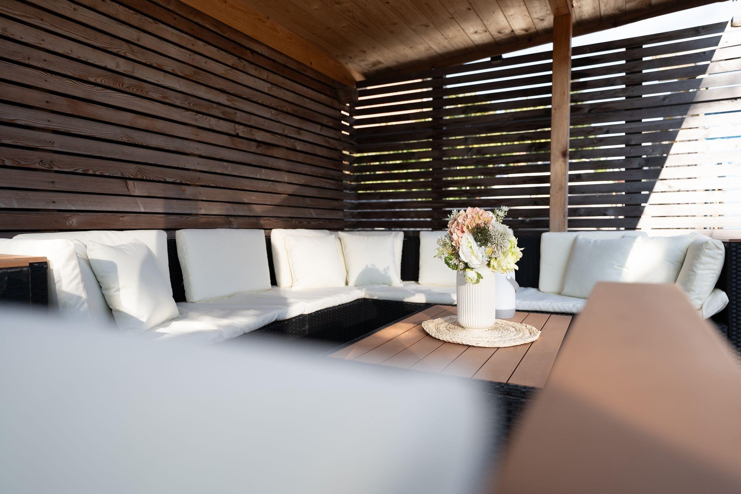 Wellness pur! Genießen und entspannen Sie im großzügigen Wellnessbereich mit eigener Sauna und Dusche (inklusive). Hochwertige Liegen laden zum Entspannen nach dem Saunagang ein und dank direktem Zugang zur Terrasse können Sie sich im Winter sogar draußen abkühlen.