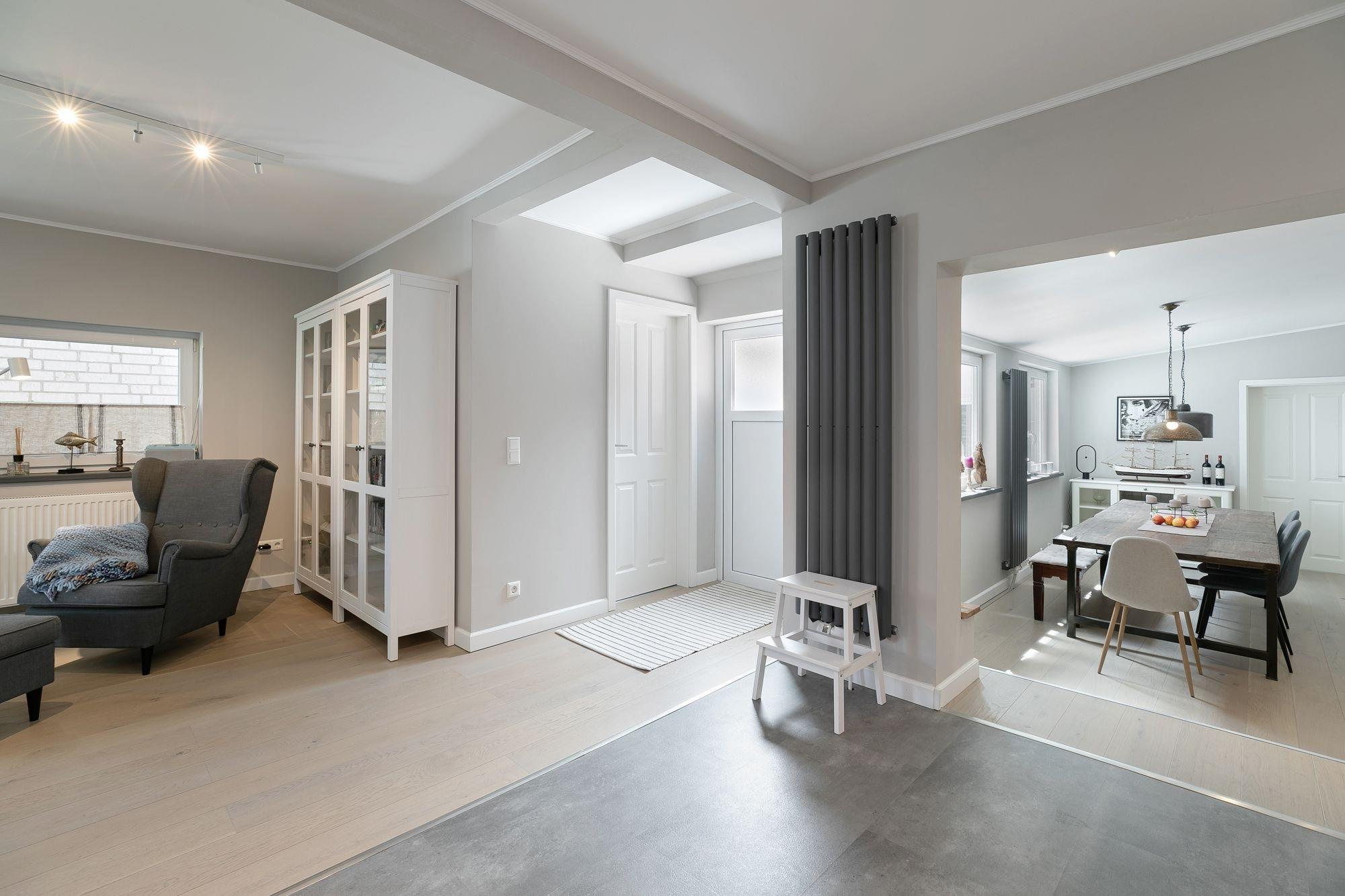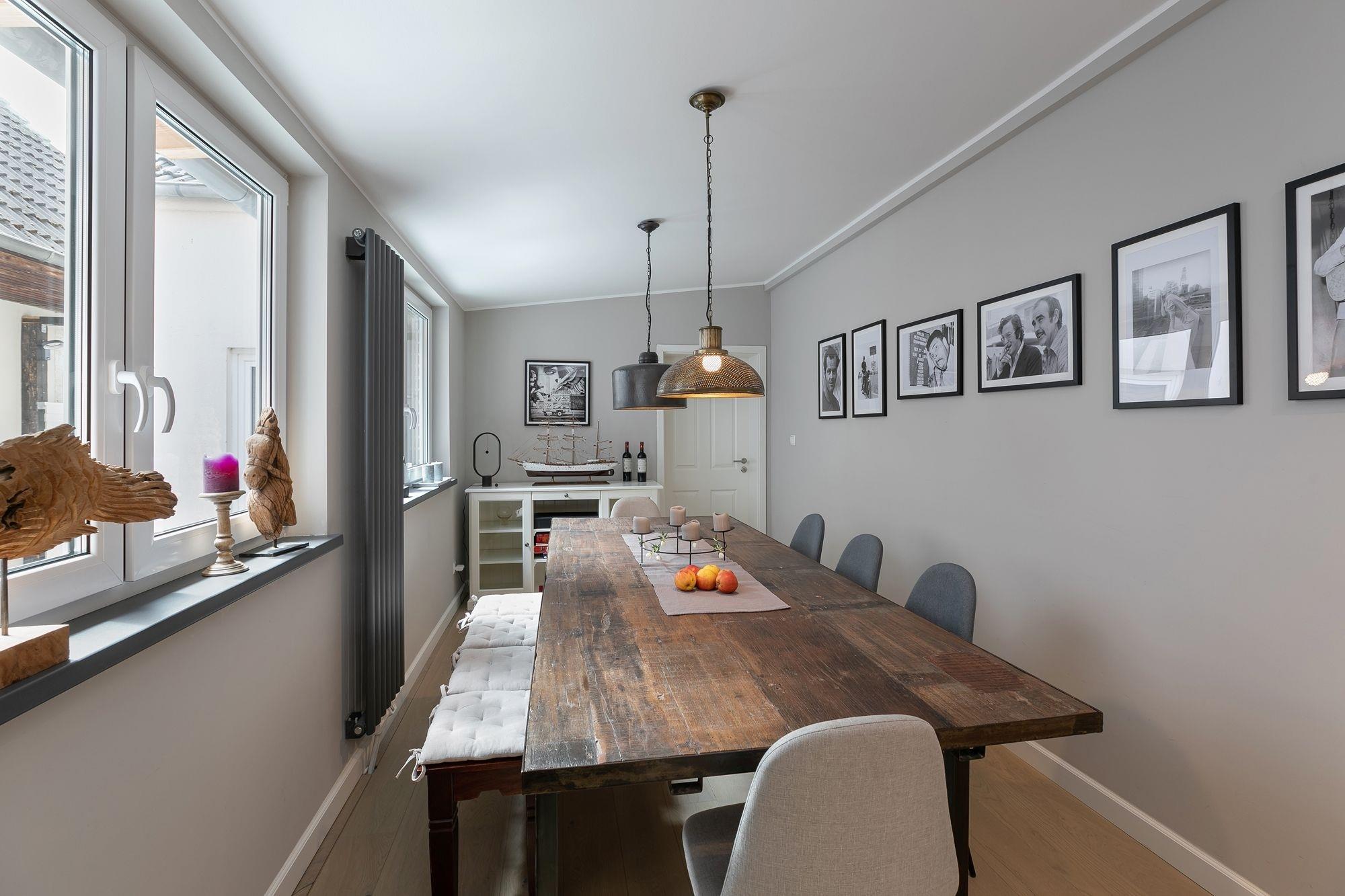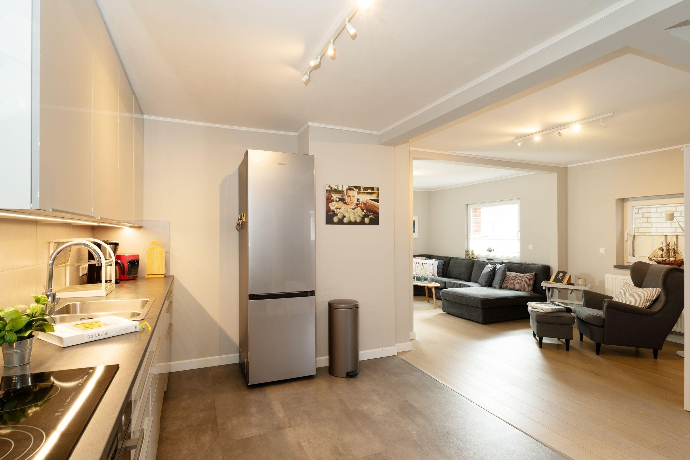 Das Haus befindet sich in zentraler Lage von Neustadt und ist sowohl stadt- als auch strandnah gelegen. Auf 3 Etagen erwartet Sie eine moderne Einrichtung, eine geschickte Raumaufteilung und viel Platz, um sich zu erholen. Legen Sie Ihre Garderobe im Flur ab und betreten Sie den stilvoll eingerichteten, geräumigen Wohnbereich mit offener Küche. Das große Sofa in U-Form bietet genügend Platz für alle Mitreisenden und lädt zu gemeinsamen Spiele- oder TV-Abenden ein. Auf dem Sessel mit Fußhocker können Sie gemütlich ein gutes Buch lesen. Die angrenzende Küche z. B. mit Backofen, Cerankochfeld, Geschirrspülmaschine und freistehendem Kühlschrank steht Ihnen zur Verfügung, wenn Sie abends das Urlaubsmenü zaubern möchten. Vom Küchenbereich aus gelangen Sie über 2 Stufen in das offene Esszimmer mit großem Tisch und genügend Platz für Familie und Freunde. Weiterhin befindet sich im Erdgeschoss ein kleines Badezimmer mit WC und Dusche.