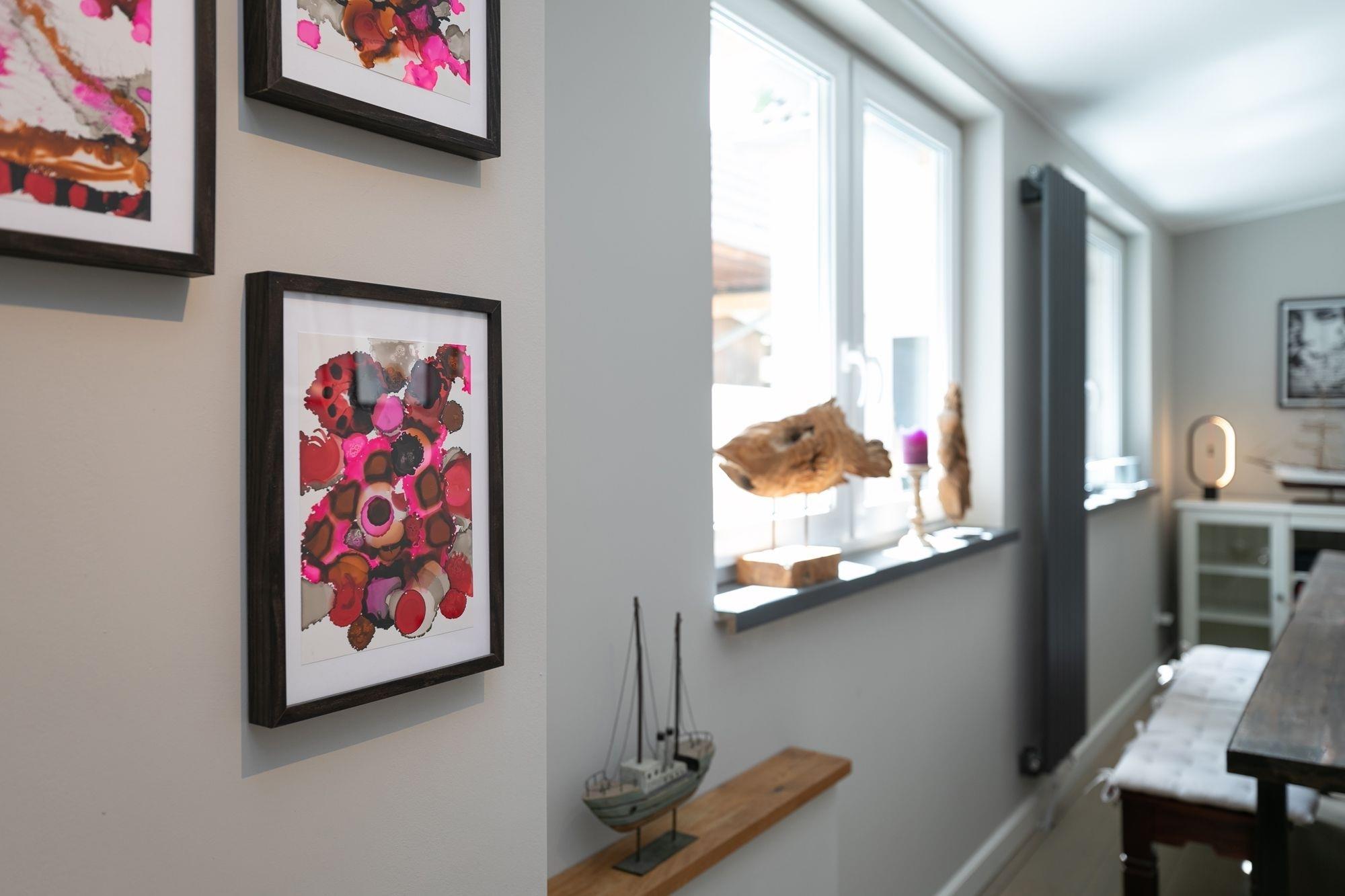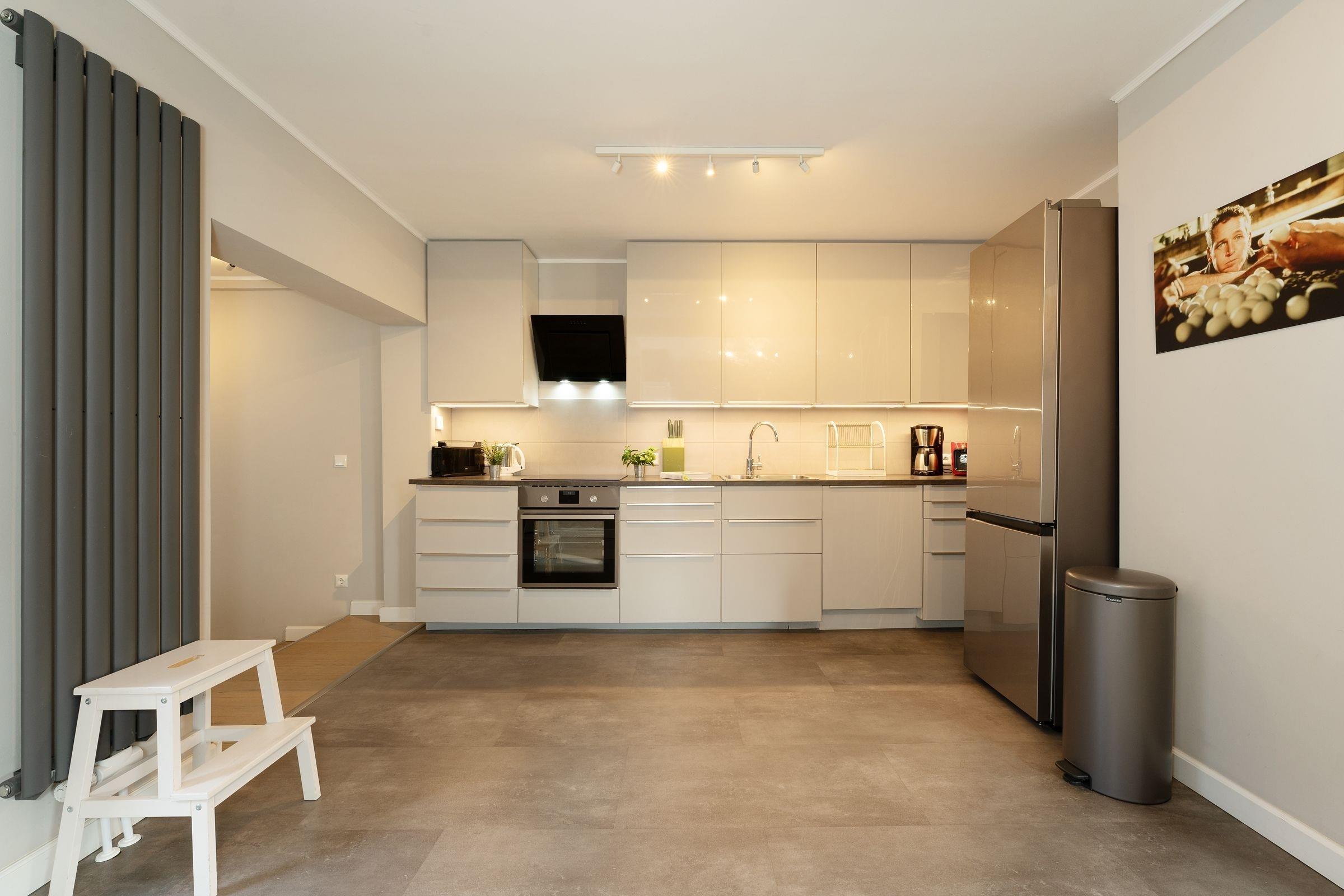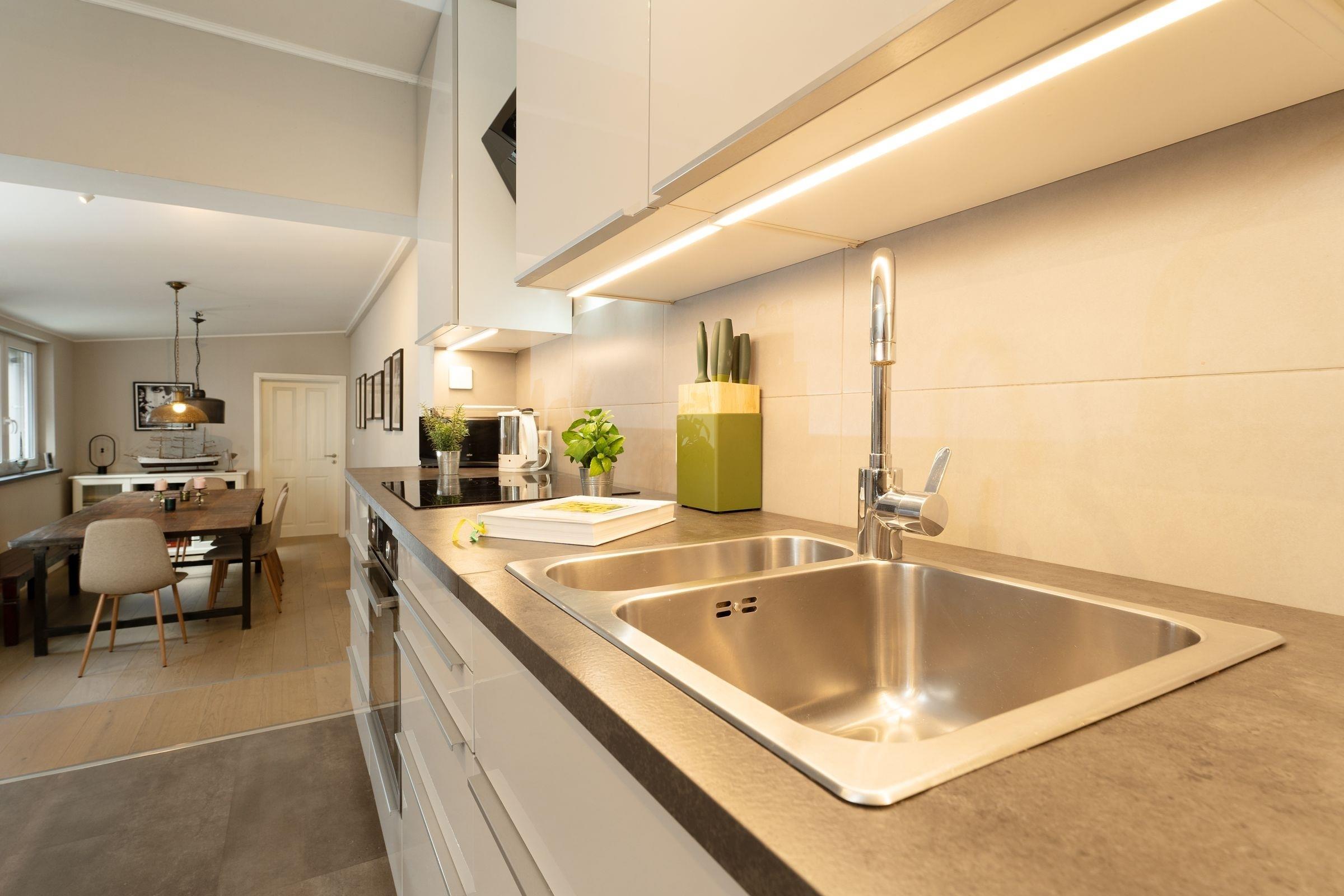 Das Haus befindet sich in zentraler Lage von Neustadt und ist sowohl stadt- als auch strandnah gelegen. Auf 3 Etagen erwartet Sie eine moderne Einrichtung, eine geschickte Raumaufteilung und viel Platz, um sich zu erholen. Legen Sie Ihre Garderobe im Flur ab und betreten Sie den stilvoll eingerichteten, geräumigen Wohnbereich mit offener Küche. Das große Sofa in U-Form bietet genügend Platz für alle Mitreisenden und lädt zu gemeinsamen Spiele- oder TV-Abenden ein. Auf dem Sessel mit Fußhocker können Sie gemütlich ein gutes Buch lesen. Die angrenzende Küche z. B. mit Backofen, Cerankochfeld, Geschirrspülmaschine und freistehendem Kühlschrank steht Ihnen zur Verfügung, wenn Sie abends das Urlaubsmenü zaubern möchten. Vom Küchenbereich aus gelangen Sie über 2 Stufen in das offene Esszimmer mit großem Tisch und genügend Platz für Familie und Freunde. Weiterhin befindet sich im Erdgeschoss ein kleines Badezimmer mit WC und Dusche.