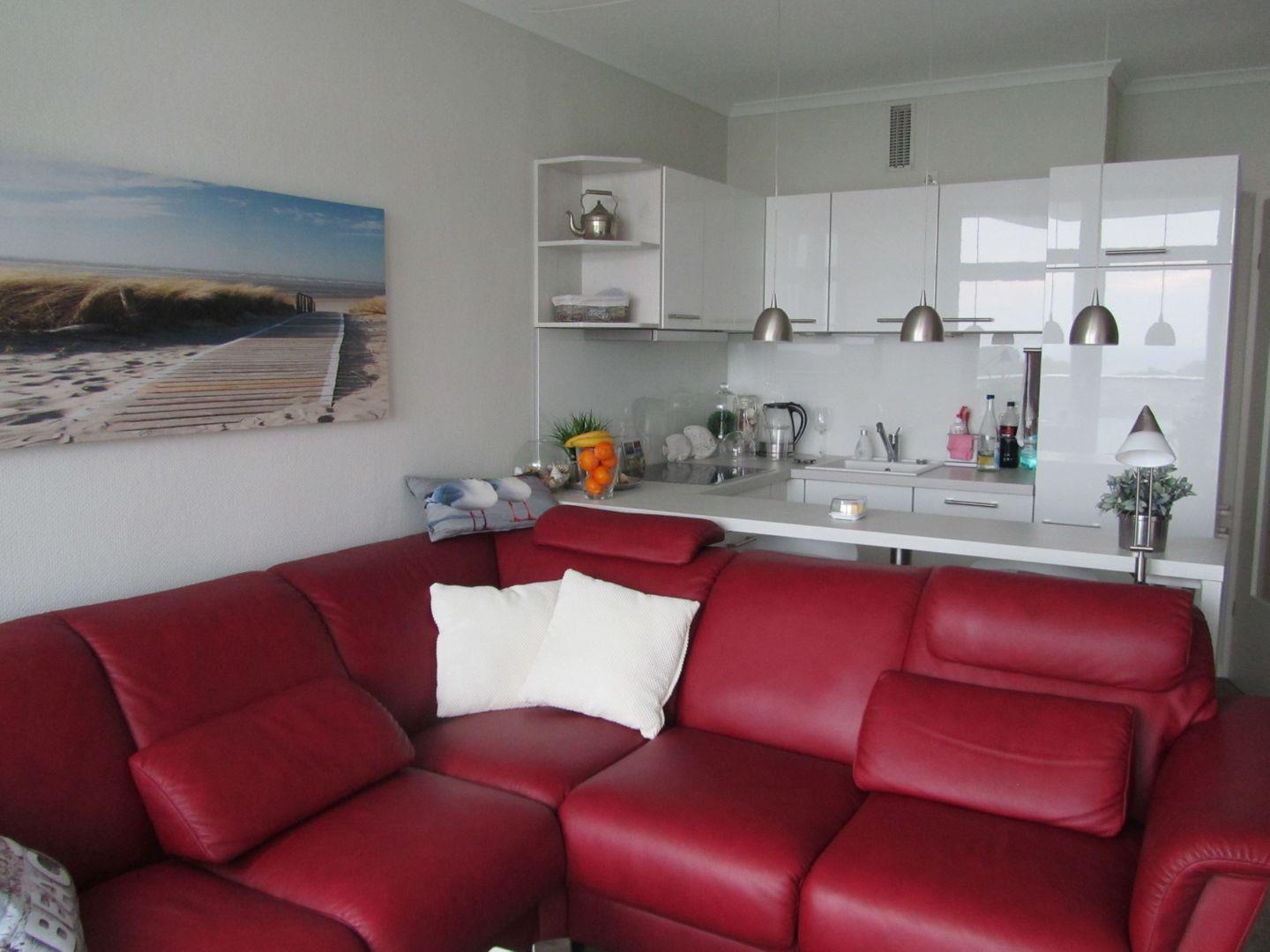 Die offene Küche ist mit allem ausgestattet, was man braucht: Spülmaschine, Ceranfeld, Kühlschrank sowie eine Mikrowelle mit Backfunktion und ein kleiner Gefrierschrank (beide in der praktischen Kammer neben dem Flur). Ein Esstresen mit Meerblick lädt zum Frühstücken ein – und am Abend genießen Sie Ihr Dinner stimmungsvoll am Esstisch mit Kerzenschein.
