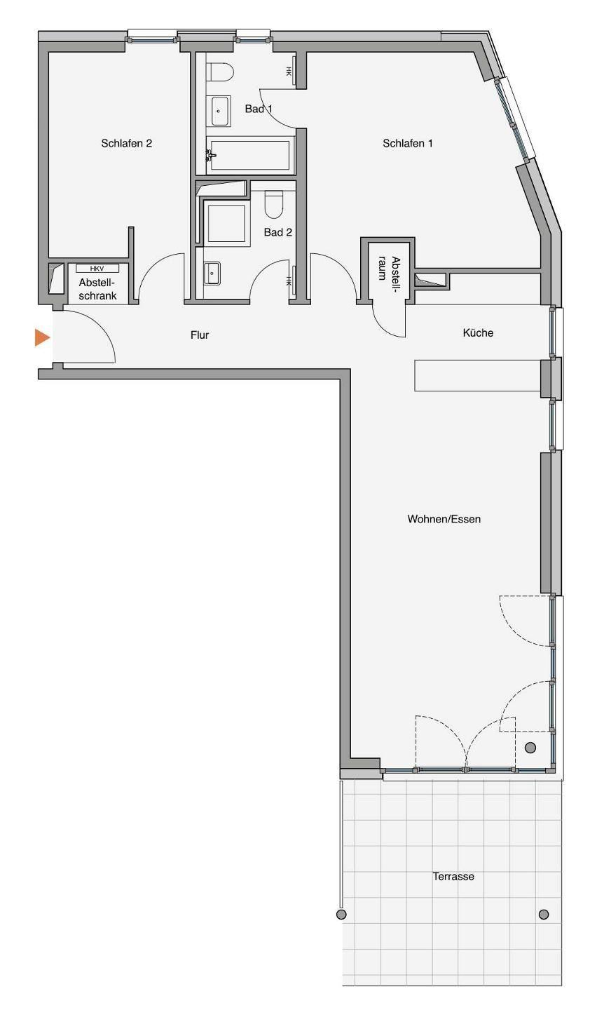Das geräumige offene Wohnzimmer mit Essbereich und offener, voll ausgestatteter Küche bildet den Mittelpunkt der Wohnung. Im Flur und in der Küche finden Sie ausreichend Stauraum durch einen Einbauschrank und eine Abstellkammer. Zwei Schlafzimmer für je zwei Personen sowie zwei Bäder (eines mit Dusche und eines mit Badewanne) garantieren maximalen Komfort.