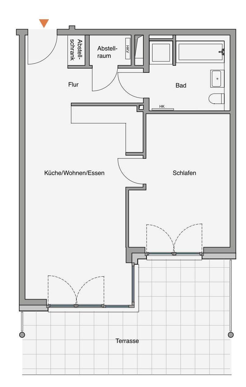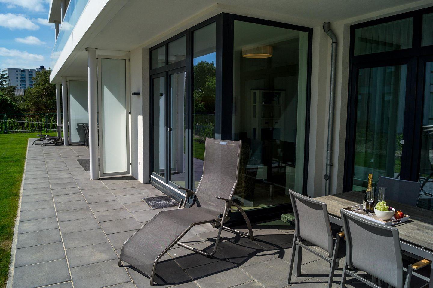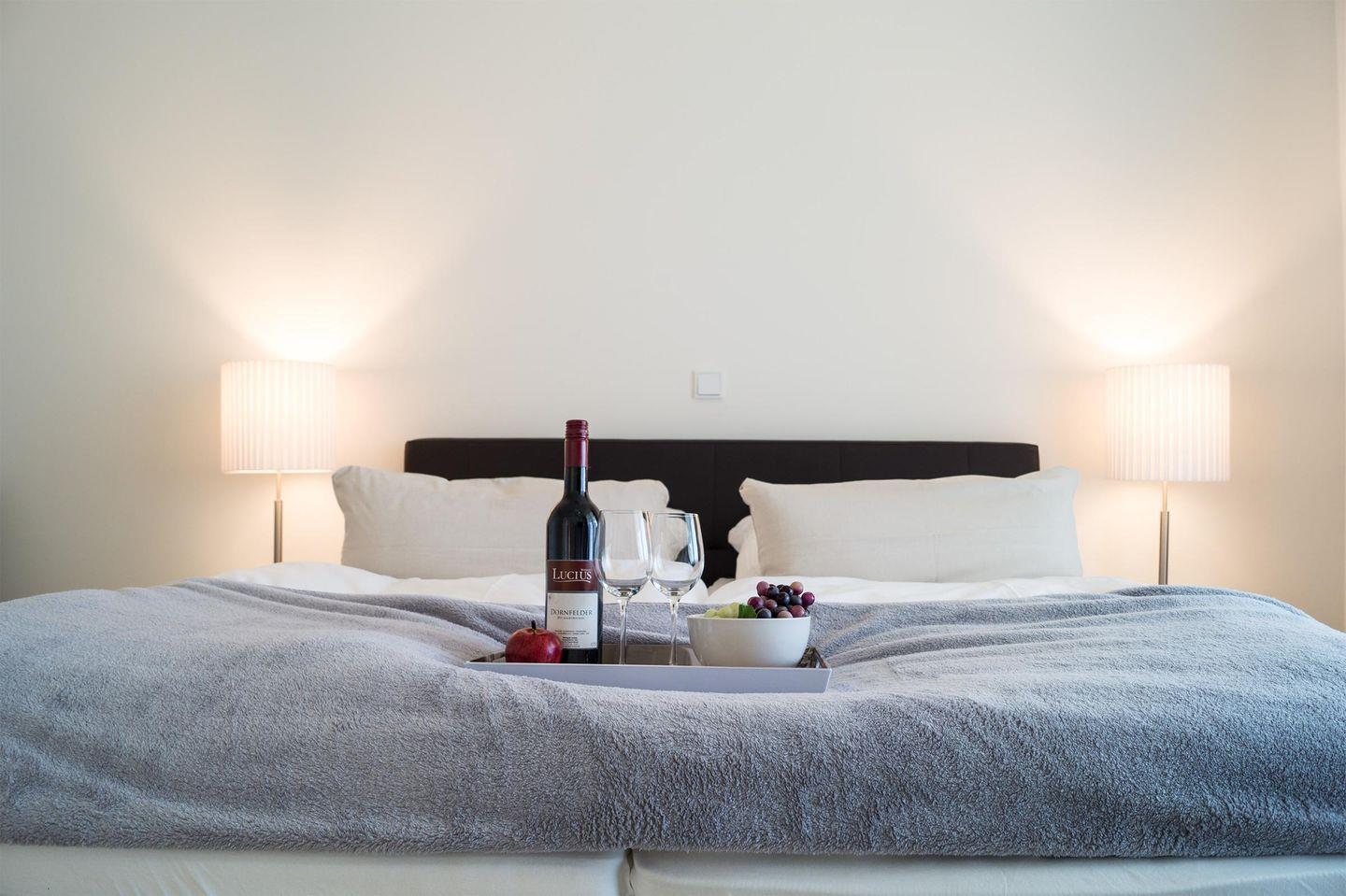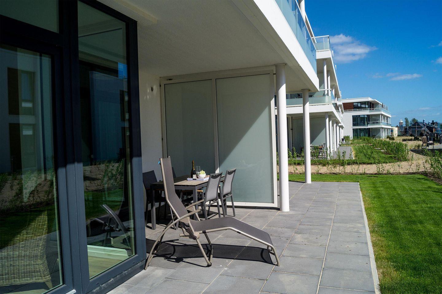 Der helle kombinierte Wohn-/Essraum verfügt über eine komplett ausgestattete offene Küche und bildet das Herzstück der Wohnung. Die geschützte Terrasse ist ebenerdig vom Schlaf- sowie vom Wohnzimmer aus erreichbar. Das Schlafzimmer ist mit einem gemütlichen Boxspring-Doppelbett, einem großen Kleiderschrank und einem Fernseher ausgestattet. Für Entspannung sorgt das geräumige Badezimmer mit Badewanne und Dusche.
