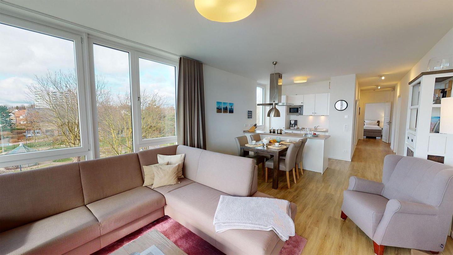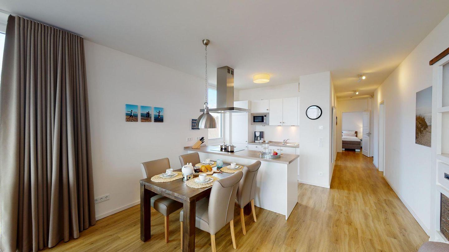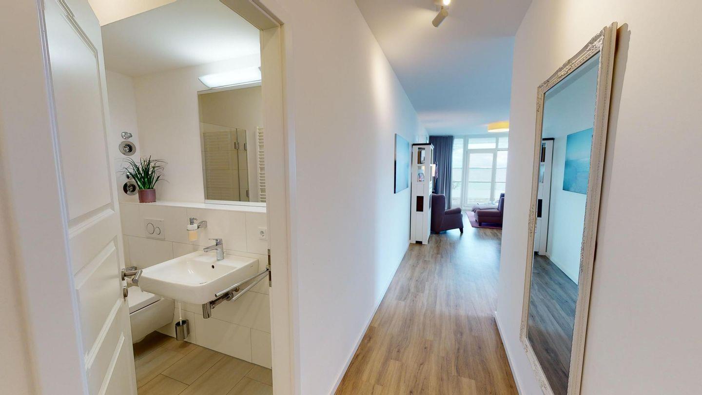 Weiter über den Flur gelangen sie rechterhand in das zweite, etwas kleinere Schlafzimmer auch mit einem Boxspring-Doppelbett und einen Kleiderschrank ausgestattet. Linkerhand vom Flur, führt Sie Ihr Weg in das zweite Badezimmer, dies mit einer fast bodengleichen Dusche. Am Ende des Flurs erreichen Sie das Herzstück des Apartments, den großzügigen Wohnbereich. Ausgestattet mit einer schönen, offenen Einbauküche, einem einladenden Essbereich und einer gemütlichen Sofaecke - inklusive Meerblick! Das Sofa bietet eine Schlaffunktion und dient somit als Schlafplatz für eine Person.