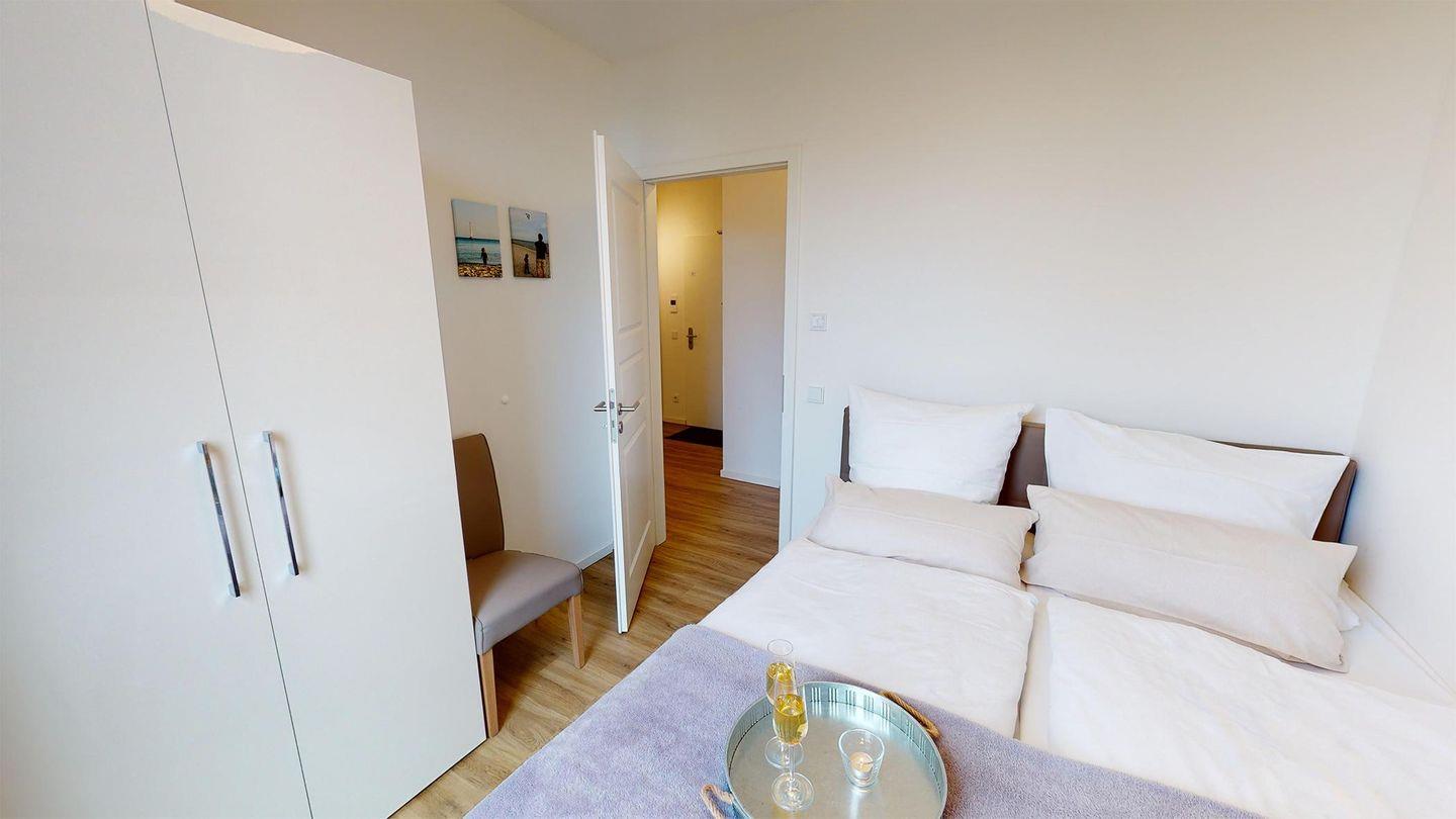 Der Eingangsbereich des Apartments führt Sie vorbei an einem kleinen Abstellraum, rechterhand in das erste der beiden Schlafzimmer. Hier erwartet Sie ein komfortables Boxspring-Doppelbett, ein geräumiger Kleiderschrank, ein Sofa sowie ein Flachbildfernseher. Außerdem haben Sie von hier aus Zugang zu einem der beiden Badezimmer. Dieses lichtdurchflutete Badezimmer verfügt über eine tolle Badewanne!
