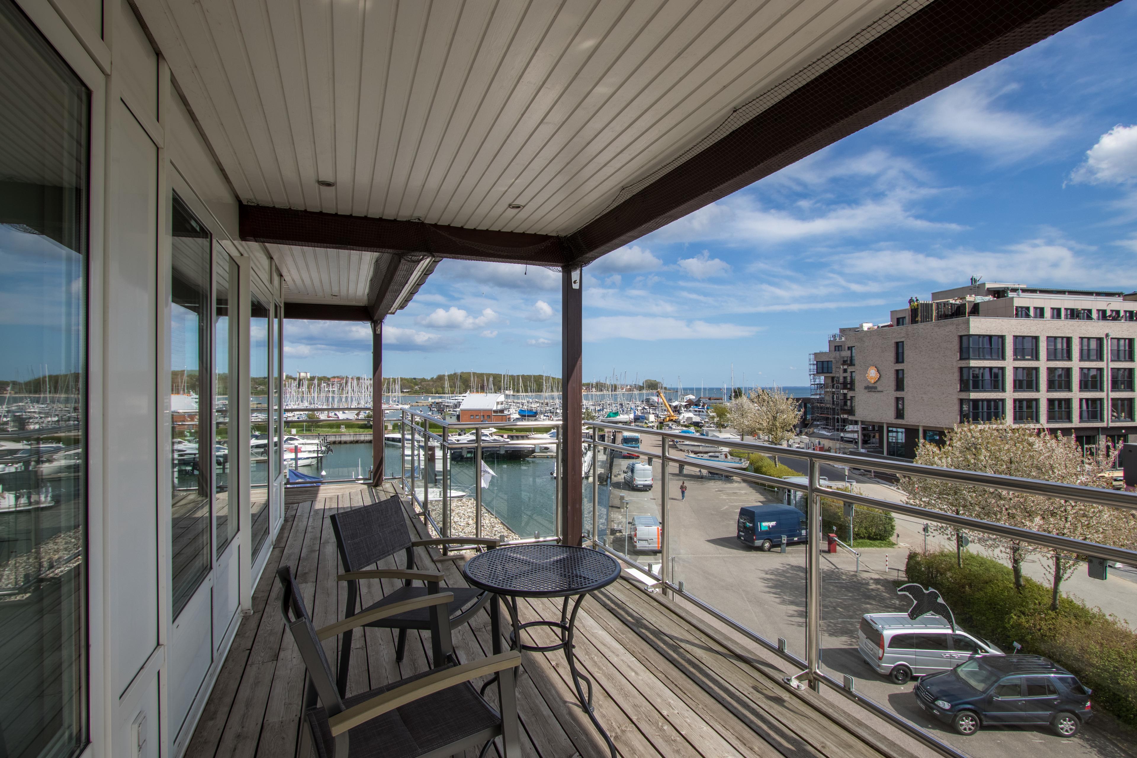 Balkon mit Blick über Ostsee, Hafen und Naturschutzgebiet