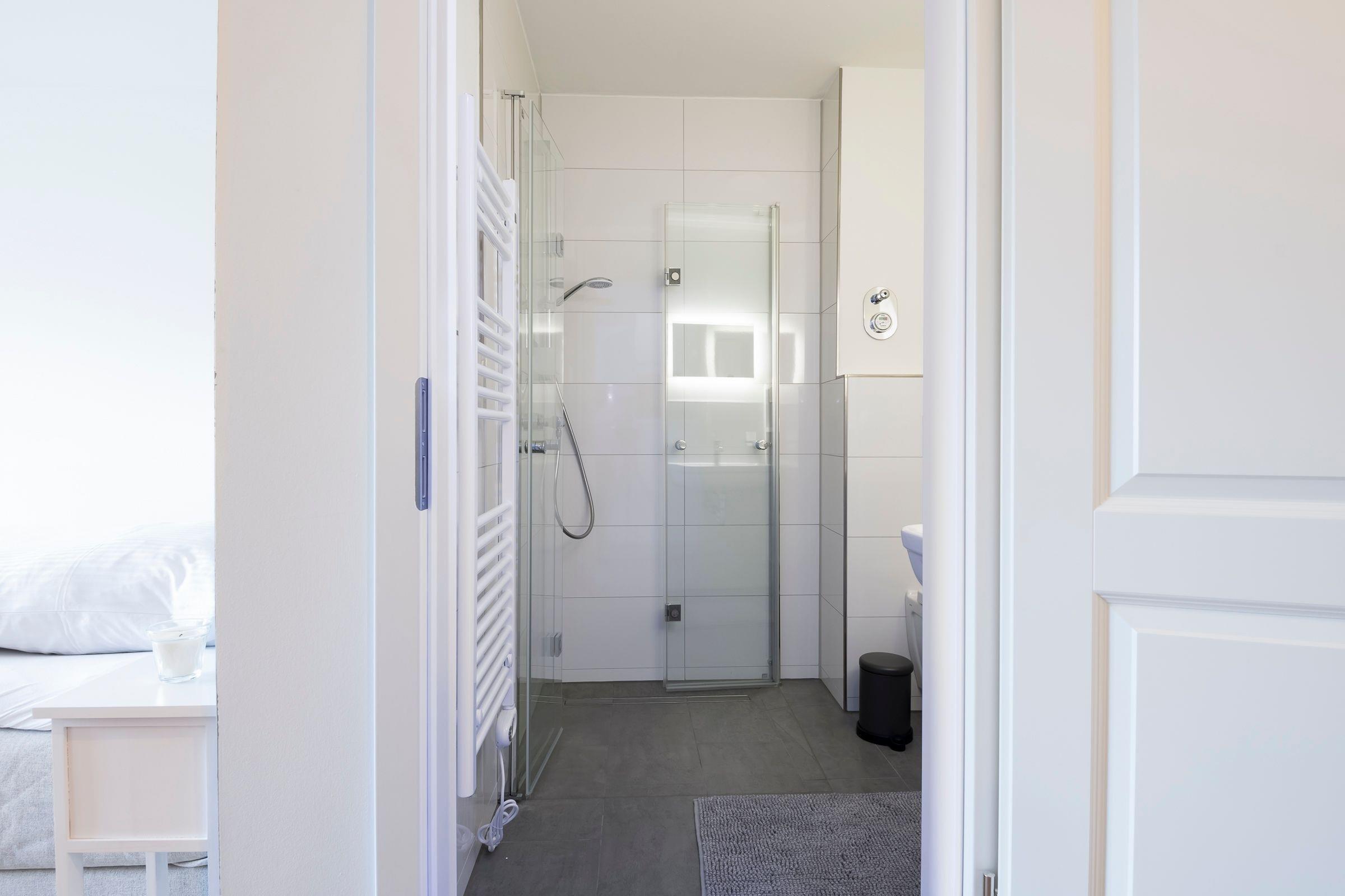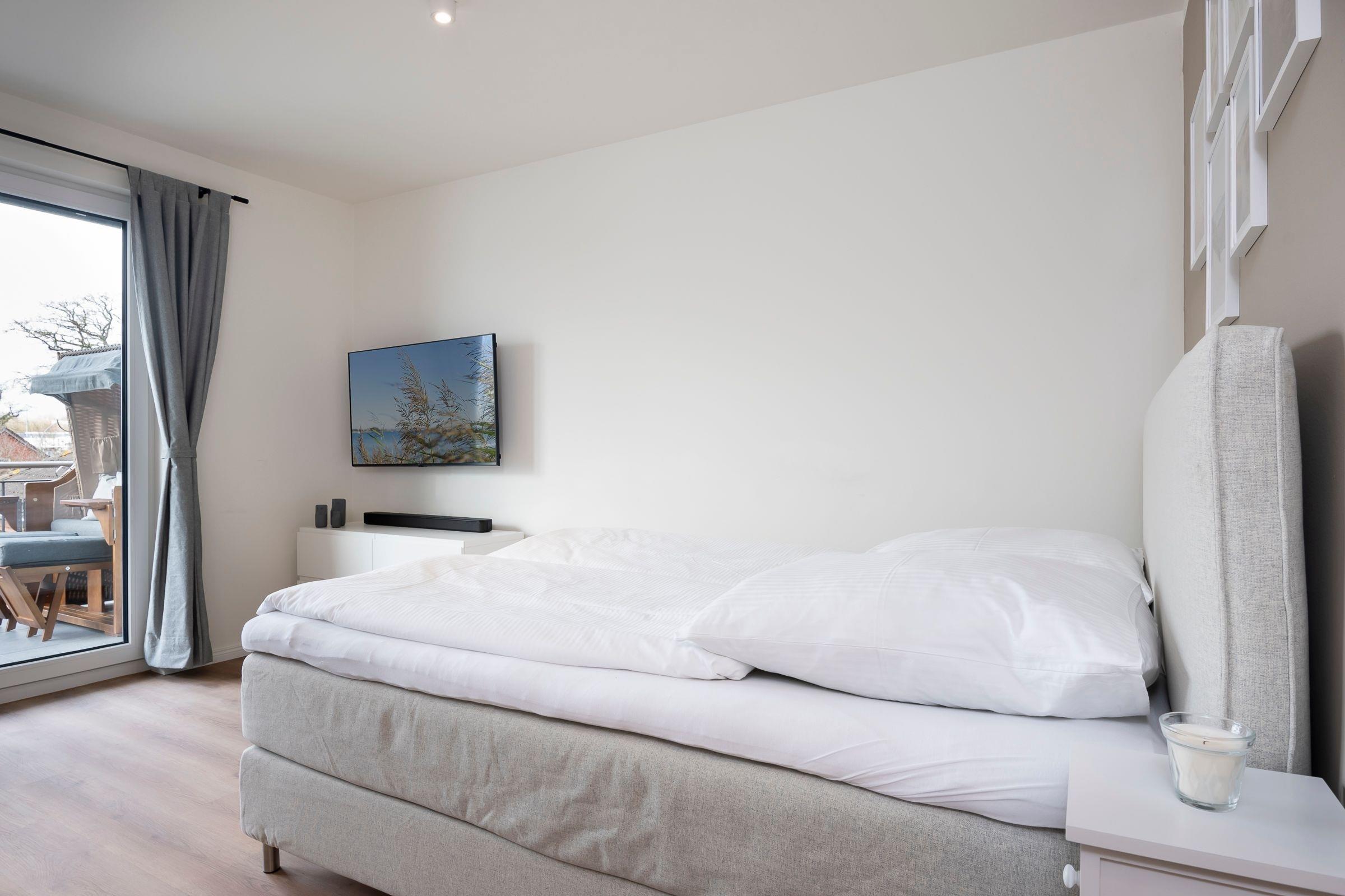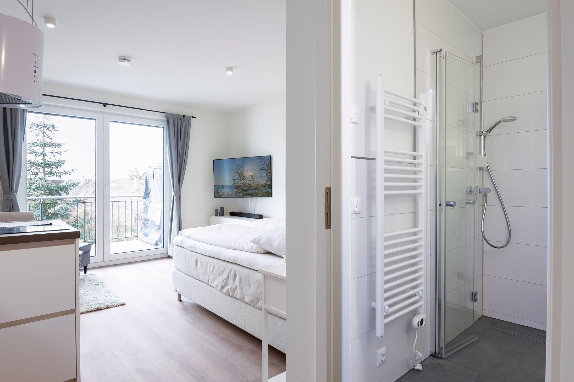 Das kombinierte Wohn- und Schlafzimmer mit angrenzender, offener Küche ist mit einem bequemen Sofa und einem komfortablen Boxspring-Doppelbett (160x200 cm) ausgestattet. Für Verdunkelung sorgen Außenjalousien. In der modernen Küchenzeile sorgen Annehmlichkeiten wie z. B. ein Herd mit Induktionskochfeld, ein Kühlschrank mit Gefrierfach, ein Geschirrspüler sowie eine Mikrowelle (Kombigerät mit Backofenfunktion) für Freude am Kochen. Für den täglichen Kaffeegenuss sorgt eine Espressomaschine (Nespresso). Eine bodengleiche Dusche, ein beheizbarer Handtuchhalter sowie Fußbodenheizung sorgen für Komfort im modernen, innenliegenden Badezimmer. Als Highlight steht Ihnen auf dem teilüberdachten Balkon mit West-Ausrichtung ein eigener Strandkorb zu Verfügung. Auch die Ostsee erreichen Sie fußläufig in ca. 15 Minuten über einen idyllischen Wanderweg.