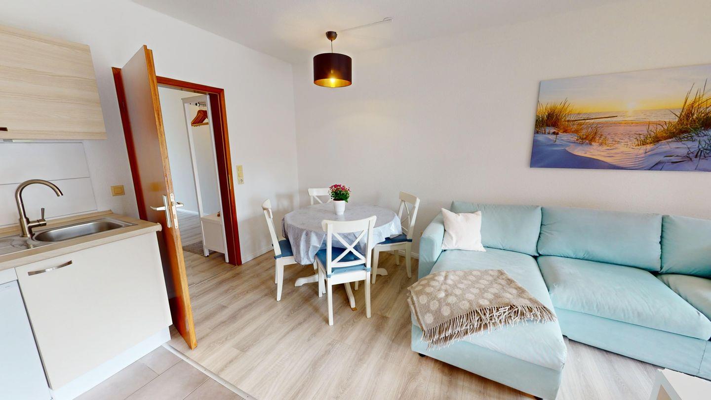 Ein gemütliches Schlafzimmer, ein Duschbad mit WC sowie der kombinierte Wohn- und Essbereich mit einem Schlafsofa für zwei Personen versprechen einen entspannten Urlaub für bis zu vier Personen. Ihr Hund ist hier herzlich willkommen!