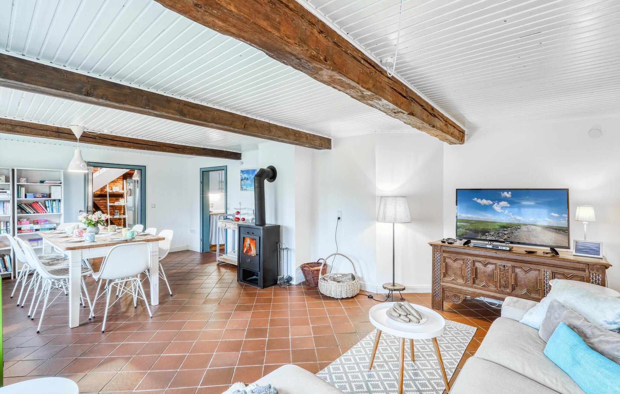 Dette charmerende stråtagshus tilbyder jer alt hvad I behøver til en afslappende ferie. Kombinationen af ??naturlige trægulve, terracottafliser og gulvvarme skaber en indbydende atmosfære, mens den store stue-spisestue med pejs skaber en ægte hygge-følelse. Det veludstyrede køkken lægger op til at lave mad sammen om aftenen, og med flere soveværelser byder huset på plads nok til hele familien. Børn kan rende rundt i den rummelige have, mens I nyder freden og roen på terrassen - et perfekt tilflugtssted at slappe af.