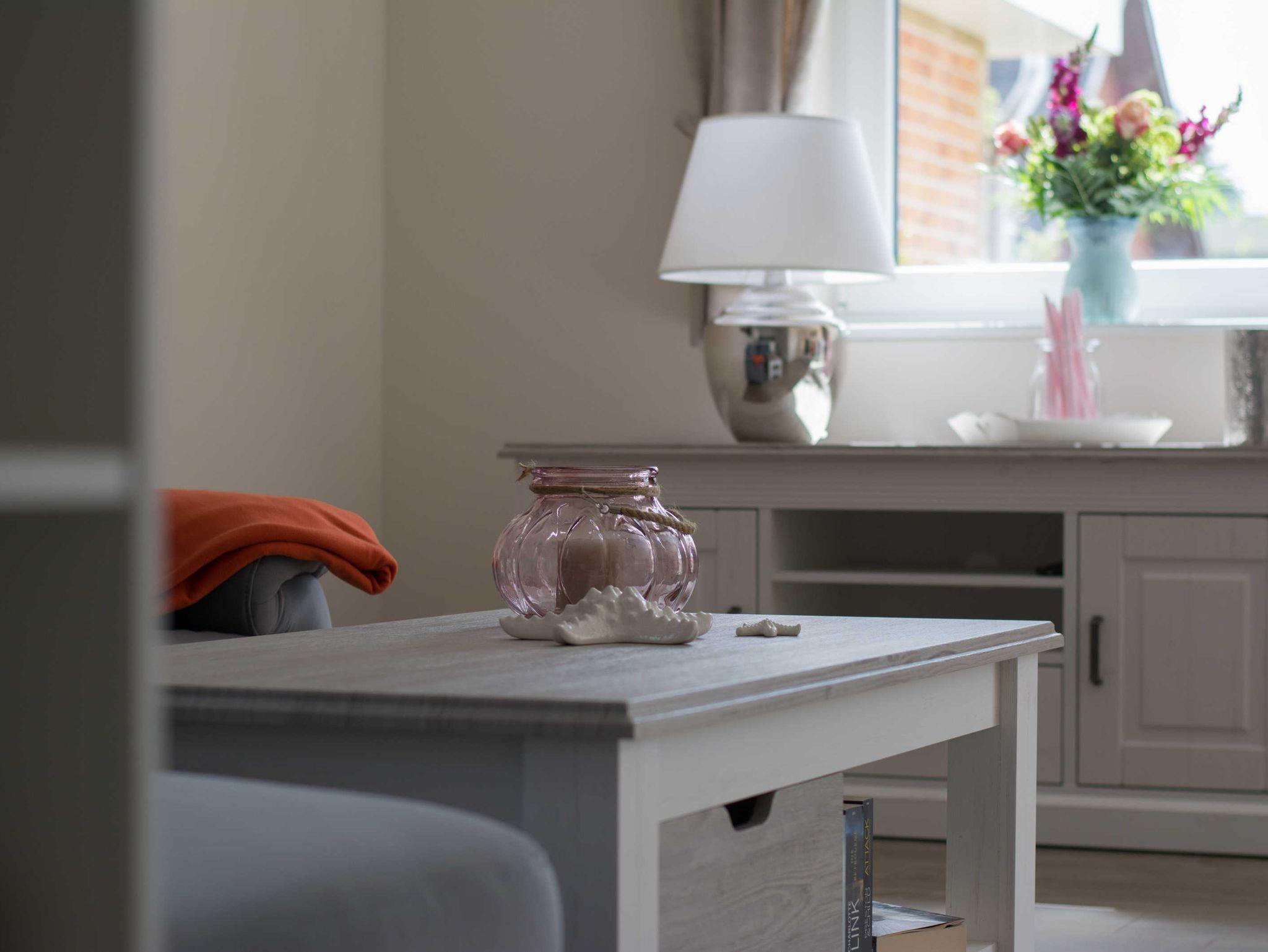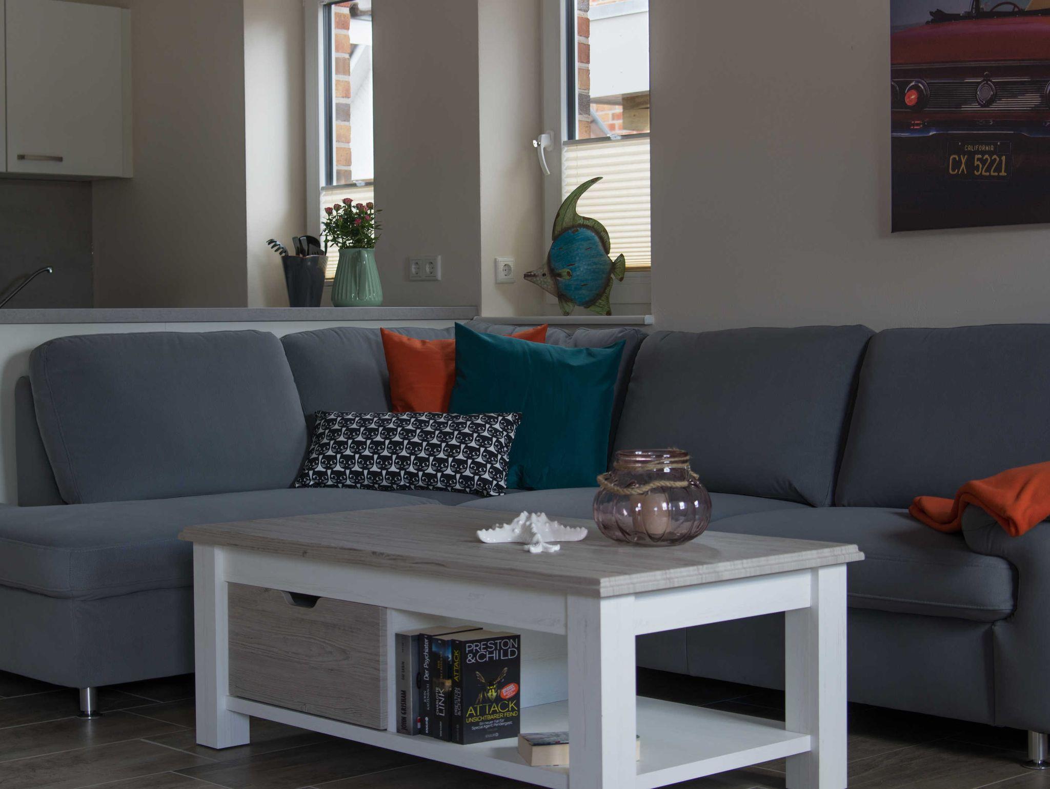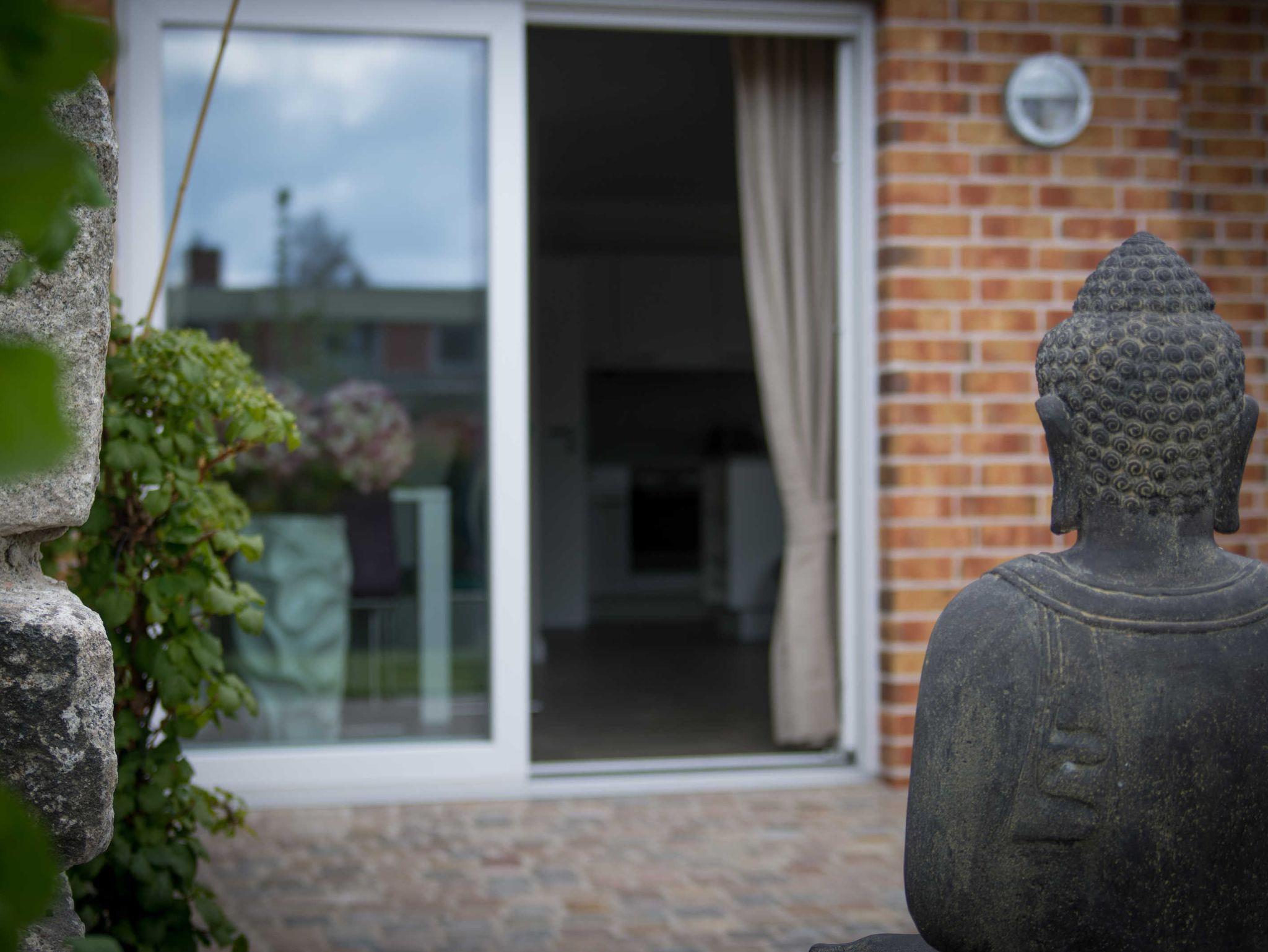 Morgens scheint die Sonne herrlich auf die eigene 30m² große Terrasse mit Garten. Hier lässt es sich prima frühstücken unter dem weiten Himmel Nordfrieslands.