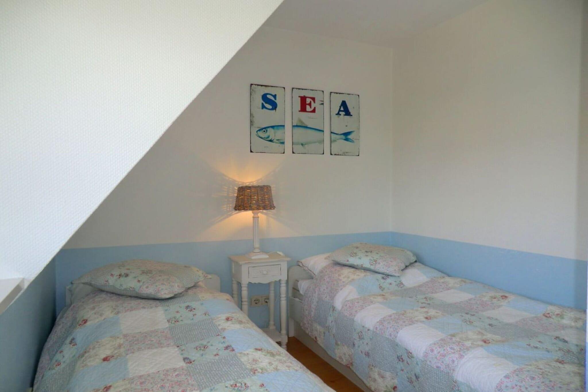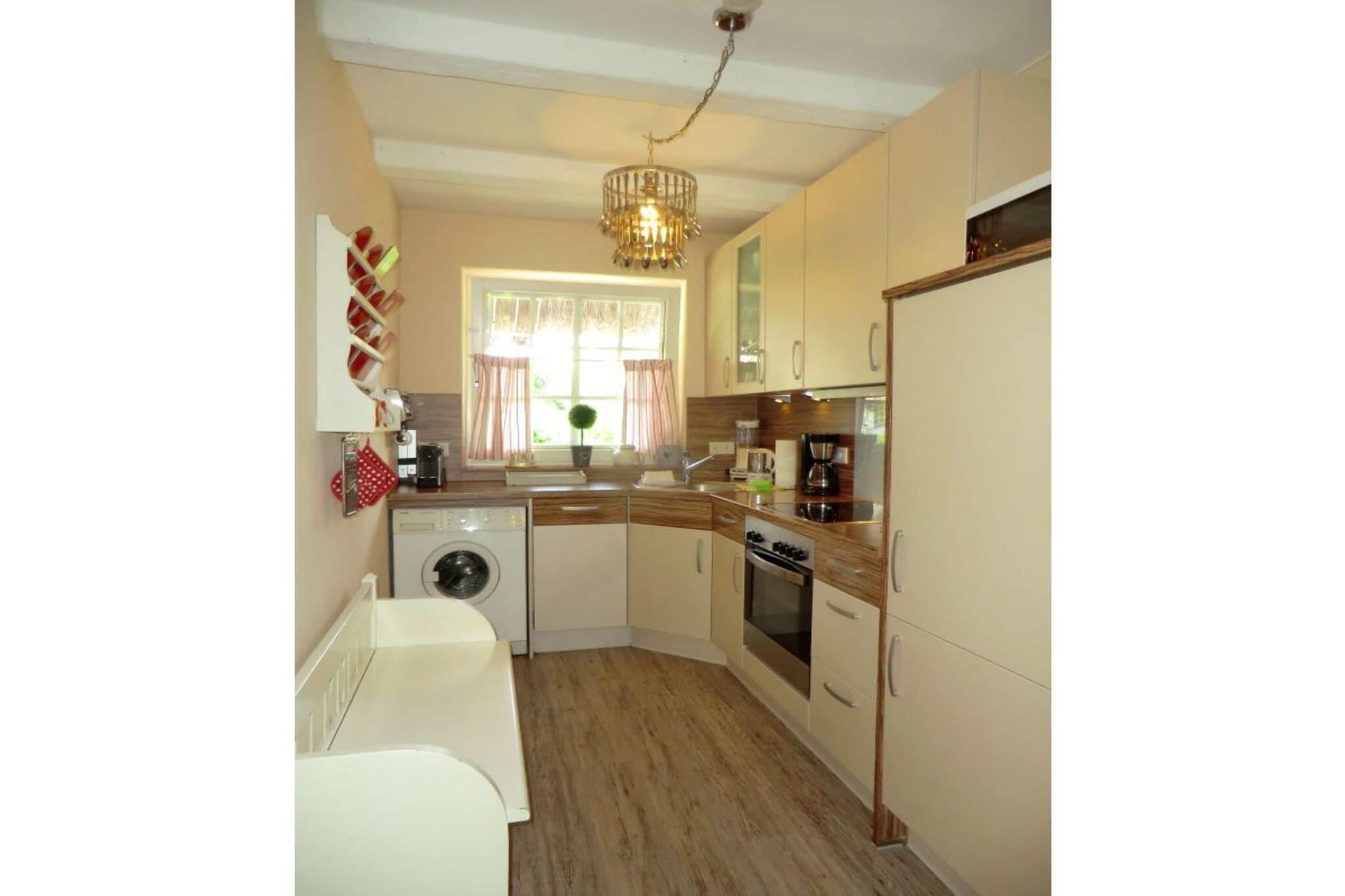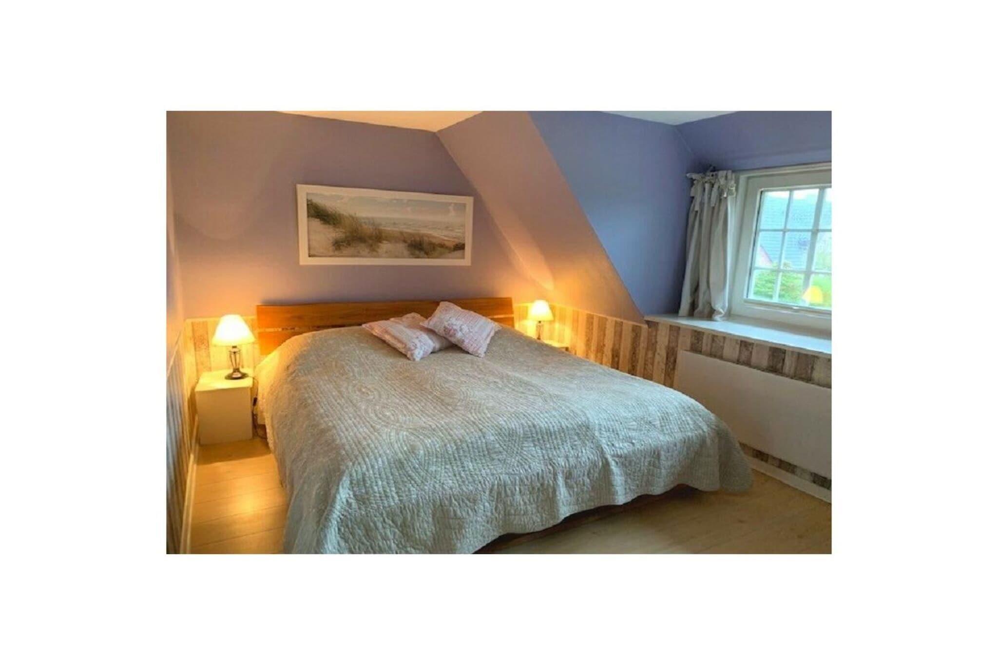 Beliggende i den sydlige udkant af Nordsø-byen Nieblum, tæt på stranden, golfbanen og landsbyens fremragende infrastruktur, byder dette stråtagshus på en have mod sydvest og en lille terrasse ved indgangen. Stueetage: Entré med garderobe, gæstetoilet, stue og spisestue (med pejs, fladskærms-tv, stereoanlæg og dvd-afspiller) med åbent køkken (inkl. vaskemaskine) og adgang til terrassen og haven. Øverste etage: Soveværelse med dobbeltseng, endnu et fladskærms-tv med dvd-afspiller og et stort klædeskab; andet (børne)soveværelse med to enkeltsenge (hver 80 x 190 cm); brusebad/toilet med to håndvaske.
