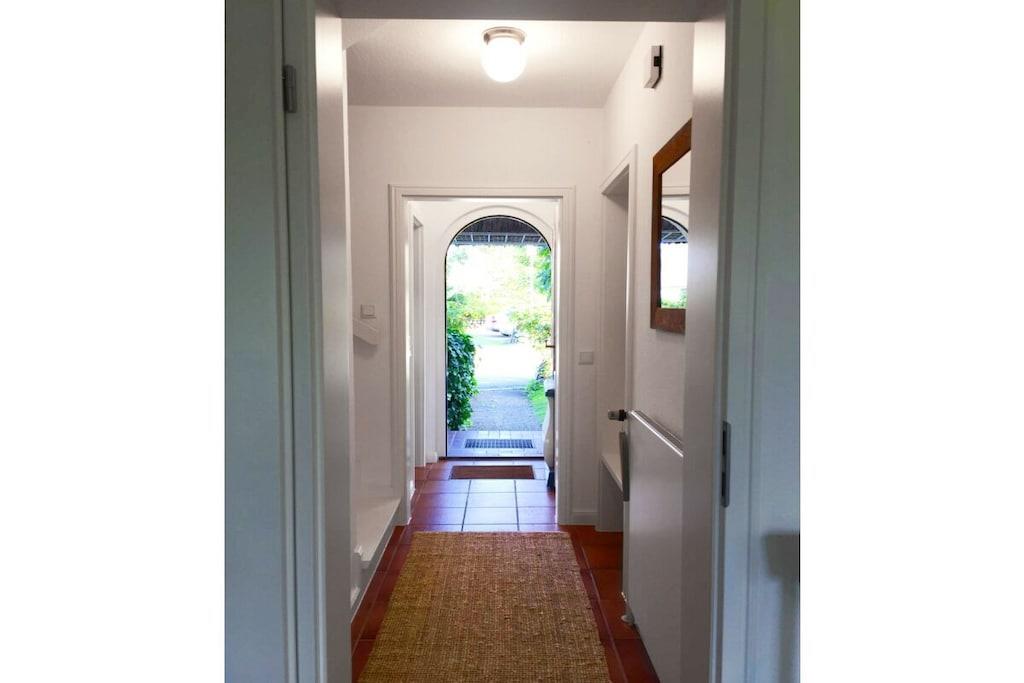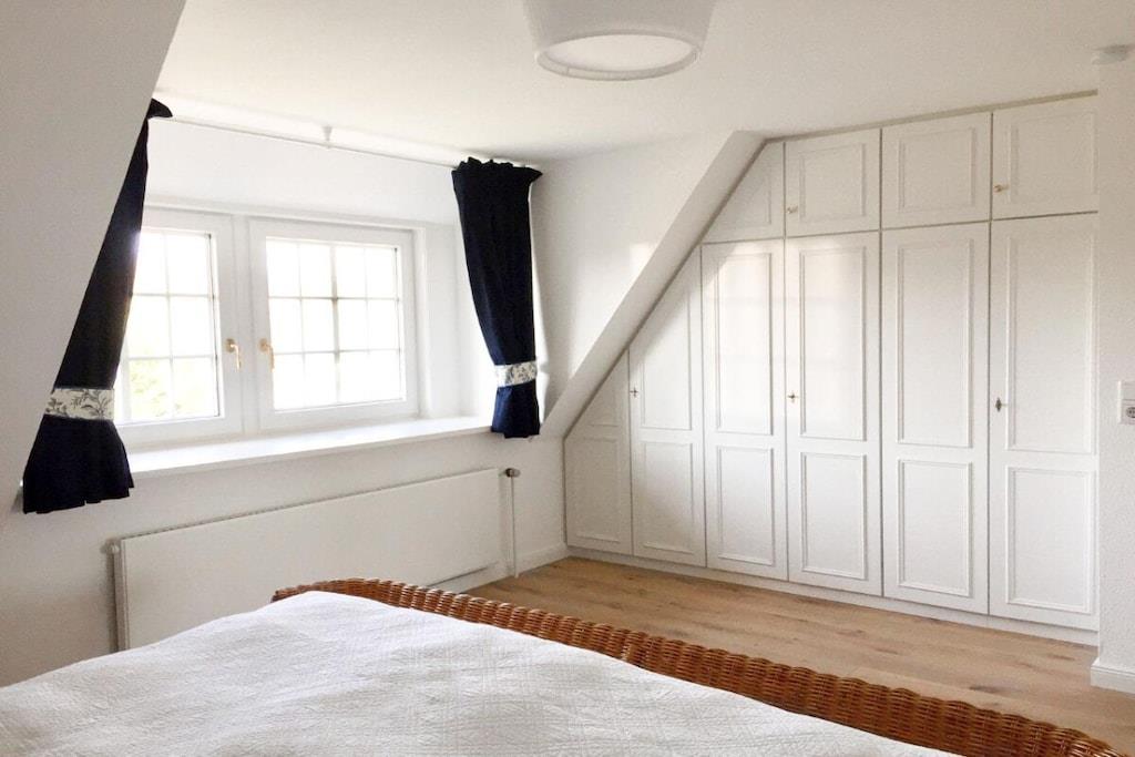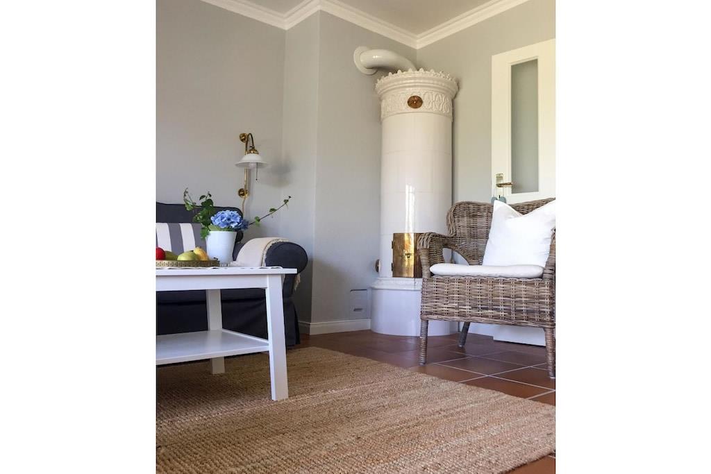 Gennem gangen kommer du ind i den rummelige stue og spisestue, som byder på masser af lys og uhindret udsigt gennem gulv-til-loft-vinduer. Herfra fører terrassedørene ud til din private have og den nyligt belagte terrasse med bord og stole. Den store sofa inviterer dig til at slappe af ved siden af fladskærms-tv'et, mens den originale Mylin-komfur med sine smukke håndlavede fliser og skinnende messing sørger for behagelig og hyggelig varme om vinteren. Det runde spisebord i træ har komfortabel plads til fem personer (en Tripp Trapp-højstol er også tilgængelig) og er let tilgængeligt fra det nye køkken. Der kan du tilberede alle slags måltider i det moderne og fuldt udstyrede køkken (inklusive en Bora induktionskogeplade, opvaskemaskine, ovn og Bosch-apparater). Fra gangen (som også indeholder et gæstetoilet) fører en let trætrappe til de øverste etager. Her finder du soveværelserne, det ene med en dobbeltseng og et stort indbygget klædeskab, og det andet med tre enkeltsenge. Øverste etage har også et dejligt legeområde. Alle værelser kan mørklægges for en god nats søvn. En rejseseng kan leveres efter anmodning. Det lyse og indbydende badeværelse med et rummeligt brusebad giver hele familien mulighed for at starte dagen frisk. Et separat brusebad giver mulighed for samtidig brusning.