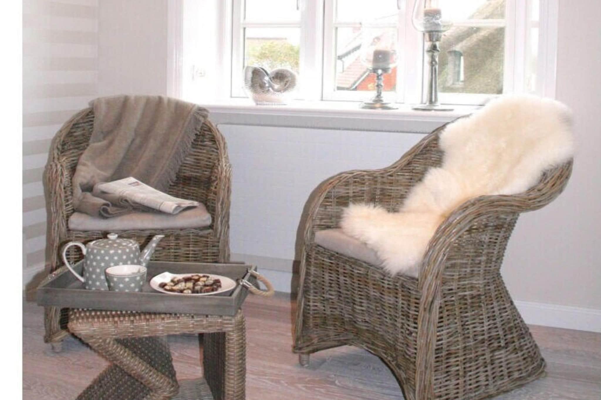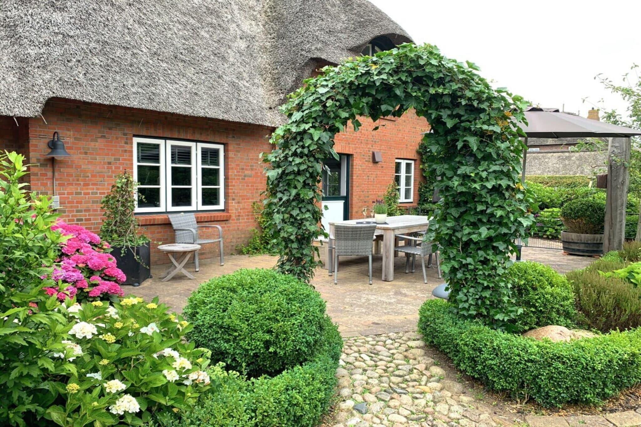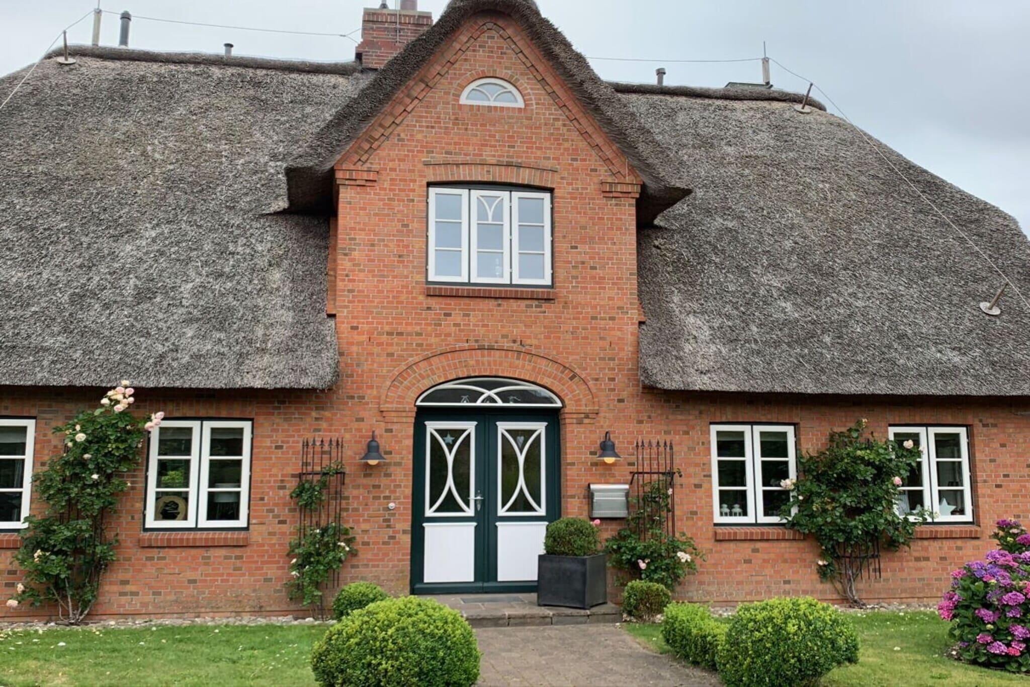 Experience the Föhr passion in this exclusive, detached thatched-roof house, which we will be making even cozier with a comprehensive renovation in November 2024. High-quality furnishings are complemented by thoughtful details, giving this spacious house its hygge charm. In autumn and winter, you can feel the warmth of the historic tiled stove. The sauna heats up nicely at 90 degrees Celsius, or you can choose a more relaxing 60 degrees. A rain shower, relaxation room, and direct garden access complete your sauna experience. For creative culinary moments, you'll find a very well-equipped kitchen. Take time to cook and bake, perhaps a cake with freshly harvested apples, pears, or plums from the garden. Three large showers offer plenty of room to move around in the bathrooms, making it easily accessible for people with disabilities. Please call us for details. Heated loungers (with TV) in the upstairs bathroom are highly recommended for small children during a leisurely family bath. ... 1 living room with dining area and open-plan kitchen, cozy warmth from a historic Mylin tiled stove 1 entrance hall 1 ground floor bedroom with double bed and desk 1 en suite bathroom with large shower, bench, and double vanity 1 first floor bedroom with double bed 1 first floor children's room with two single beds 1 playroom/chill-out room 1 guest WC 1 first floor bathroom with family shower, bathtub, heated bench, and relaxation area 1 sauna area with sanarium and shower, relaxation loungers, and garden access 1 laundry/utility room