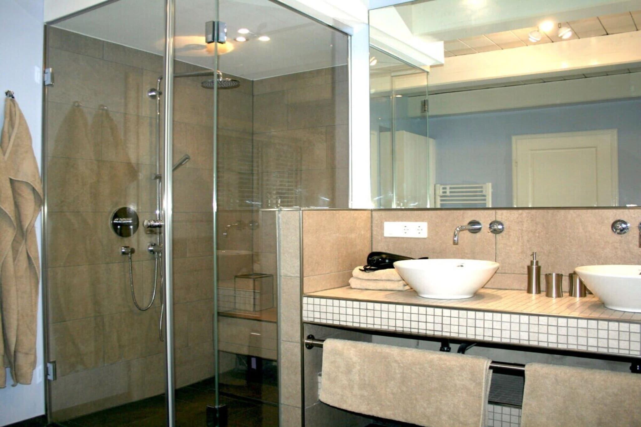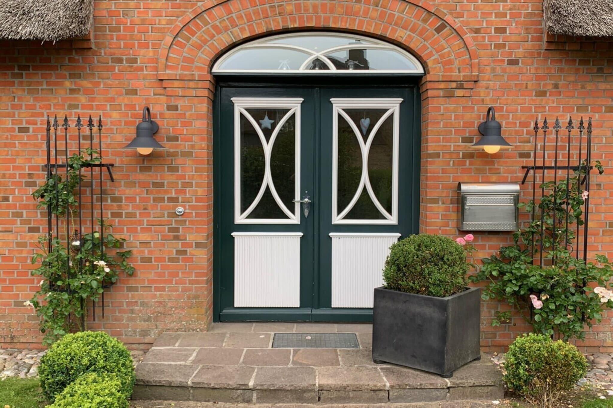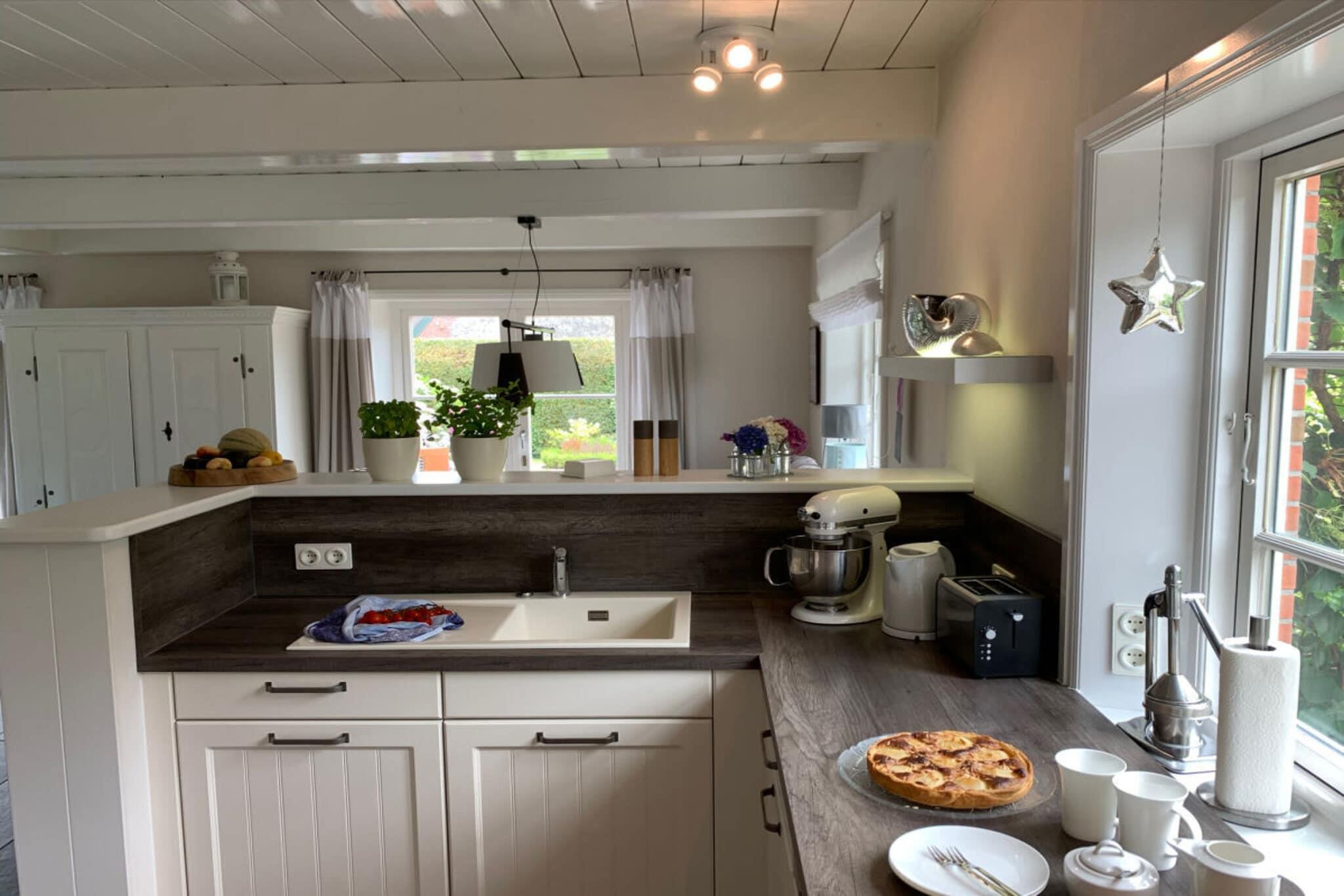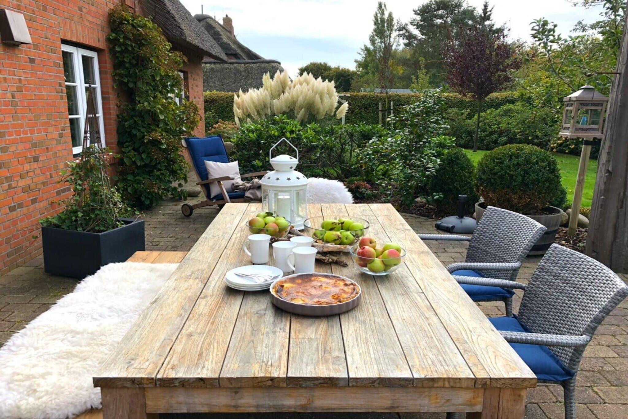 Experience the Föhr passion in this exclusive, detached thatched-roof house, which we will be making even cozier with a comprehensive renovation in November 2024. High-quality furnishings are complemented by thoughtful details, giving this spacious house its hygge charm. In autumn and winter, you can feel the warmth of the historic tiled stove. The sauna heats up nicely at 90 degrees Celsius, or you can choose a more relaxing 60 degrees. A rain shower, relaxation room, and direct garden access complete your sauna experience. For creative culinary moments, you'll find a very well-equipped kitchen. Take time to cook and bake, perhaps a cake with freshly harvested apples, pears, or plums from the garden. Three large showers offer plenty of room to move around in the bathrooms, making it easily accessible for people with disabilities. Please call us for details. Heated loungers (with TV) in the upstairs bathroom are highly recommended for small children during a leisurely family bath. ... 1 living room with dining area and open-plan kitchen, cozy warmth from a historic Mylin tiled stove 1 entrance hall 1 ground floor bedroom with double bed and desk 1 en suite bathroom with large shower, bench, and double vanity 1 first floor bedroom with double bed 1 first floor children's room with two single beds 1 playroom/chill-out room 1 guest WC 1 first floor bathroom with family shower, bathtub, heated bench, and relaxation area 1 sauna area with sanarium and shower, relaxation loungers, and garden access 1 laundry/utility room
