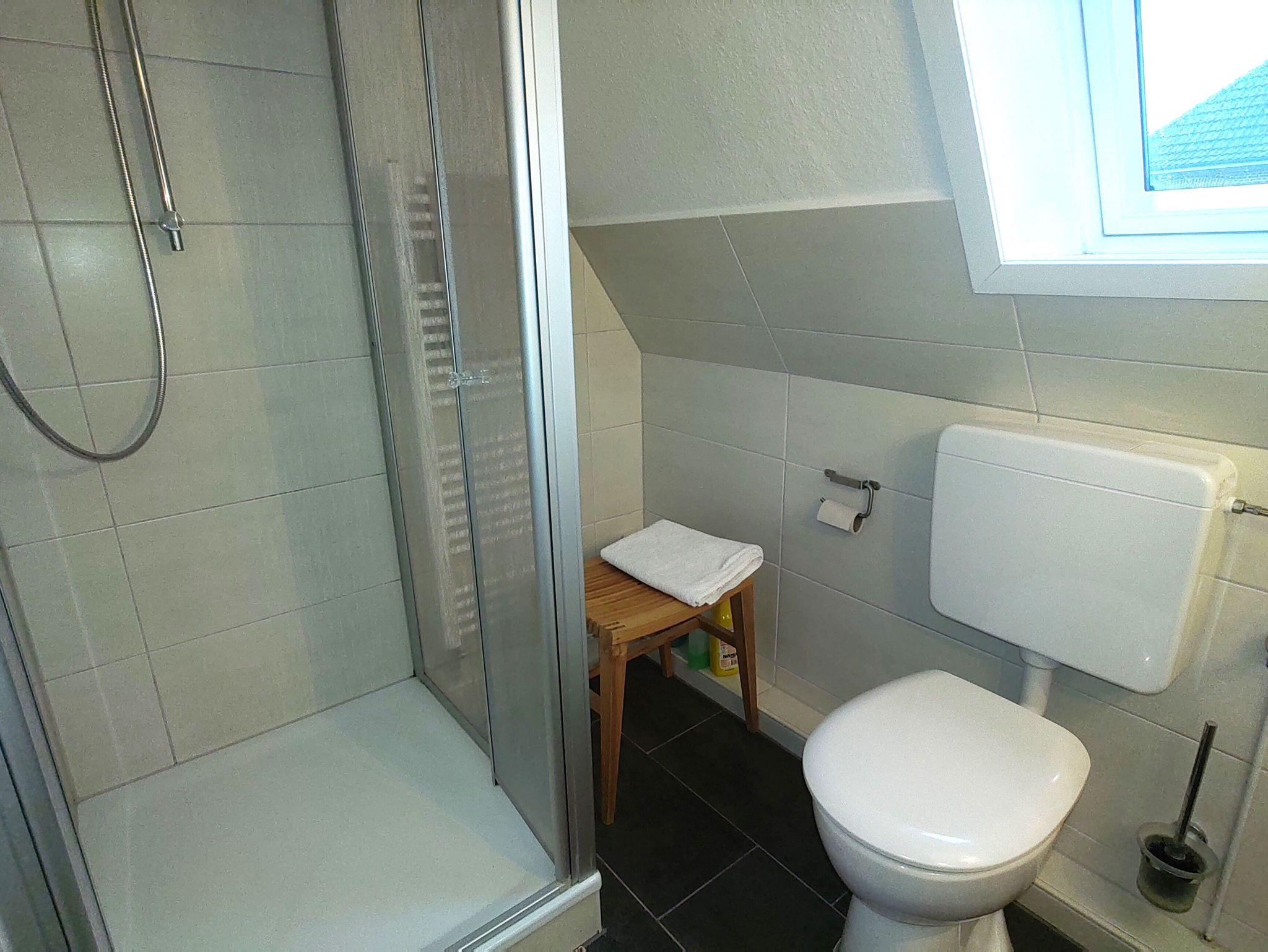1 Schlafraum mit Doppelbett, 1 Wohnküche mit Essbereich, 1 Badezimmer mit Dusche.