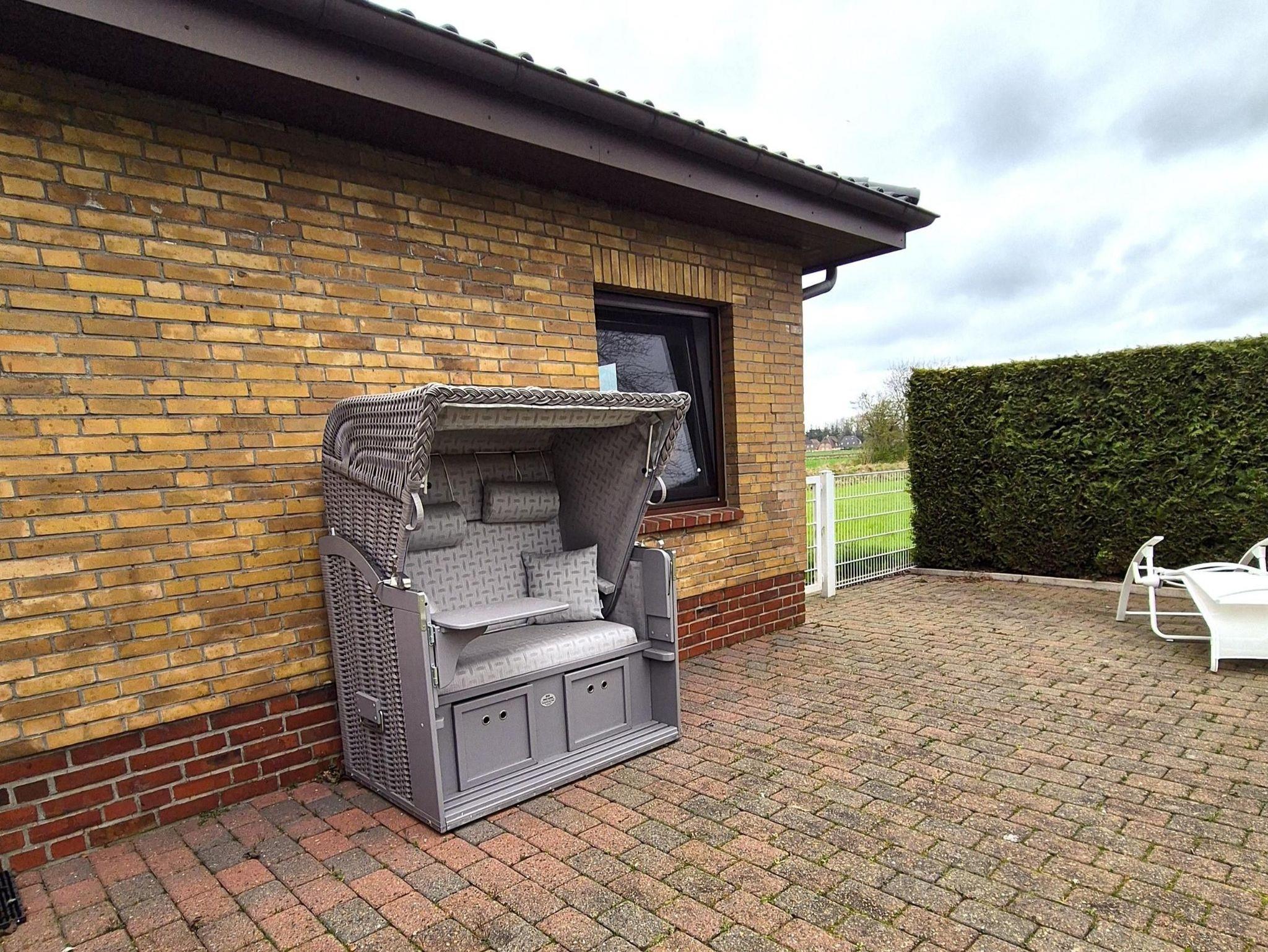 Außenbereich: eingezäunter Garten, Gartenmöbel, Strandkorb auf Terrasse, Terrasse, Terrassenmöbel.