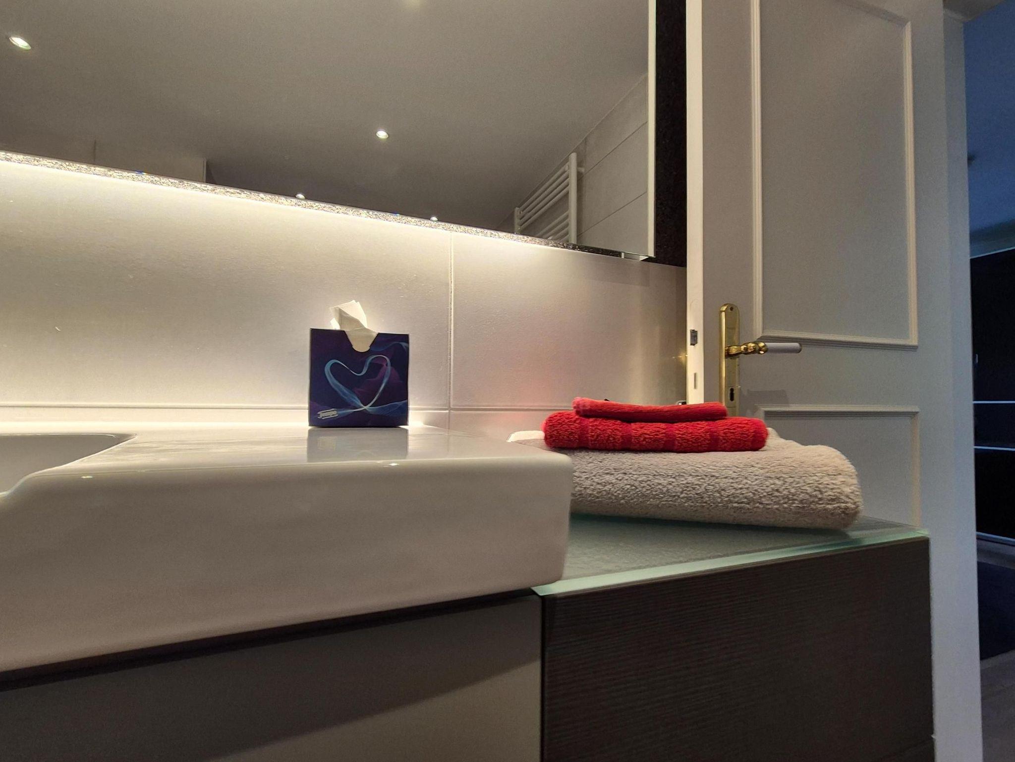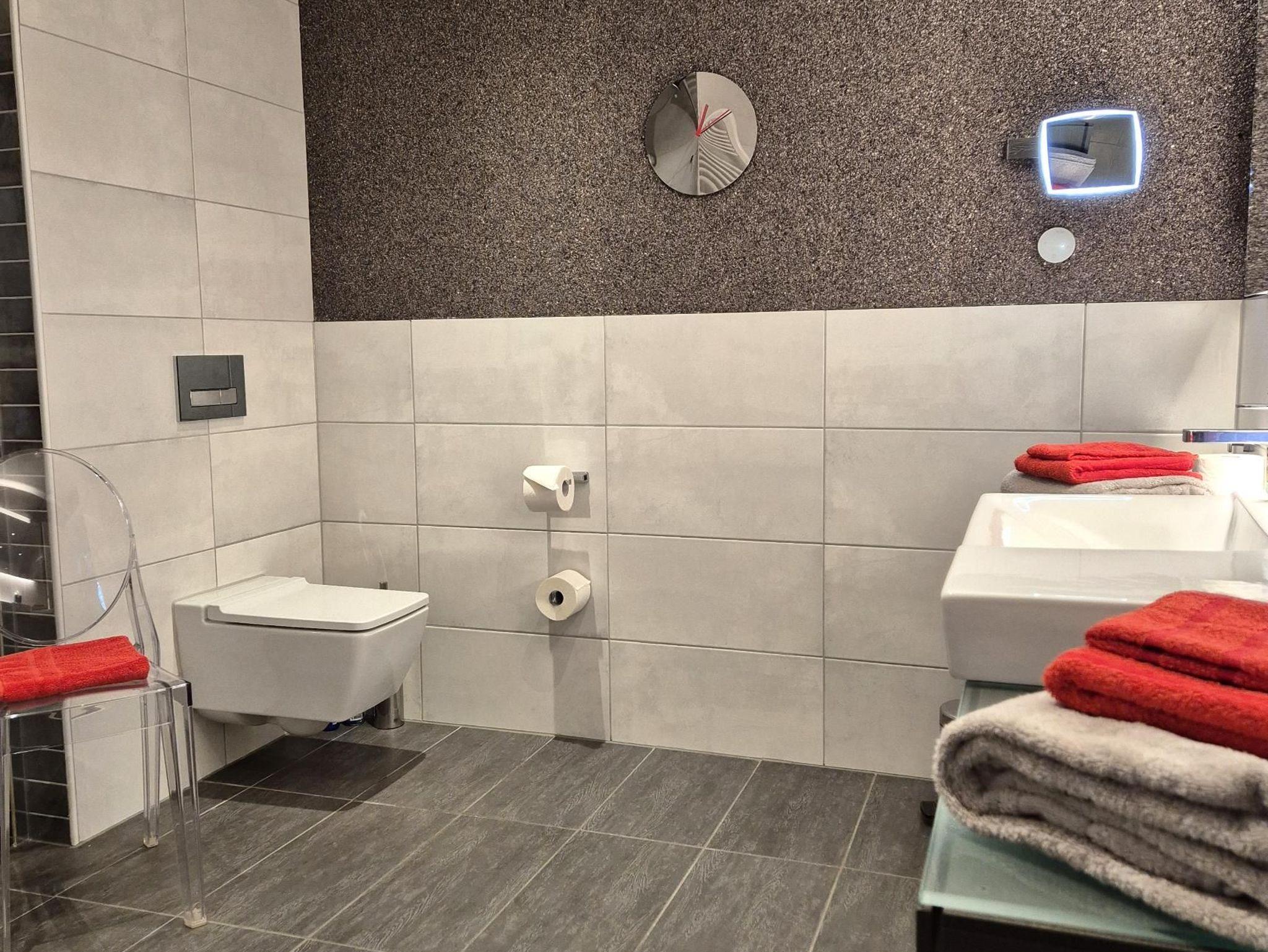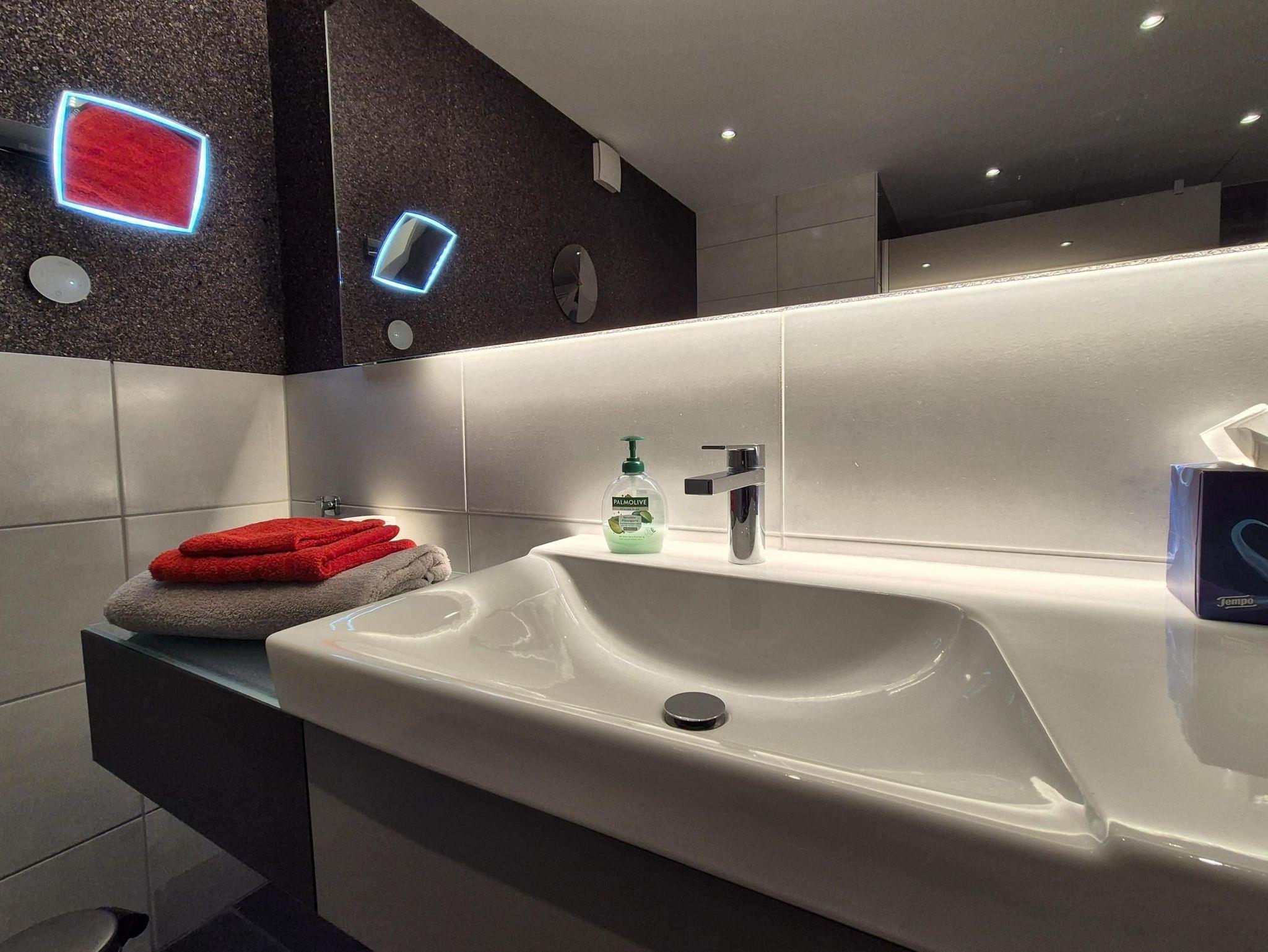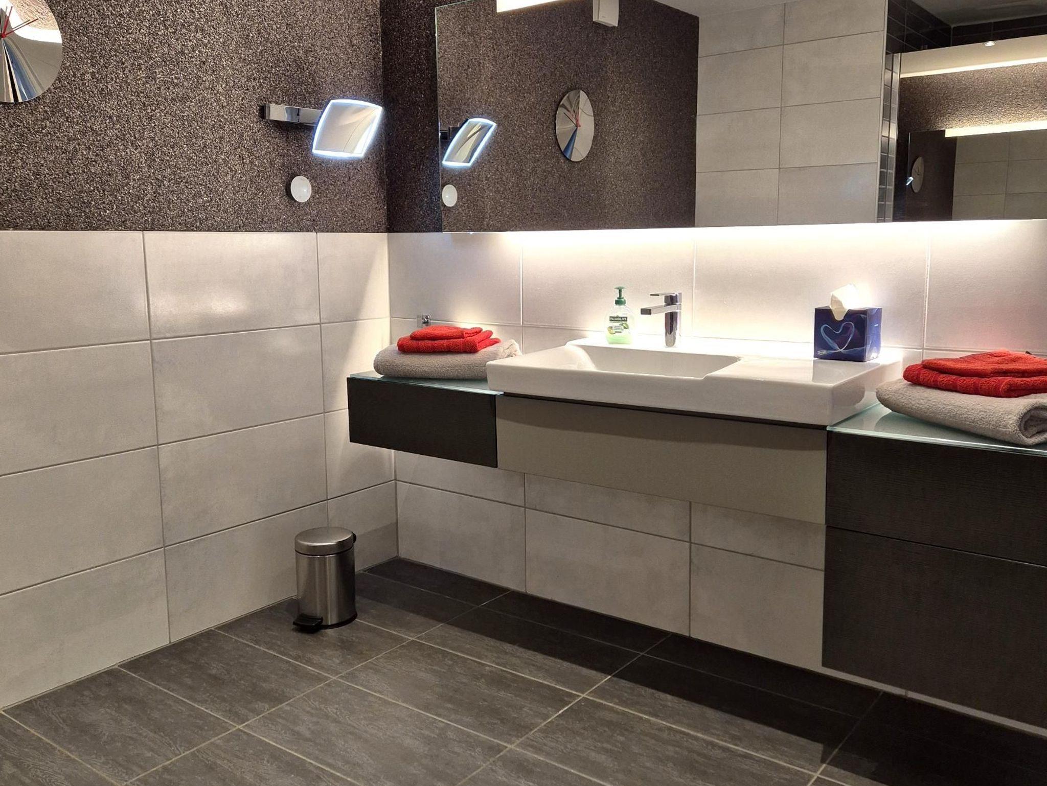 Sanitär: bodenebene Dusche, Föhn, Handtuchheizkörper, Schminkspiegel.