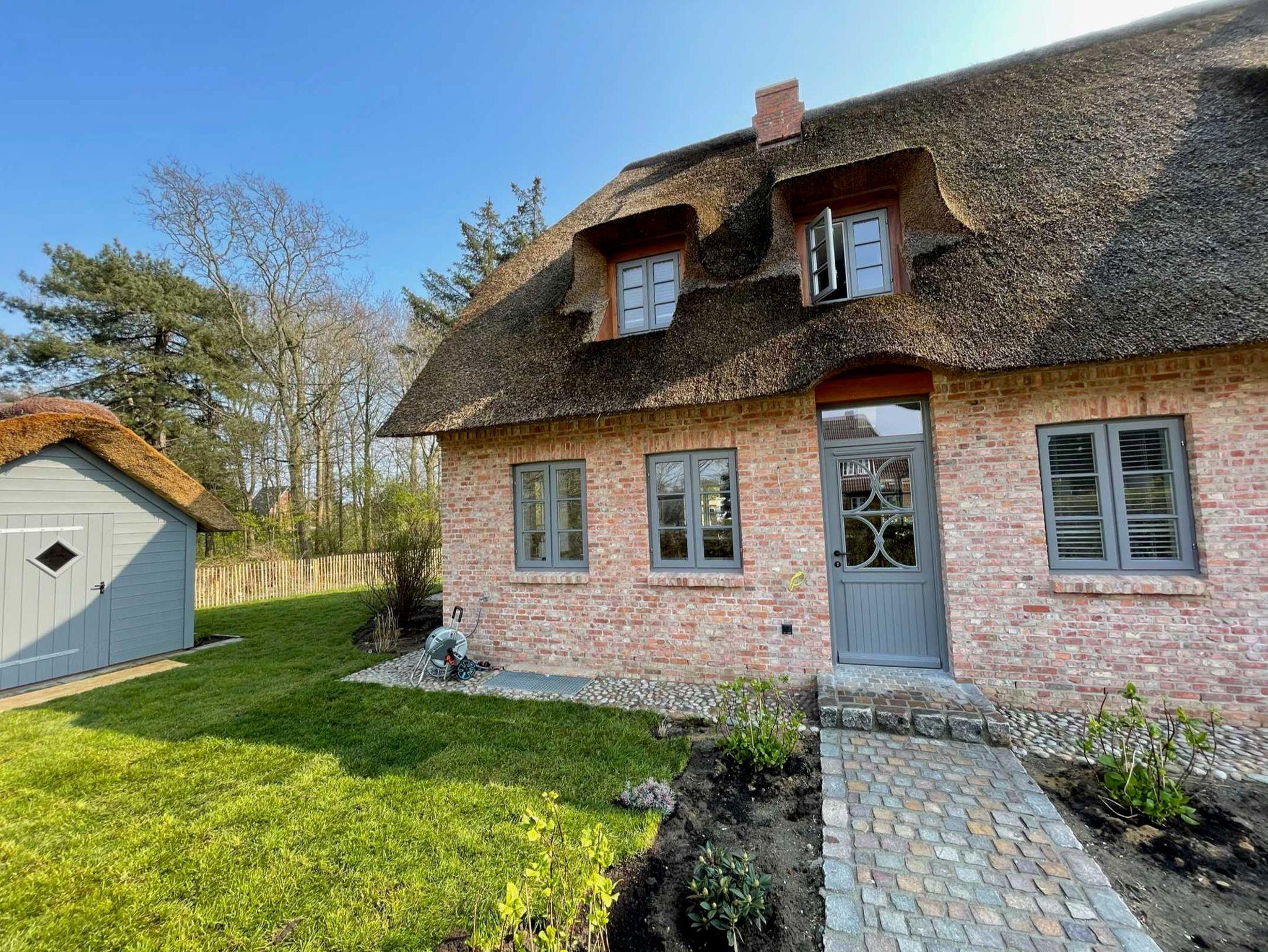 Frigga ist die größere Hälfte eines neuen Reetdachhauses (2021) in Nieblum/Föhr. Außen klassisches Friesenhaus, innen jung und modern. 3 Schlafzimmer (plus Gästezimmer (Bettsofa) und Kinderbett (DG). Keller große Sauna mit Ruheraum und Fitnessraum (ab Juli 2021). WLAN/Sonos-Anlage/3 Fernseher (Wohnzimmer/Fitness/DG). Dicht zum Strand und nah zum Ortskern - aber ab vom Trubel!
