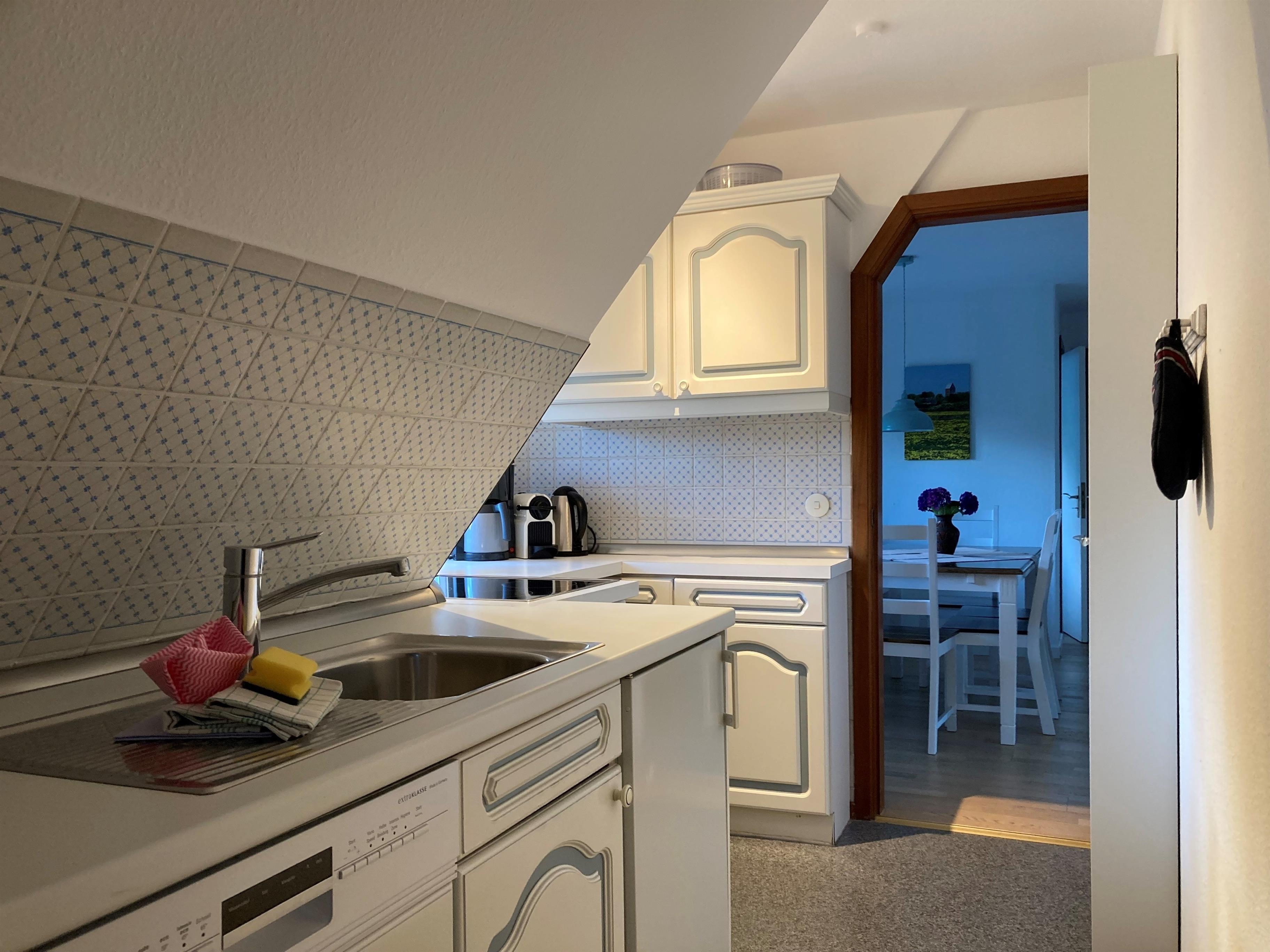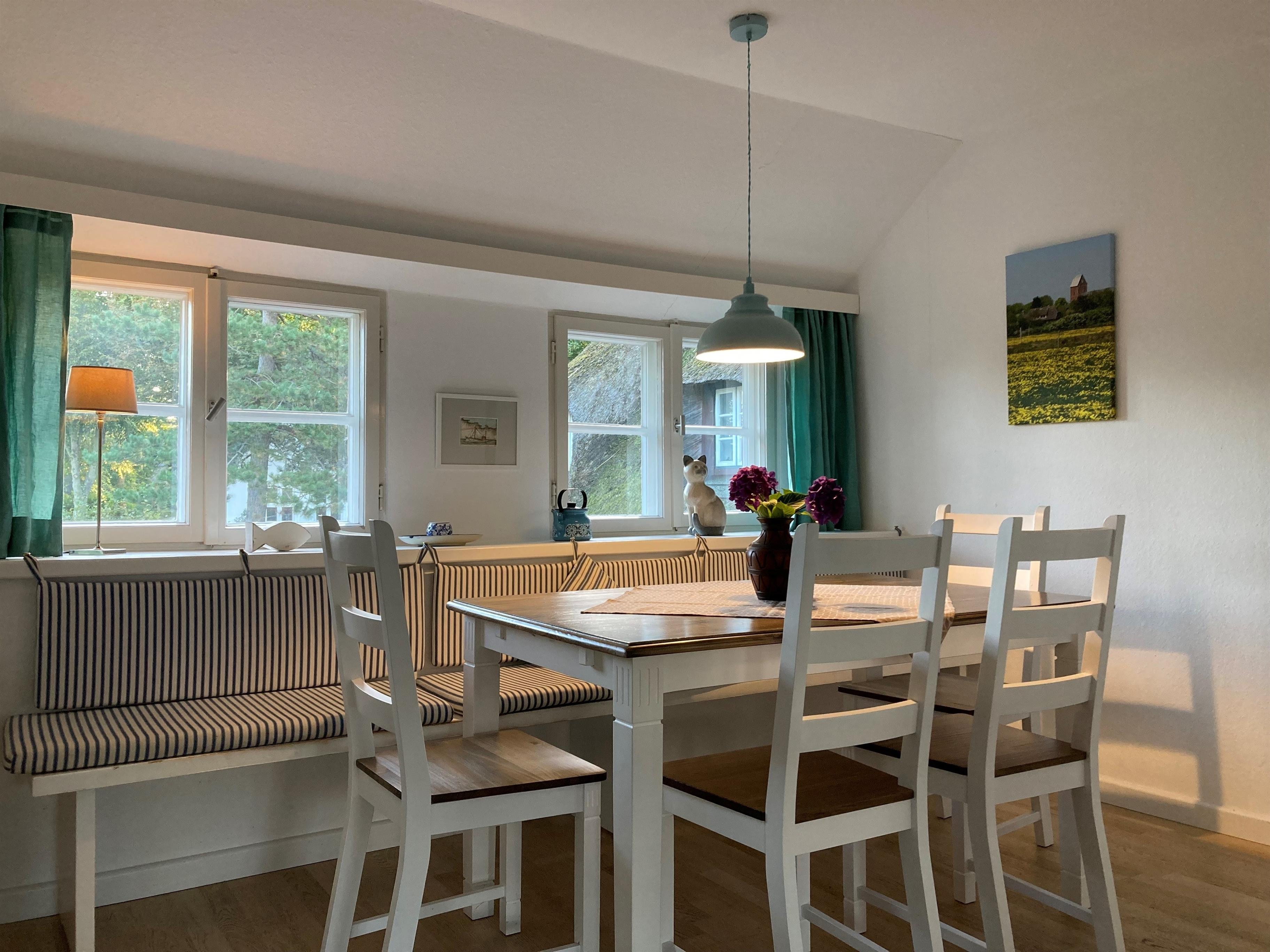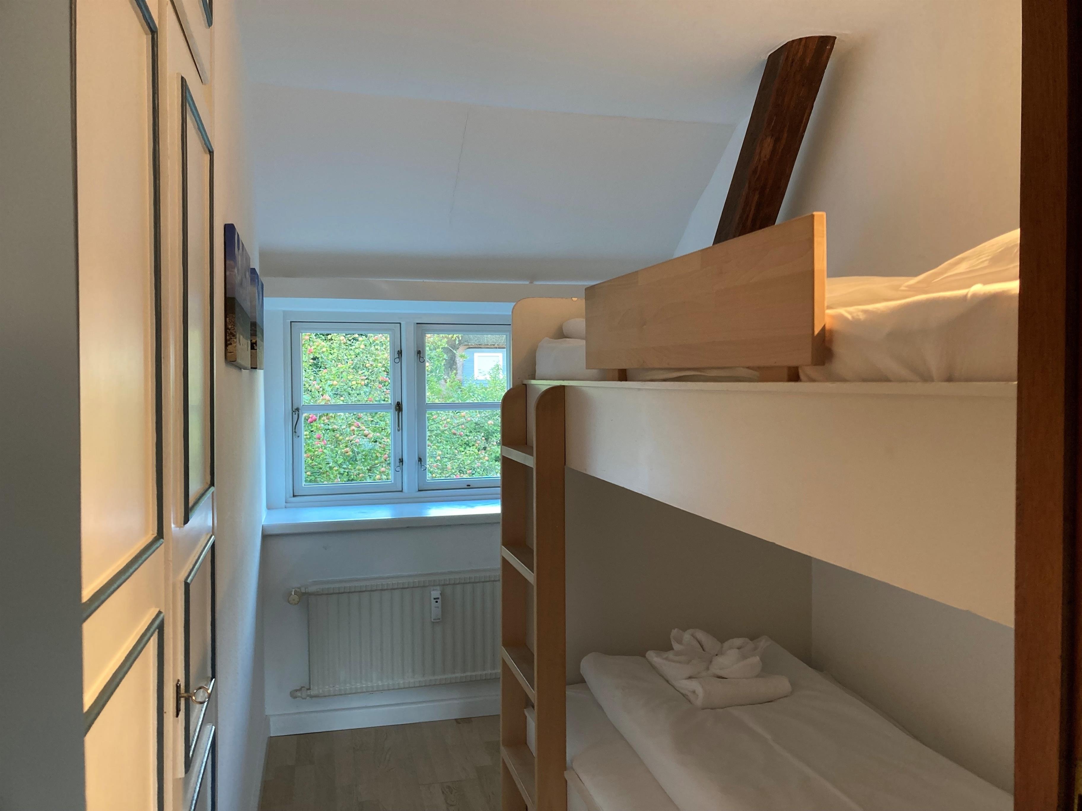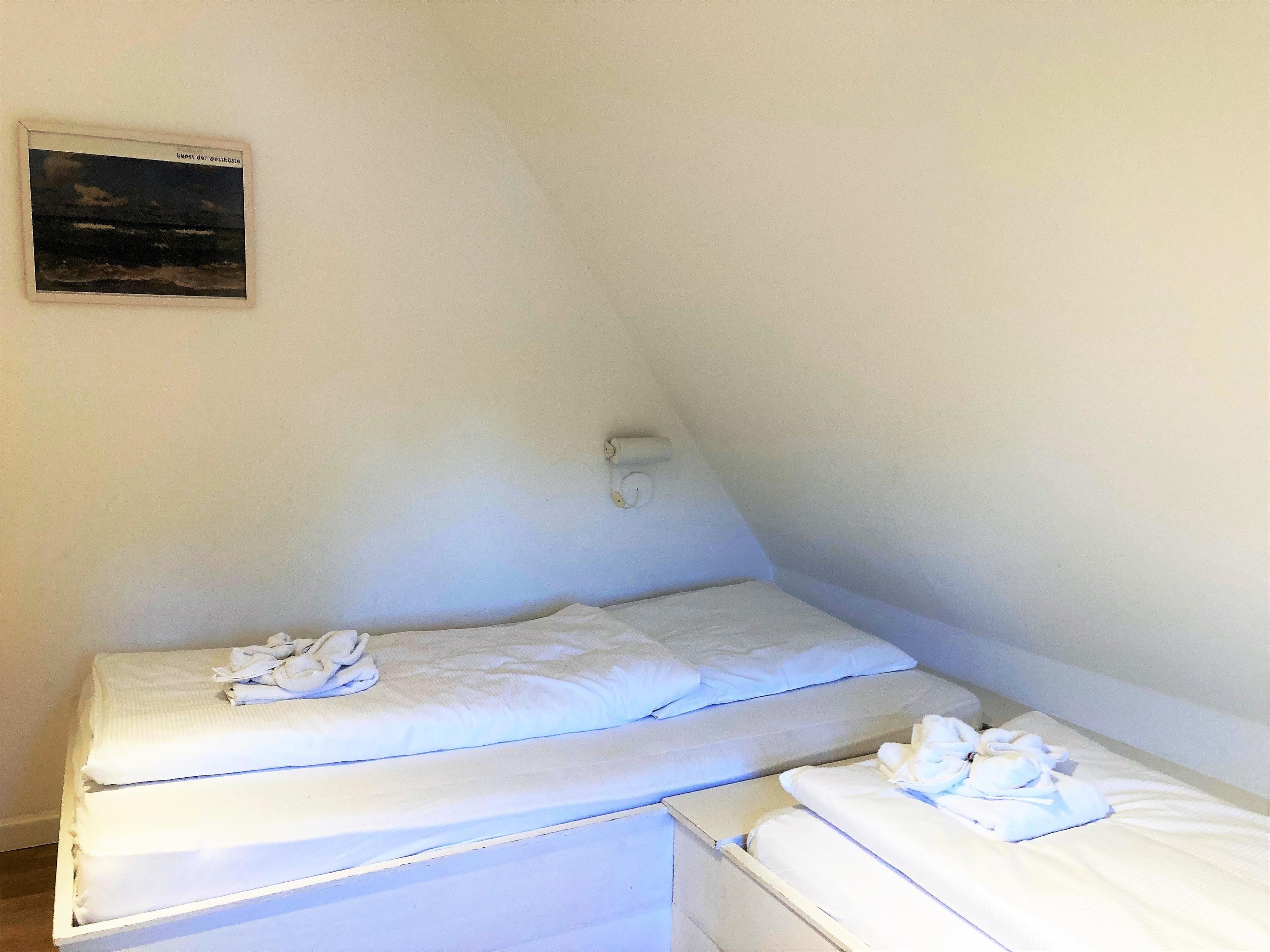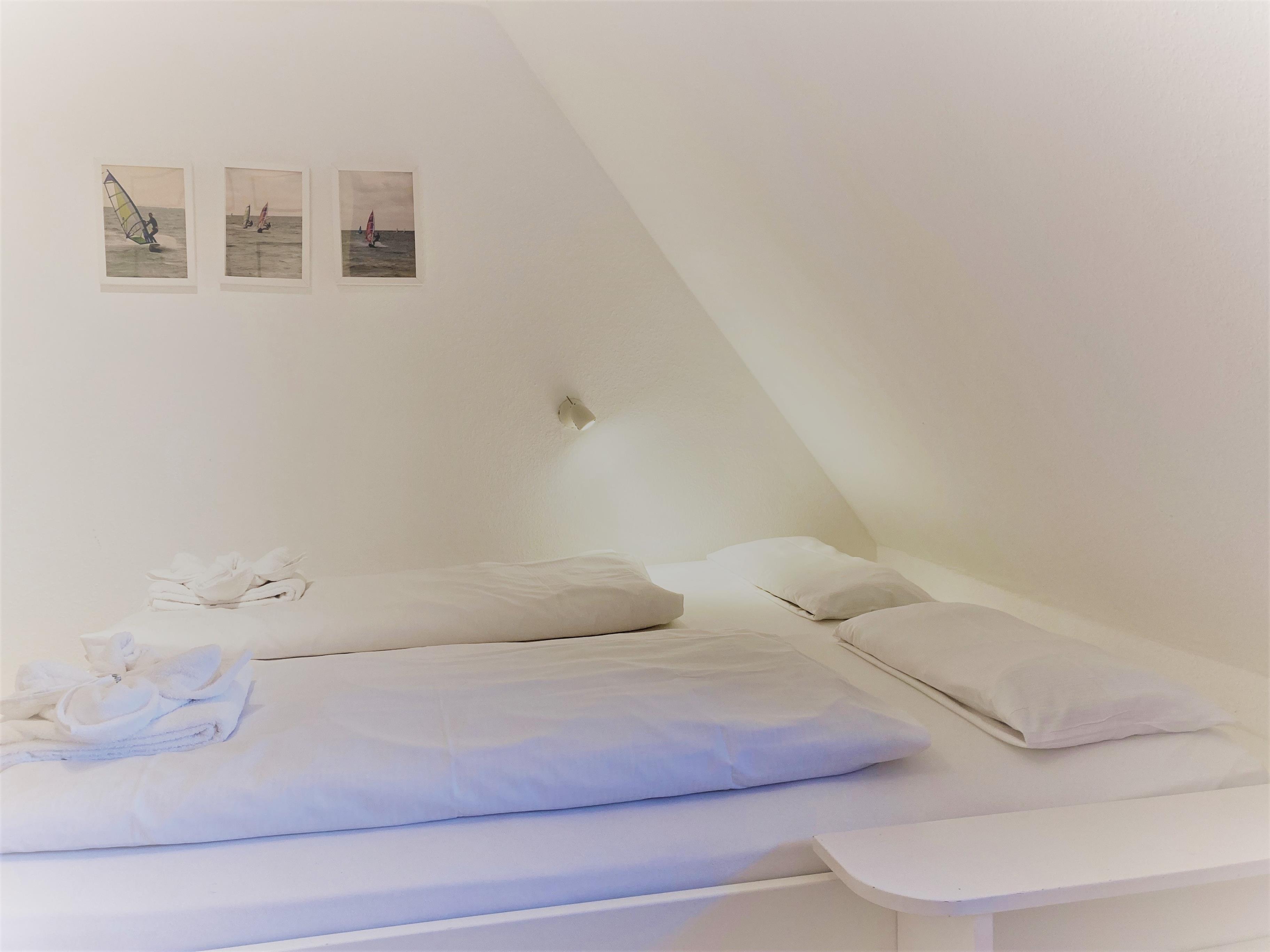Unsere OG-Fewo "Heuboden" (ca.68 qm) liegt im ersten Obergeschoss des inseltypischen Reetdachhauses und lädt bis zu 6 Personen zu herrlichen Urlaubstagen ein. Die Ferienwohnung verfügt über ein großes, gemütliches Wohnzimmer mit WLAN, Telefon-Flatrate (deutsches Festnetz), Hifi-Anlage, Sat-TV und einer Essecke. Die separate Küche (Durchgangszimmer) ist gut ausgestattet und Geschirrspüler, Herd mit Backofen, Kühlschrank mit Gefrierfach, Kaffeemaschine, Toaster und Wasserkocher sind natürlich vorhanden. Das Badezimmer mit Dusche und Fenster ist modern gestaltet und zusätzlich gibt es noch ein Gäste-WC (ebenfalls mit Fenster). Des Weiteren gibt es noch drei Schlafräume mit einem Doppelbett (180 x 190 cm), zwei Einzelbetten (120 x 200 & 90 x 190cm) und 1 Etagenbett (90 x 190cm), die ruhige Nächte in Nieblum versprechen.