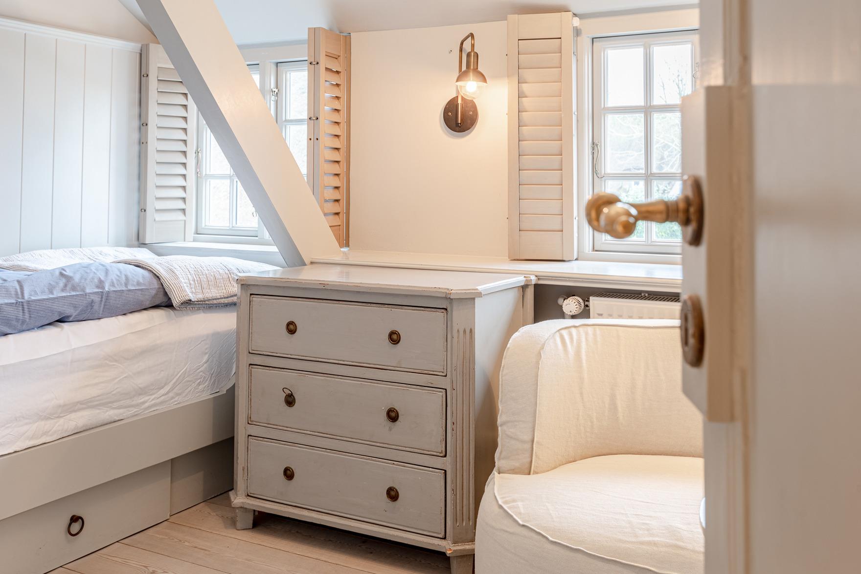 Die kleinere SÖNNES STUUV mit 60 qm wird durch den alten Haupteingang des Hauses betreten. Dem großzügigen Eingangsbereich schließt sich das mit bequemen Sitzmöbeln ausgestattete Wohnzimmer an. In der vollausgestatteten Küche bietet sich der Küchentisch zum ausgiebigen Speisen, Zeitung lesen, langen Gesprächen an. Das Schlafzimmer ist mit einem großen äußerst bequemen Bett und viel Stauraum ausgestattet. Daran anschließend befindet sich das geräumige, moderne Bad, von dem aus sich eine Blickachse durch die gesamte Wohnung, durch das Fenster über Hunderte von Metern in die Allee vor dem Haus eröffnet. Zum Speisen und Verweilen lädt auch eine Sitzecke vor dem Haus ein.