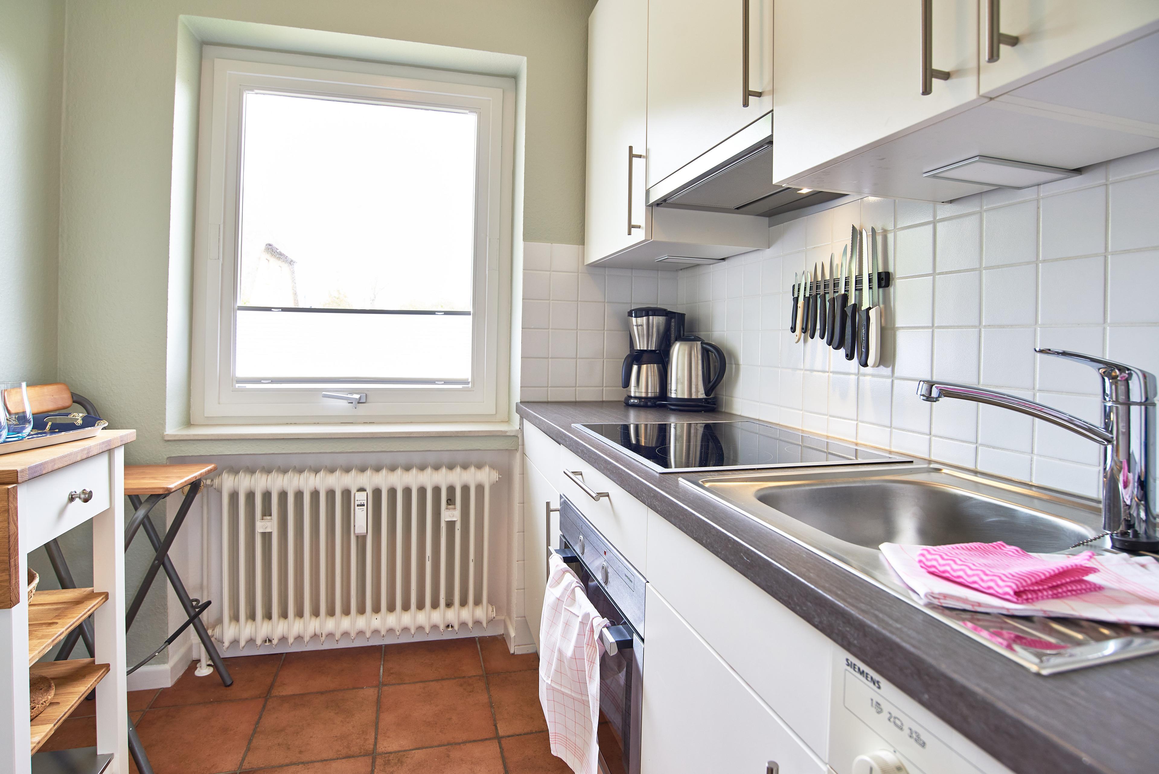 In der modernen, voll ausgestatteten Küche finden Sie unter anderem einen Herd mit Backofen, einen Kühlschrank mit Gefrierfach, Geschirrspüler, Filter-Kaffeemaschine, Wasserkocher, Toaster, Handrührer sowie allerlei Pütt und Pann zum Kochen und Backen.