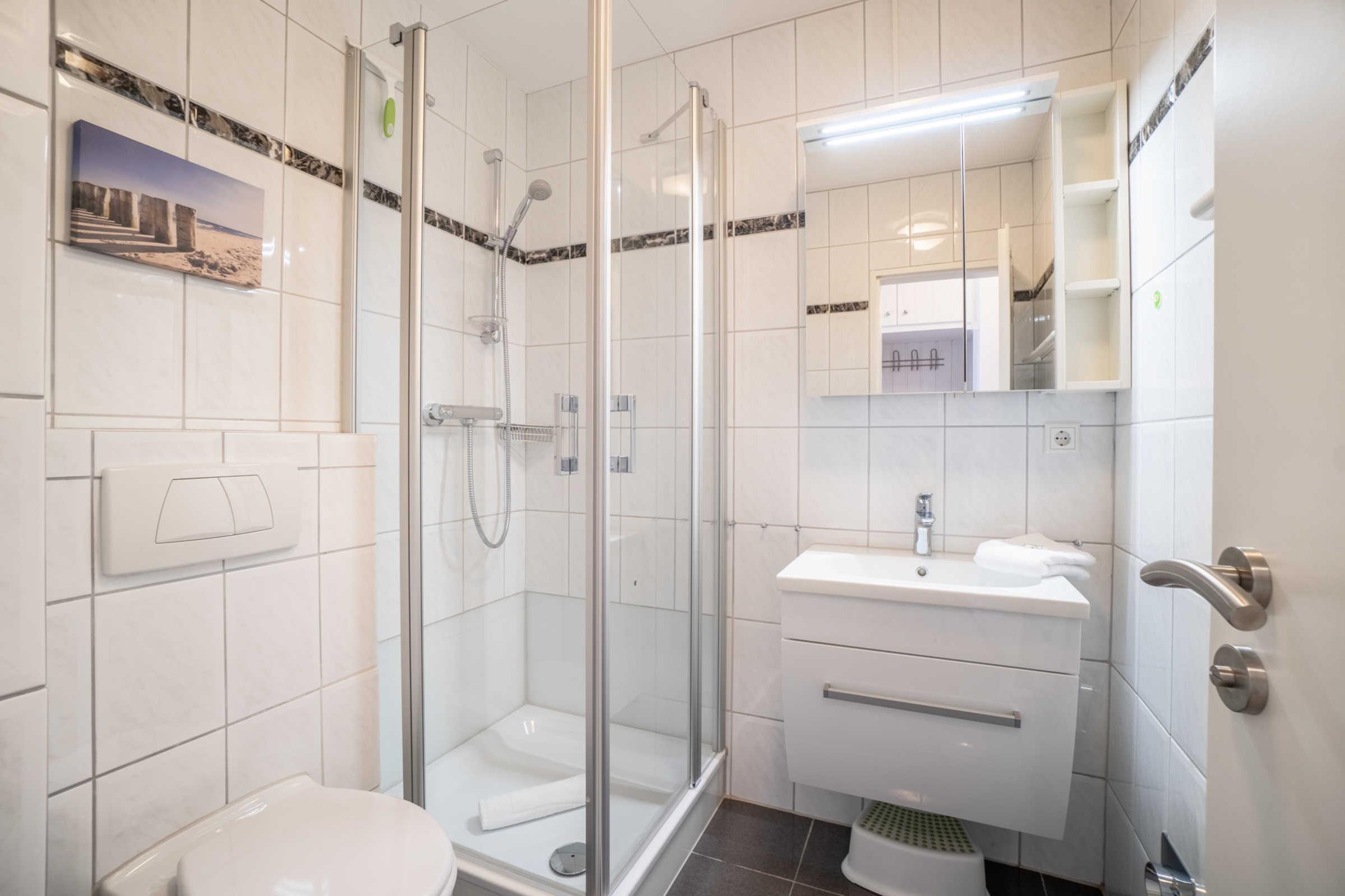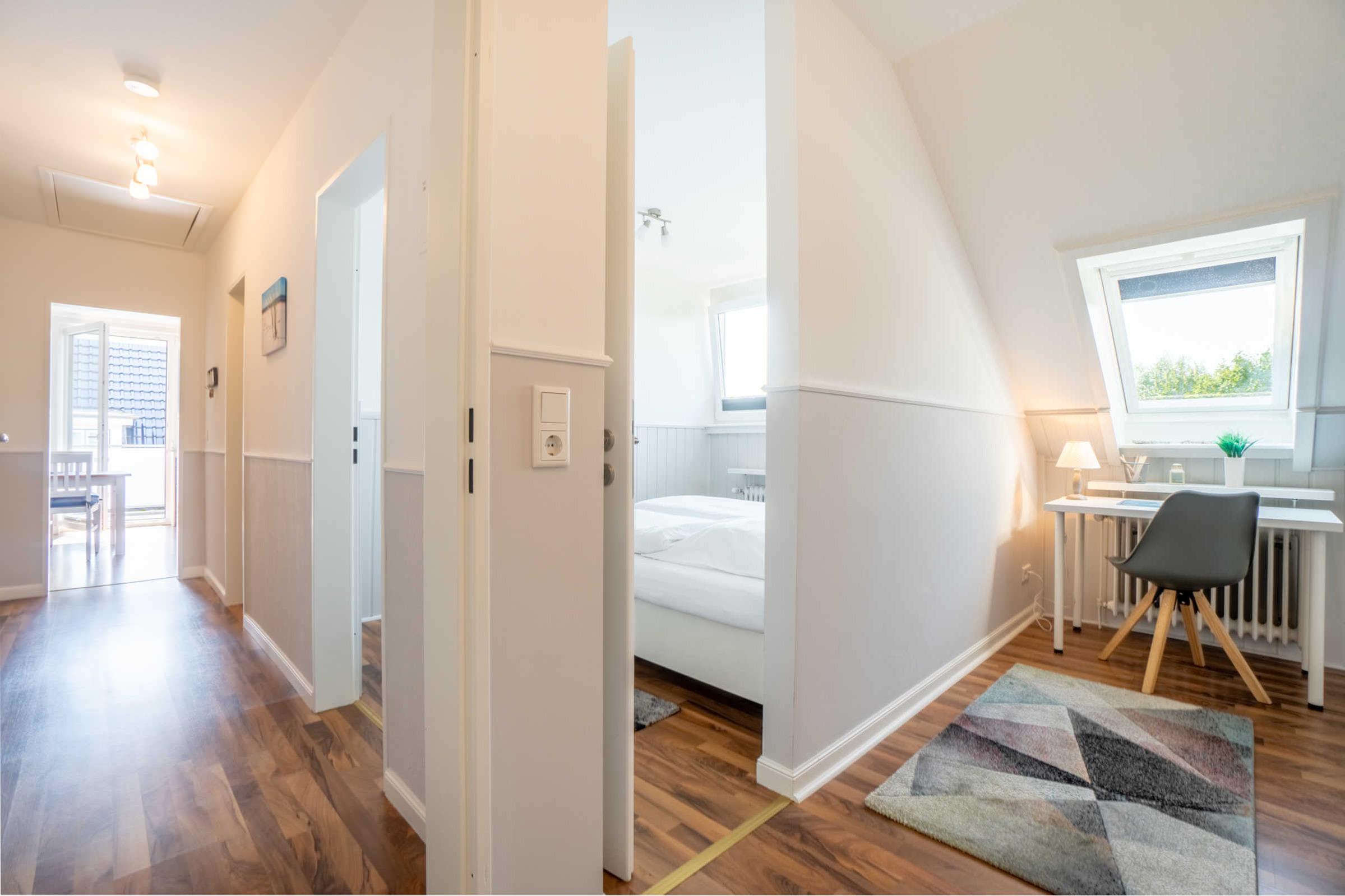 Die Wohnung liegt im Obergeschoss rechts und bietet Platz für bis zu 2 Personen mit Kleinkind. Sie hat einen Zugang zum Westbalkon.