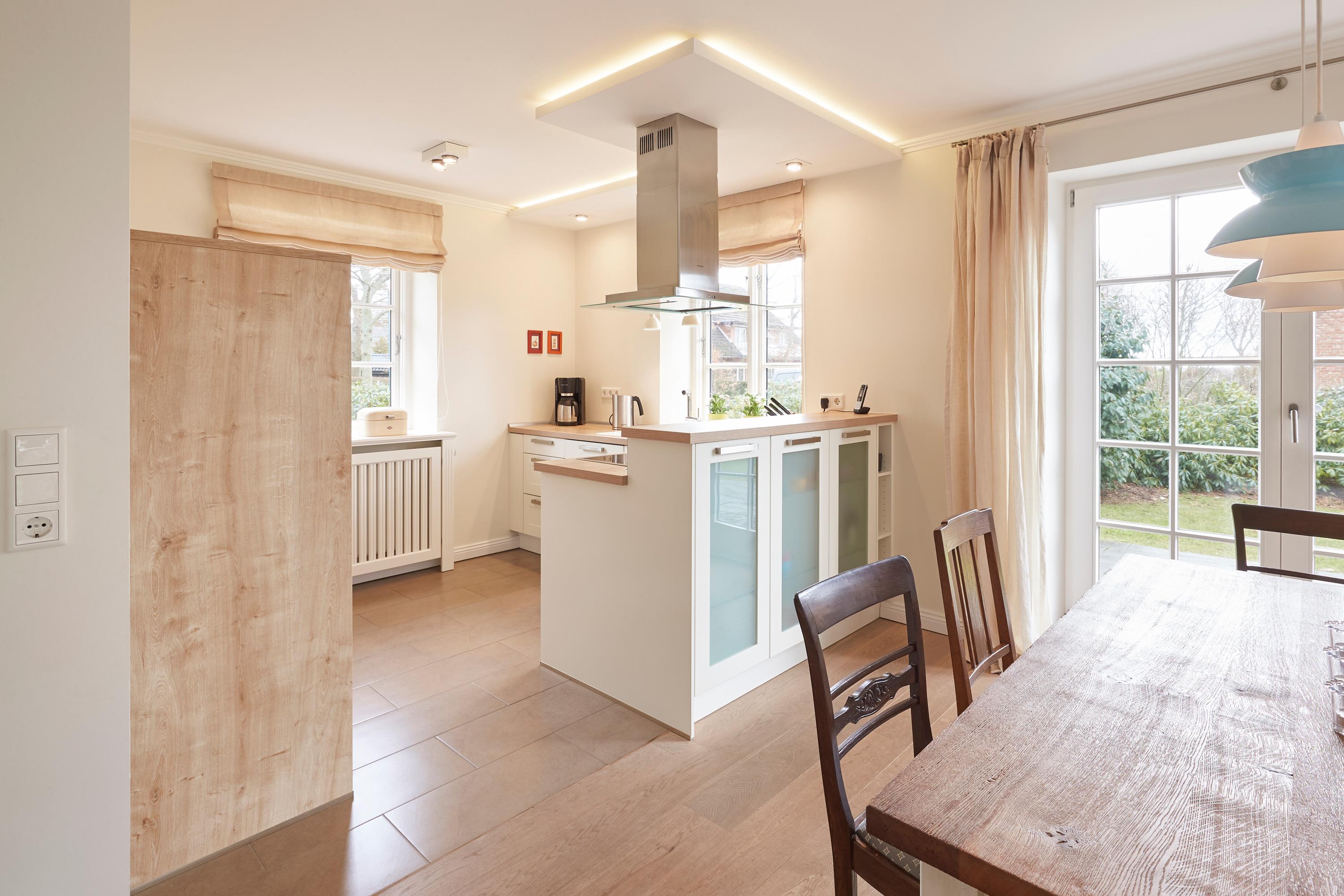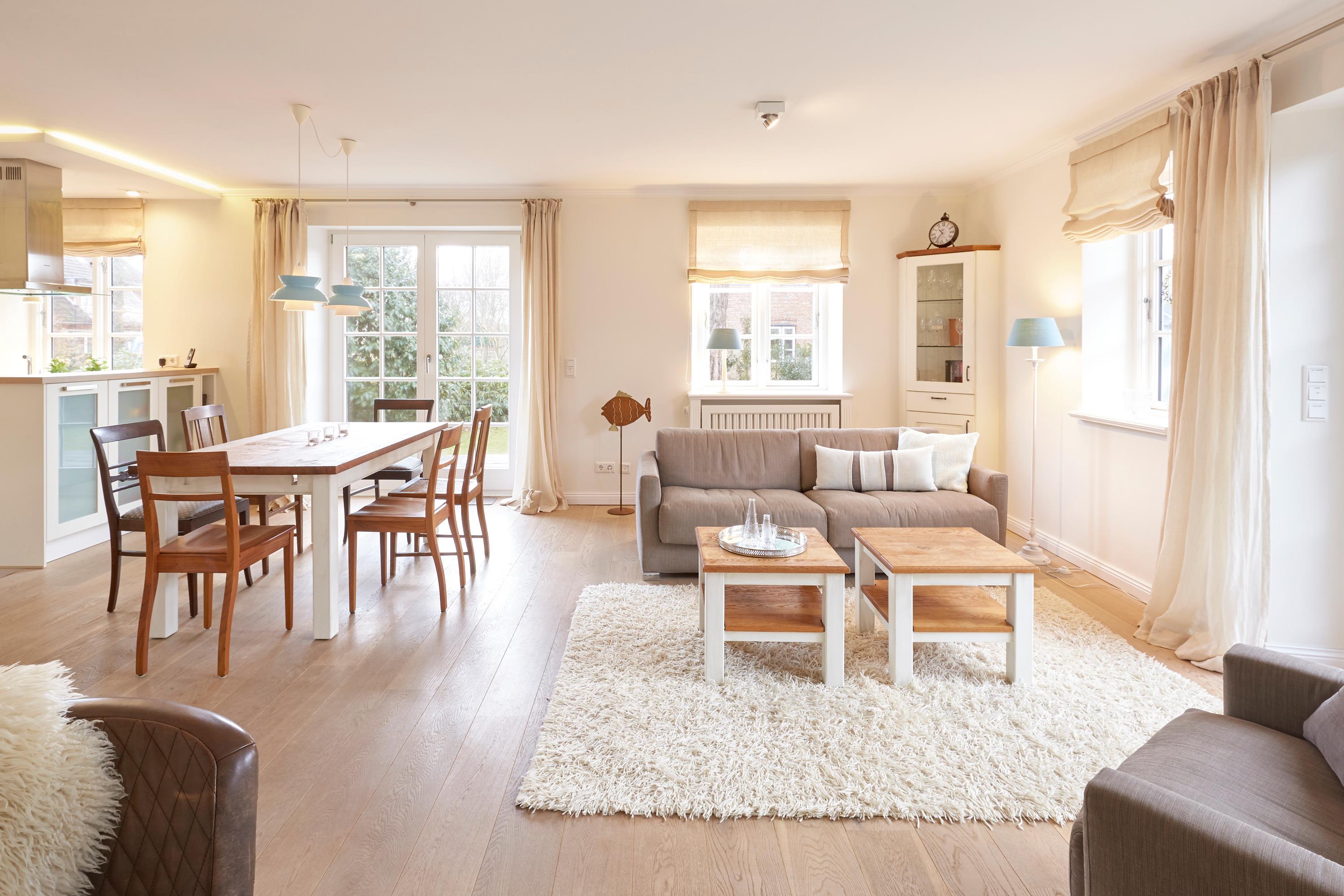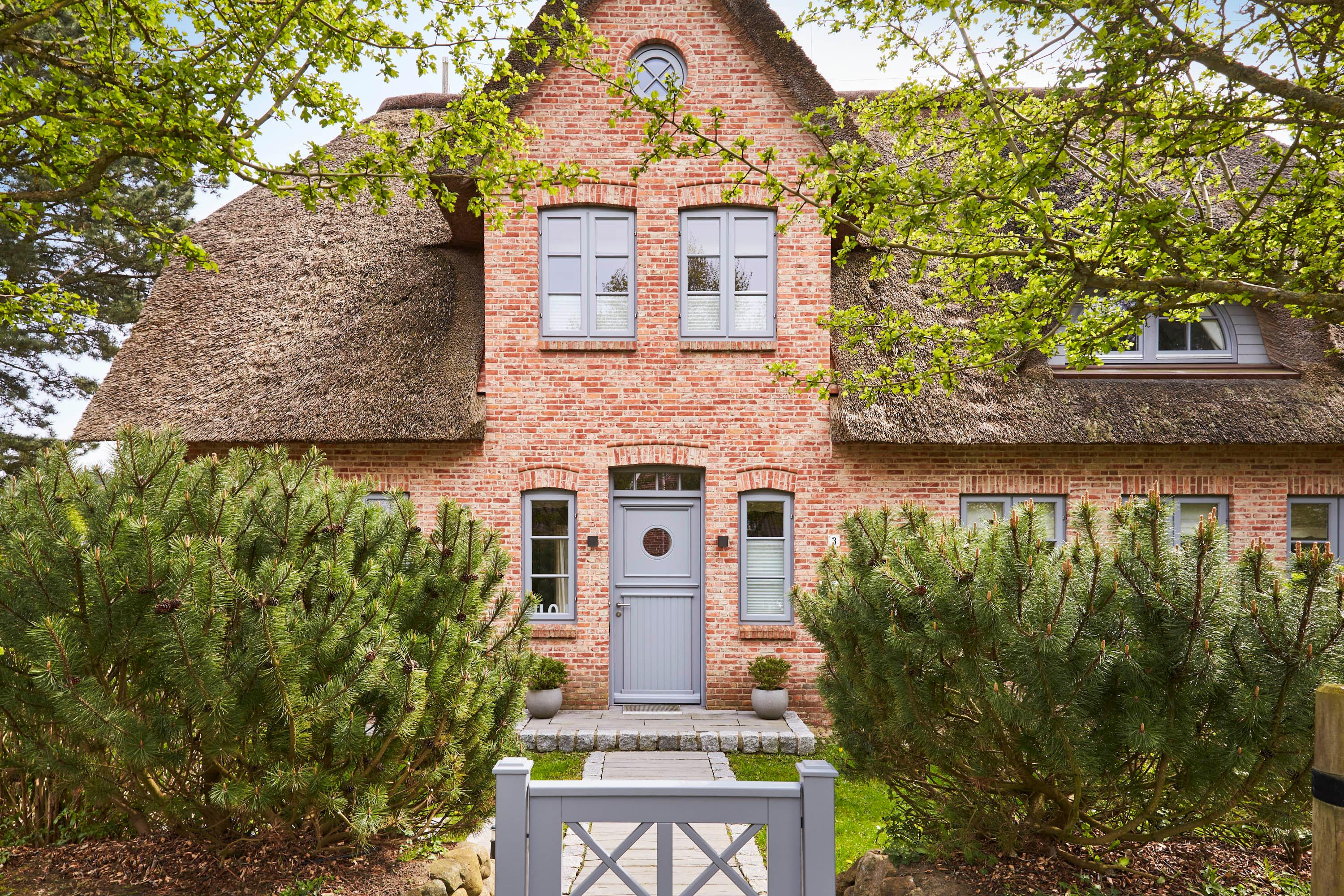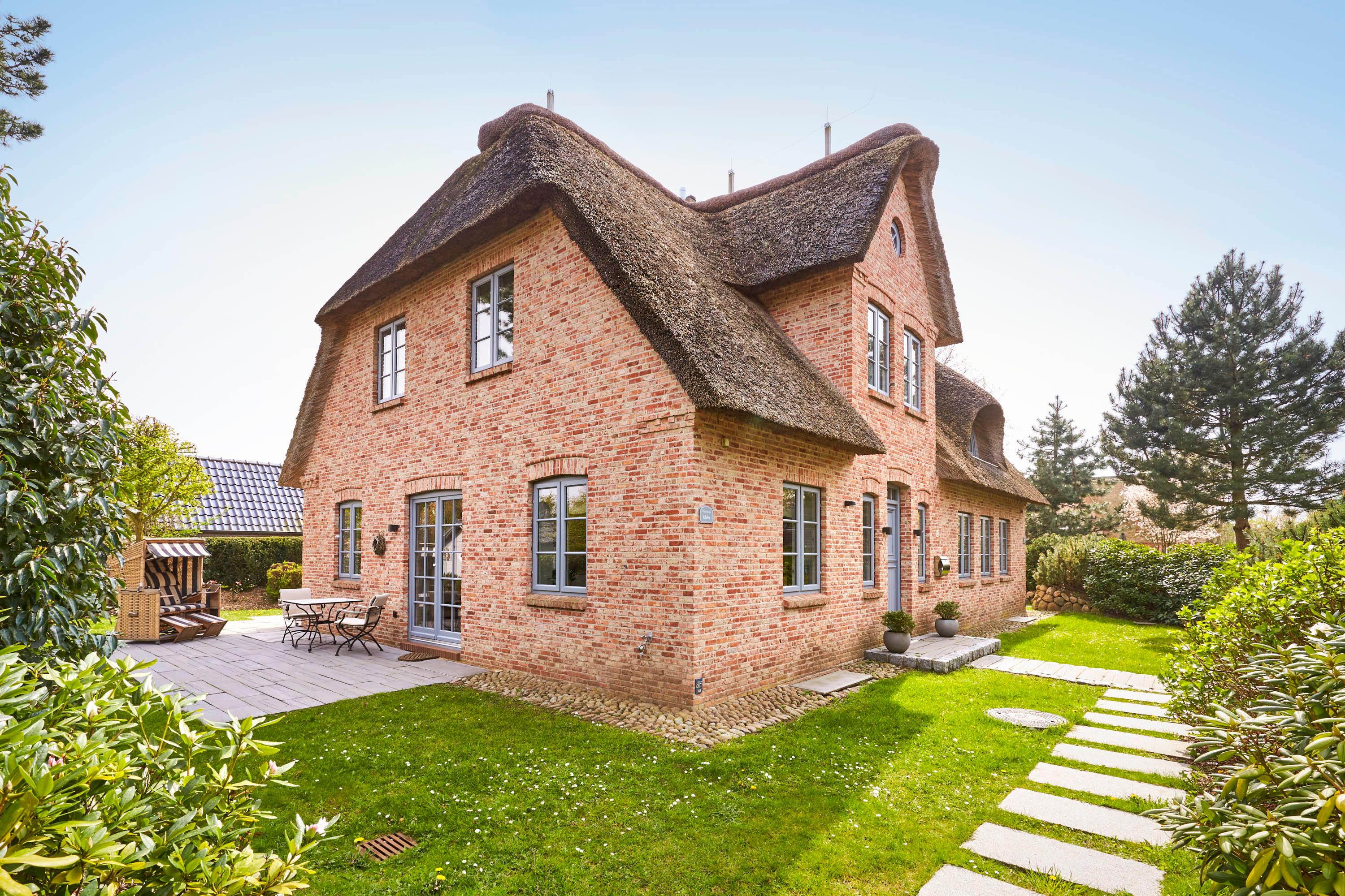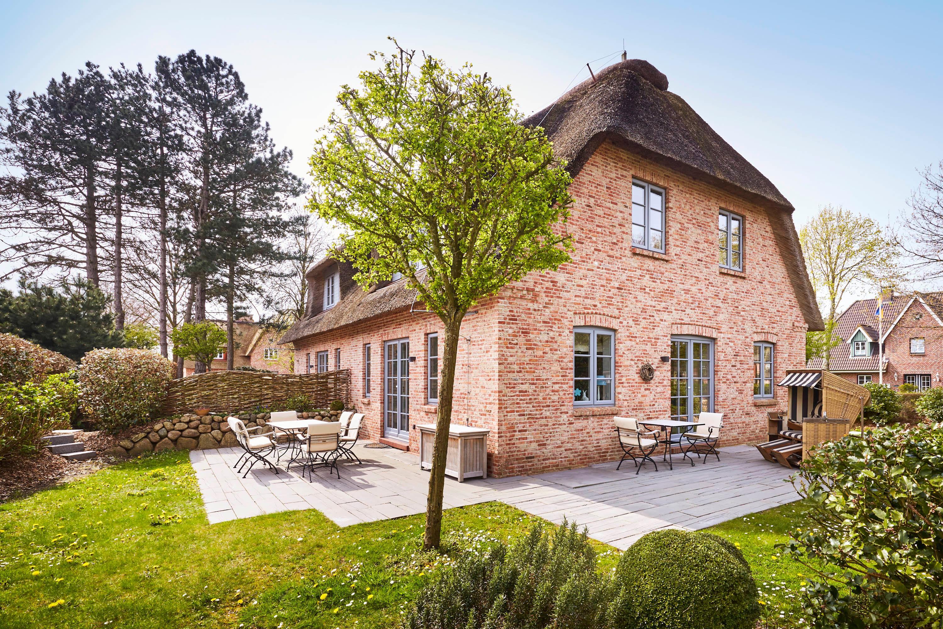 teilt sich in die Haushälfte Flut und die Haushälfte Ebbe. In einer absolut ruhigen Straße von Nieblum gelegen, wird Sie jede Haushälfte begeistern. Die Einrichtung im Landhausstil ist sehr hochwertig und geschmackvoll und lässt keine Wünsche offen. Wohnen Sie unter Reet im schönsten Dorf der Insel Föhr und genießen Sie den großen Garten mit typischen Friesenwall und schön angelegte Terrassen. In jedem Haus steht Ihnen eine Sauna mit Relaxraum zur Verfügung, und auch ein typischer Mylin-Kachelofen gehört natürlich zur Ausstattung dazu. Wir freuen uns, Sie als unsere Gäste begrüßen zu dürfen.