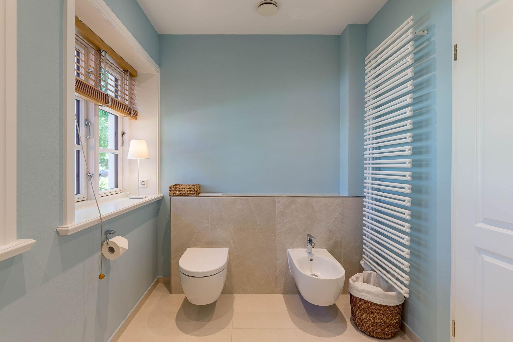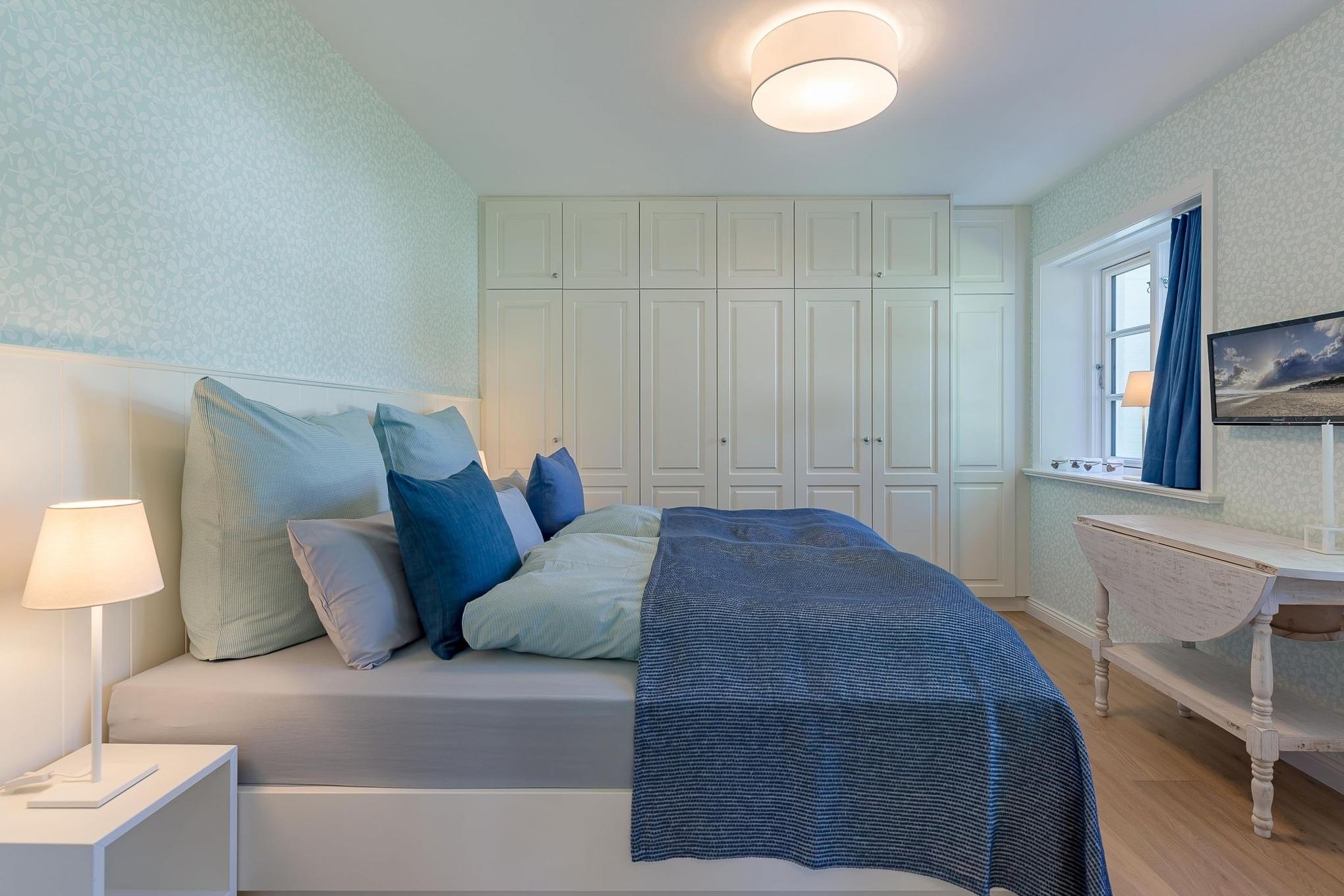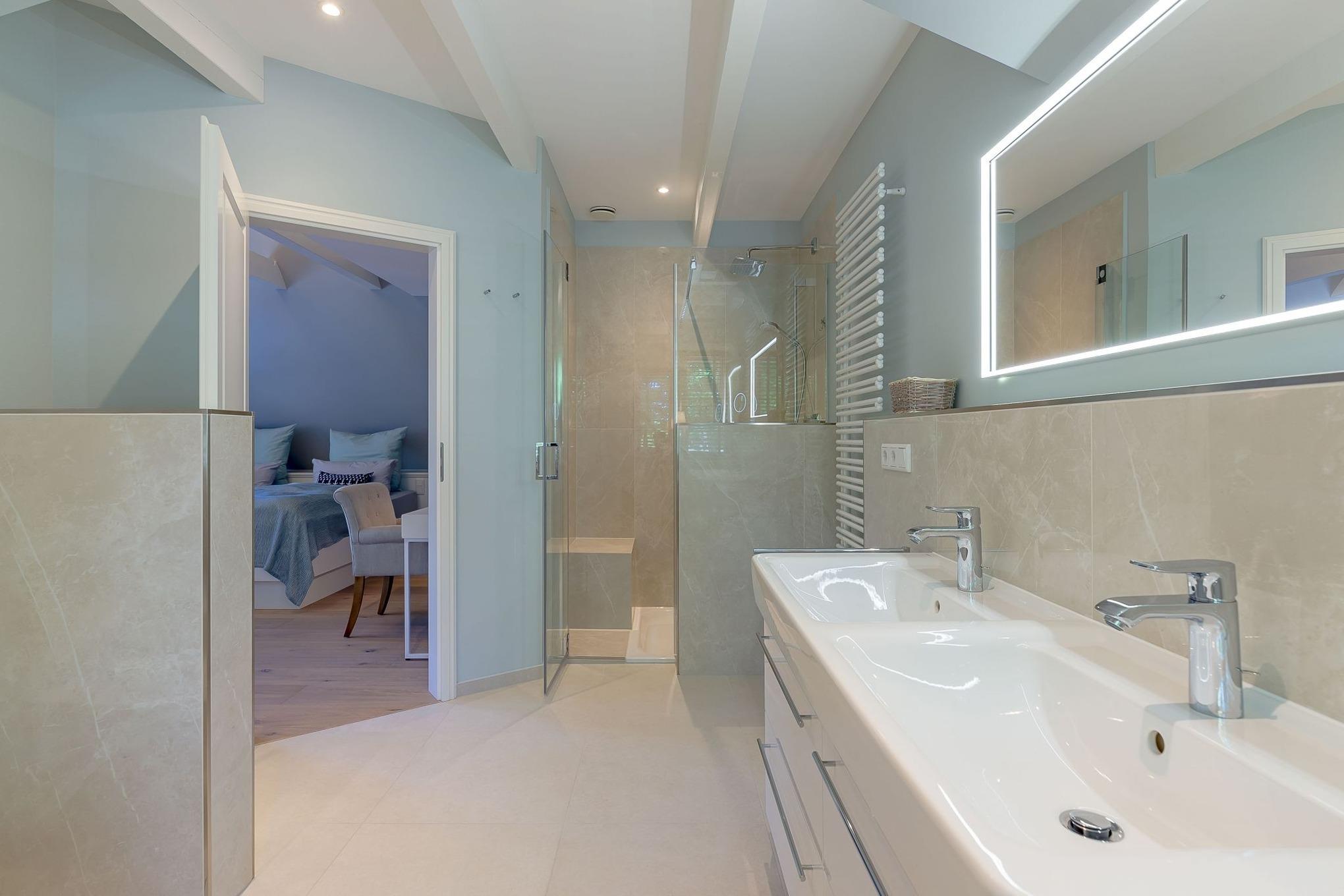 Im Obergeschoss finden Sie zwei weitere großzügige Schlafräume mit offener Kehlbalkendecke und en suite Bad. Beide Schlafräume sind ebenfalls jeweils mit einem TV und auch einem Schreibtisch ausgestattet. Ein Arbeitszimmer mit Alkoven ist einem Schlafzimmer vorgelagert. Die ebenfalls im Obergeschoss befindliche Sauna mit großer Walk-in-Dusche und Kneippgarnitur macht Ihren Wellnesstag zum Erlebnis.