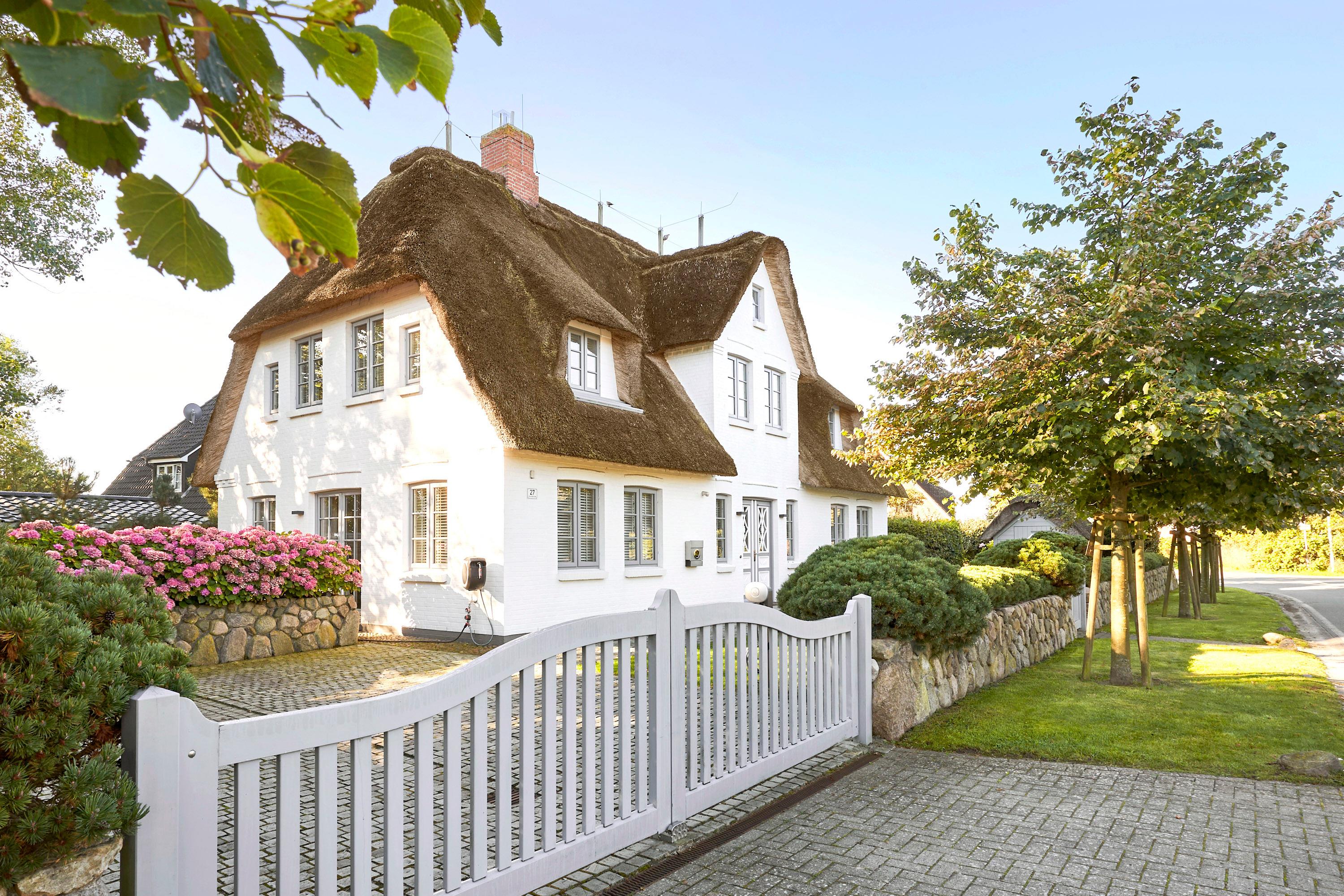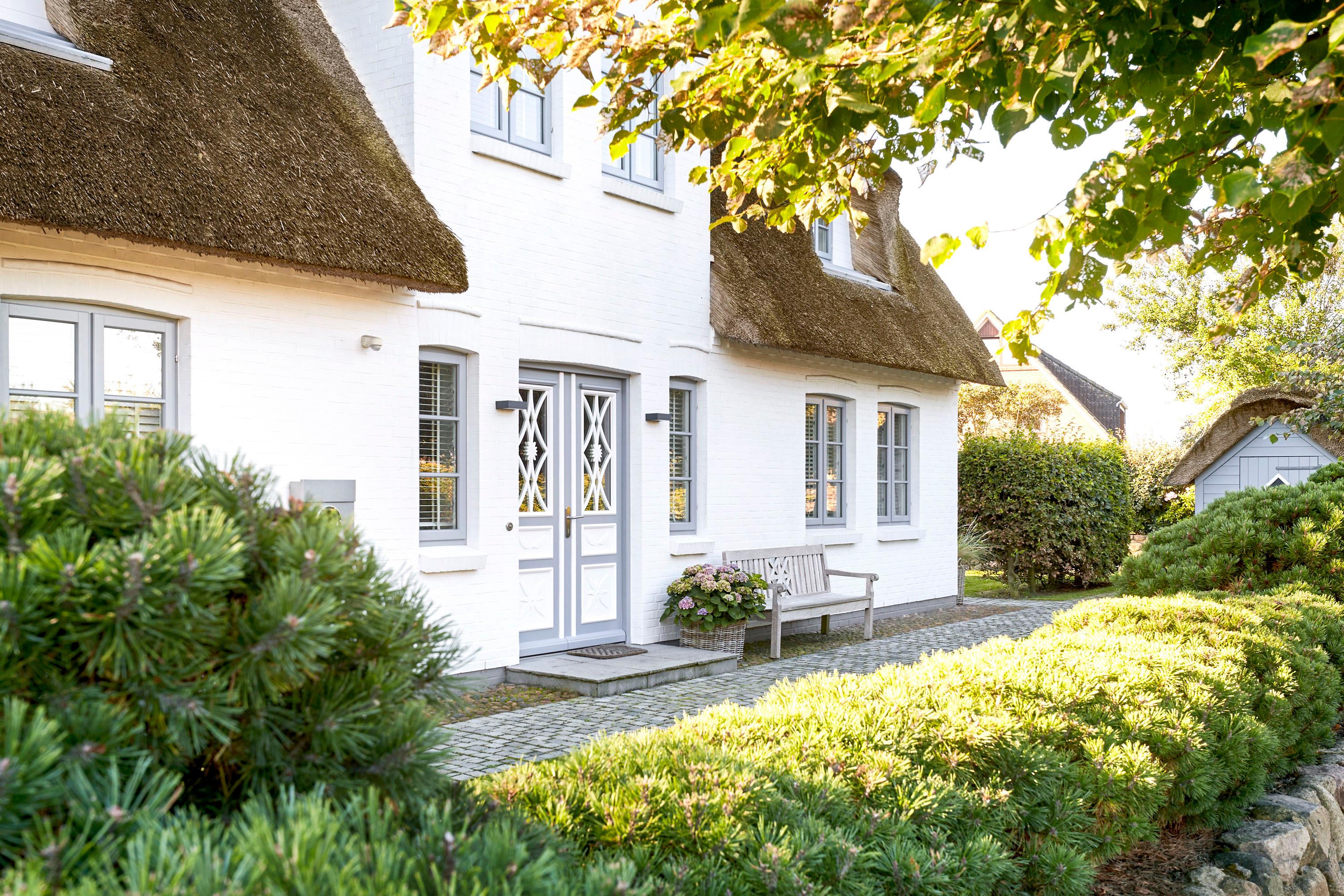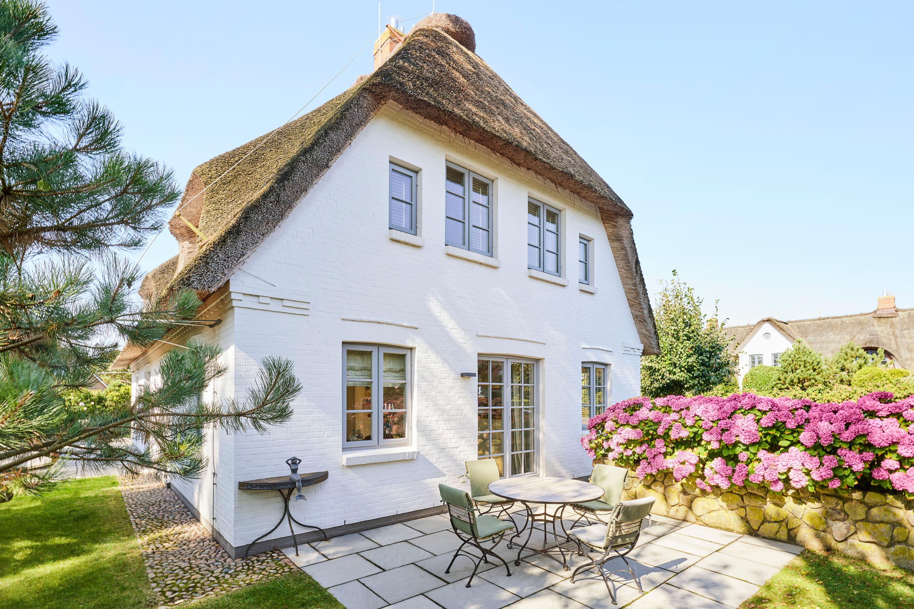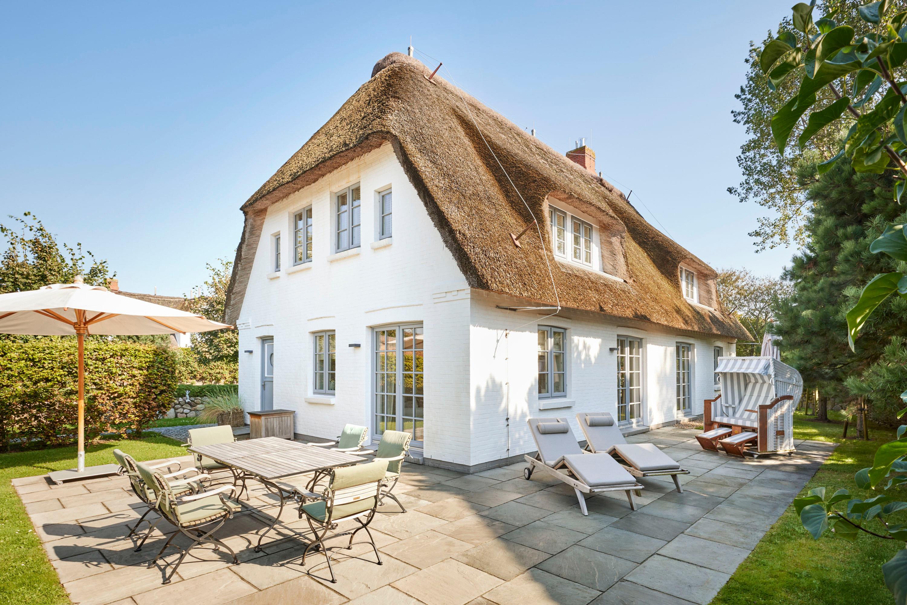 Wohnen Sie in diesem exklusiven Einzelhaus unter Reet im wunderschönen Friesendorf Nieblum. Hier finden Sie alte Kapitänshäuser, bunte Bauerngärten, Baumalleen und reetgedeckte Friesenhäuser - der perfekte Ausgangspunkt für einen erholsamen Urlaub. Das Haus ist sehr hochwertig ausgestattet und lässt keine Wünsche offen. Ein großzügiger Wohnraum mit Kachelofen, daran angrenzend der Essbereich für 6 Personen und die offene Küche mit allem, was das Kochherz begehrt, machen das Erdgeschoss zum Blickfang. Im Obergeschoss befinden sich drei geräumige Schlafräume und zwei Badtempel. Auf der ca. 95qm großen Terrasse und im schön angelegtem Garten werden Sie erholsame Urlaubstage verbringen.