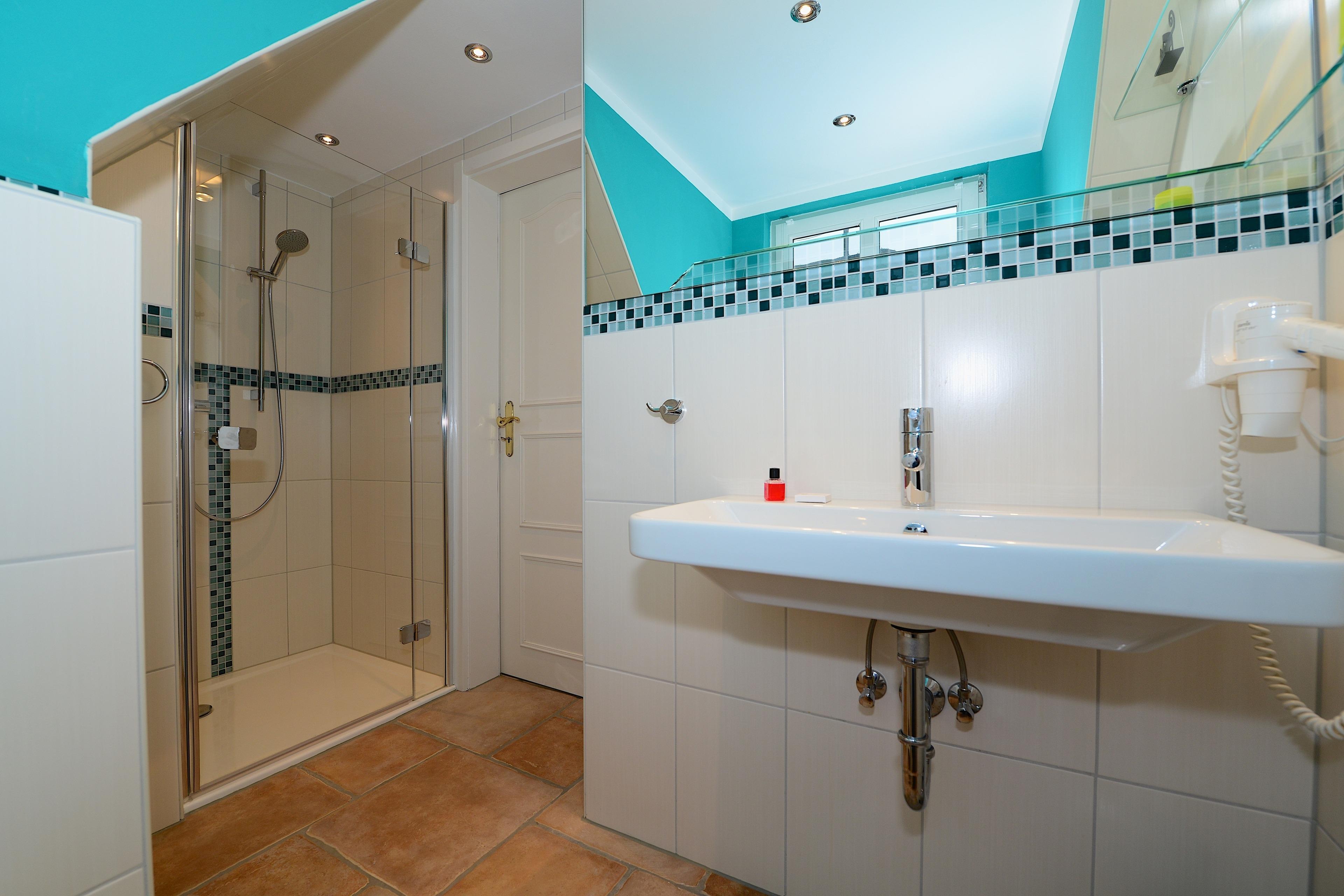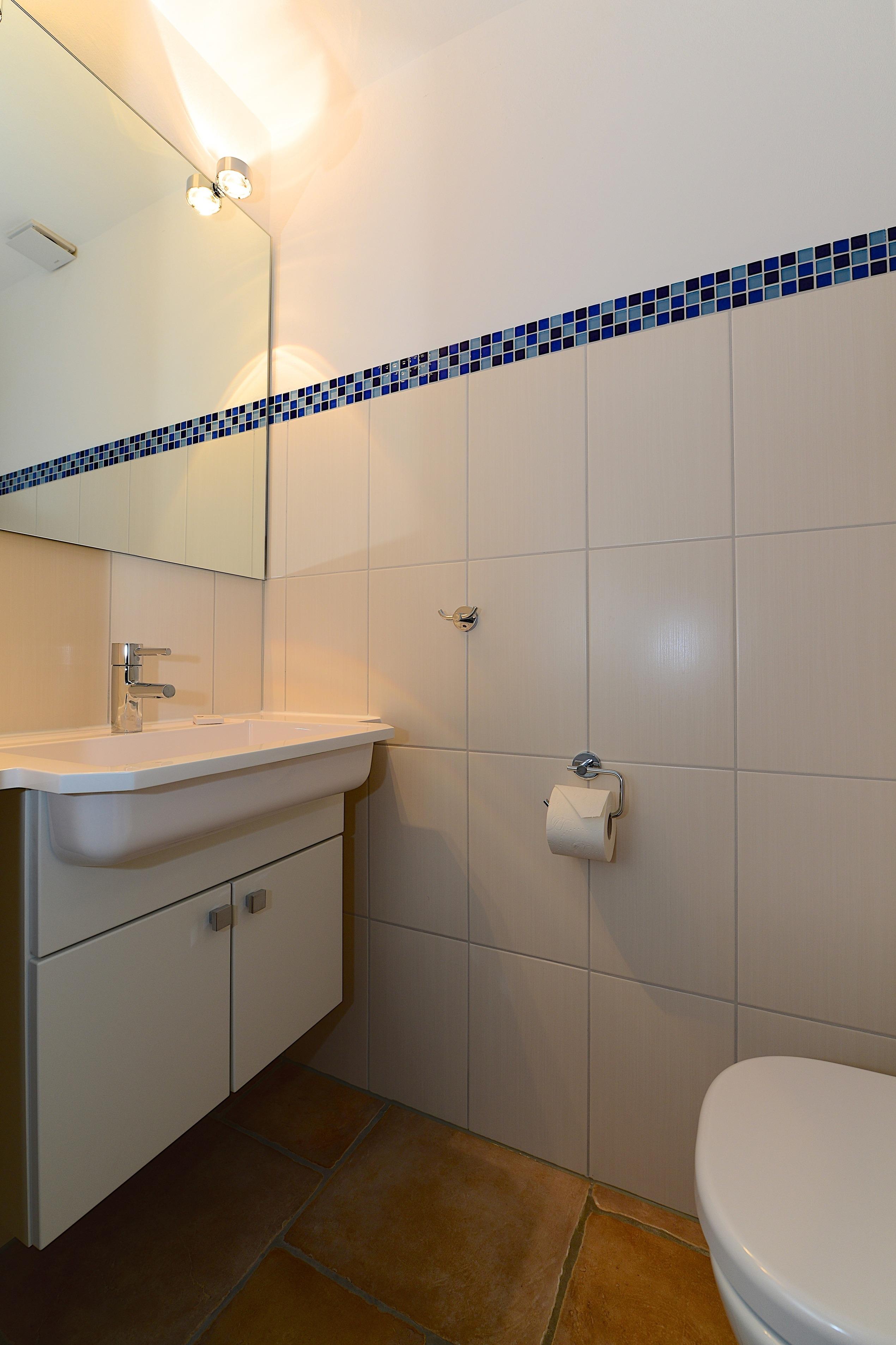 Ein stilvolles Duschbad steht Ihnen im Obergeschoss zur Verfügung, während im Erdgeschoss eine praktische Gäste-Toilette den Komfort ergänzt.