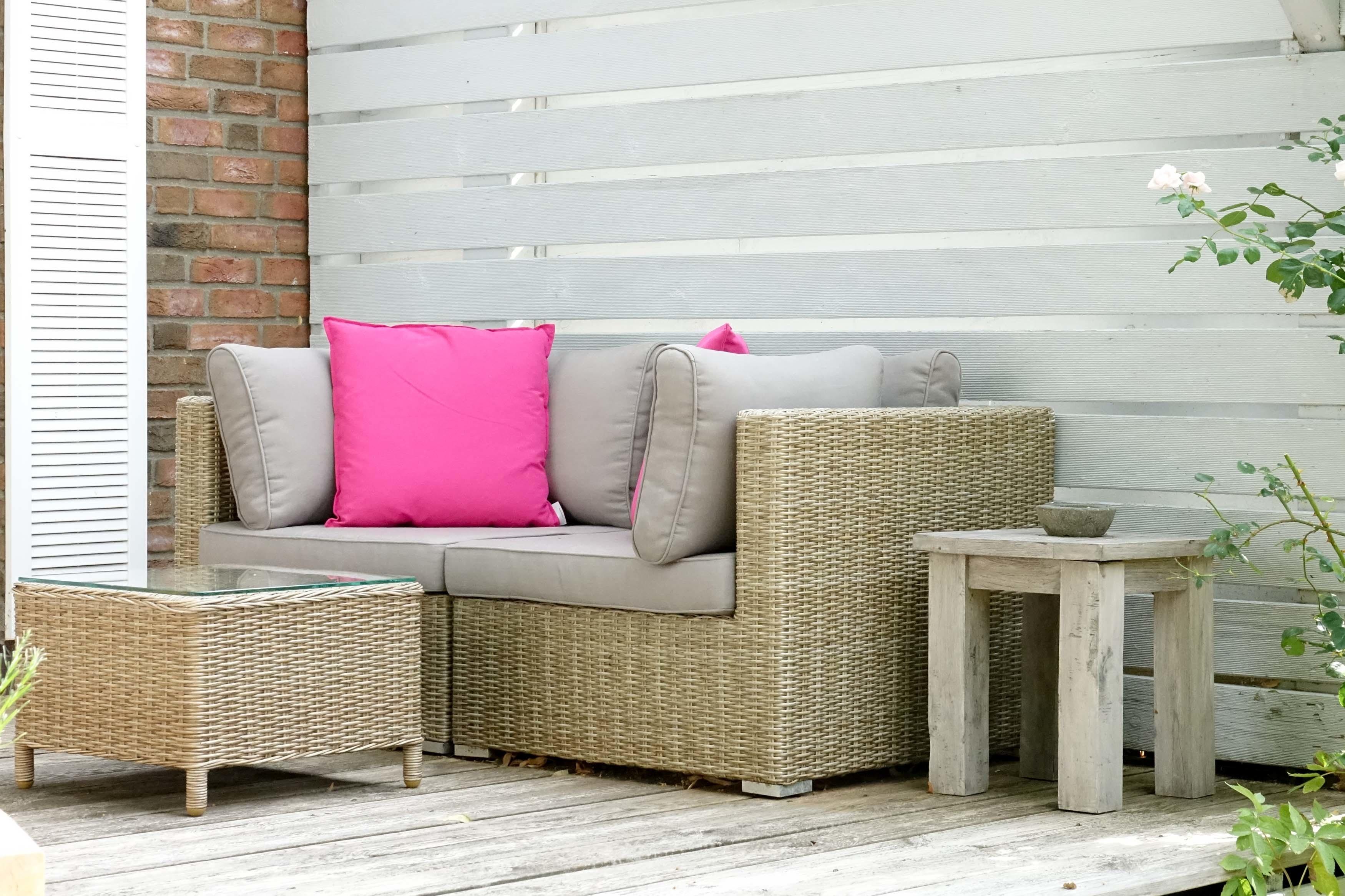 Kiesterrasse und großer Obstgarten, private Holzterasse