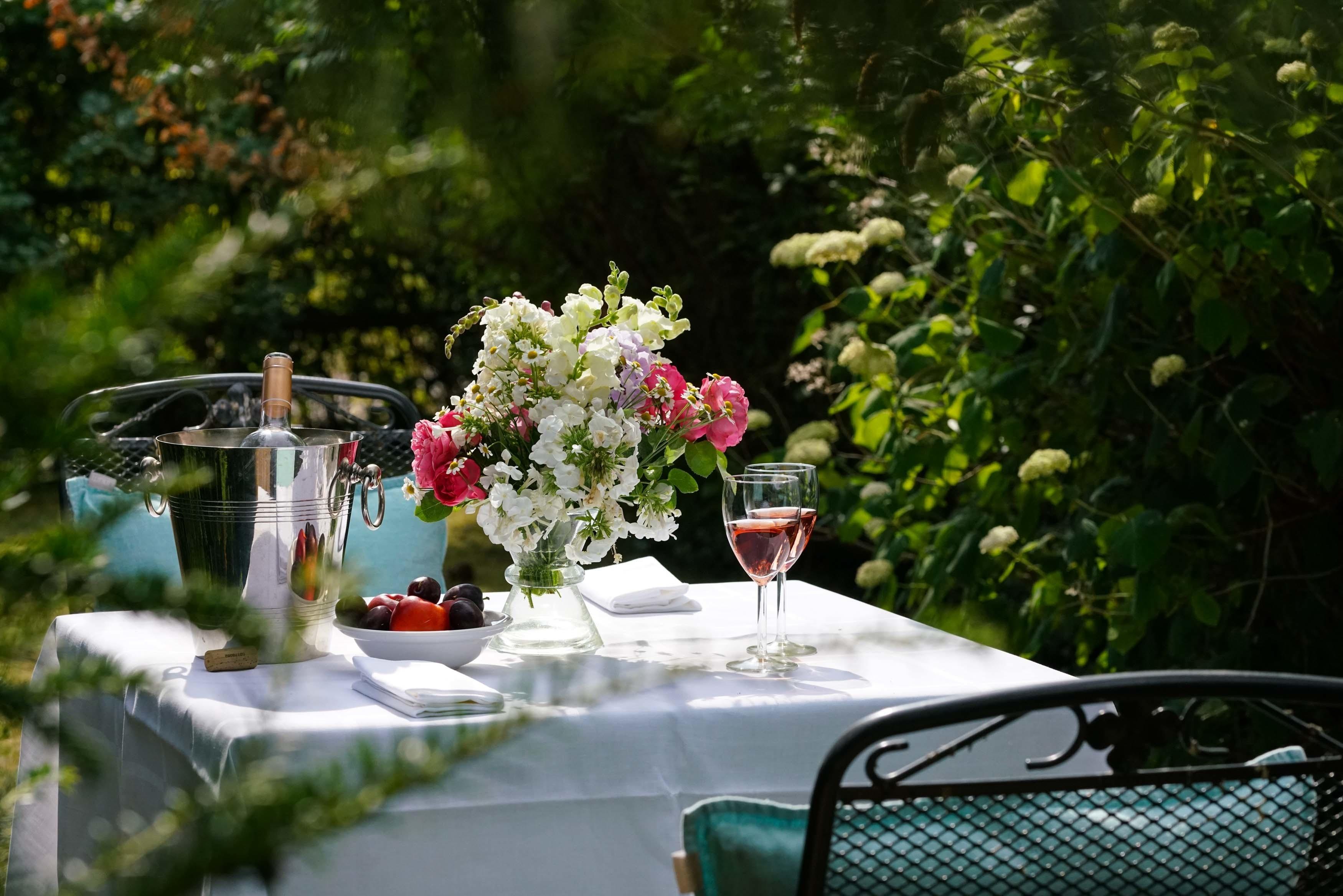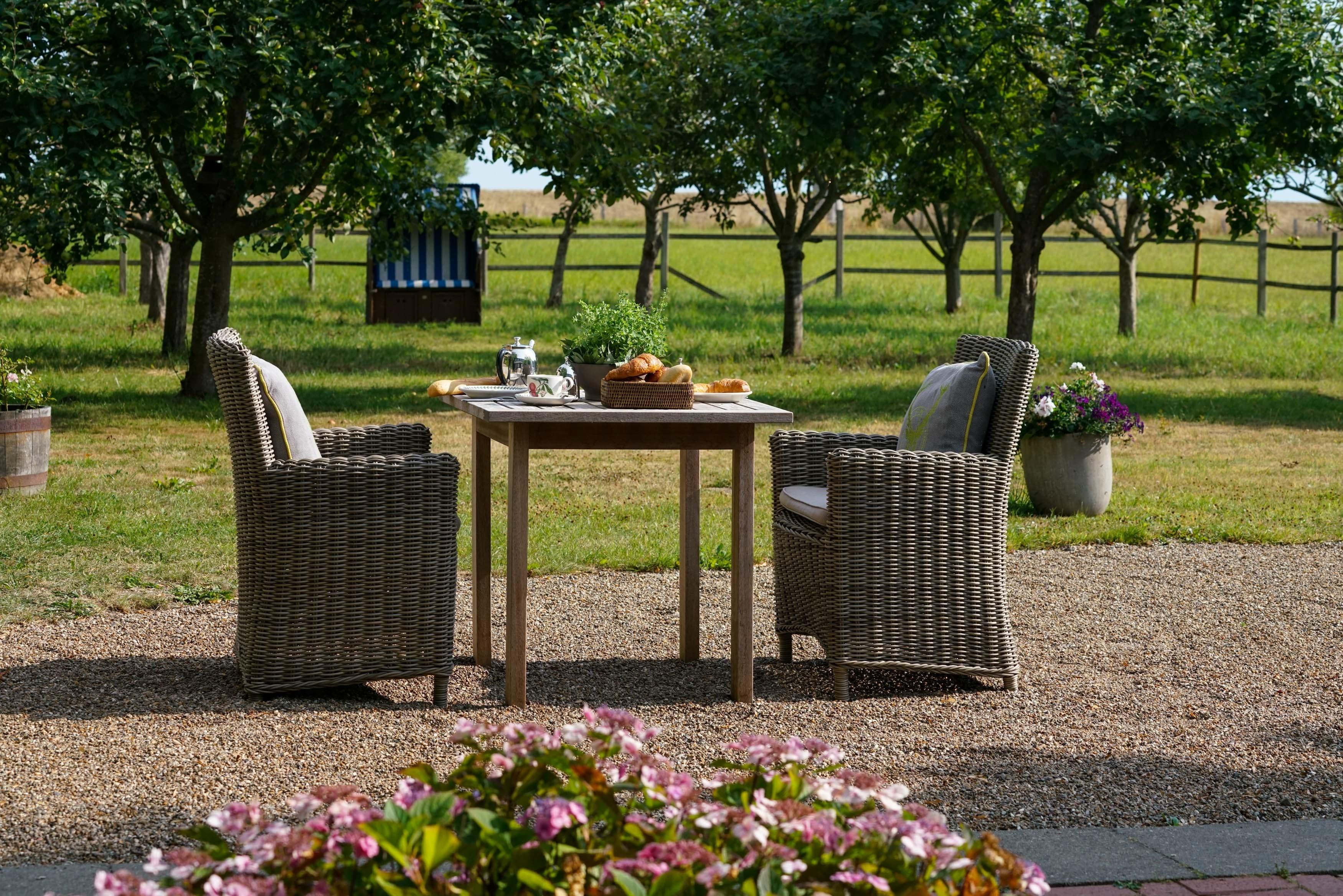 Kiesterrasse und großer Obstgarten, private Holzterasse