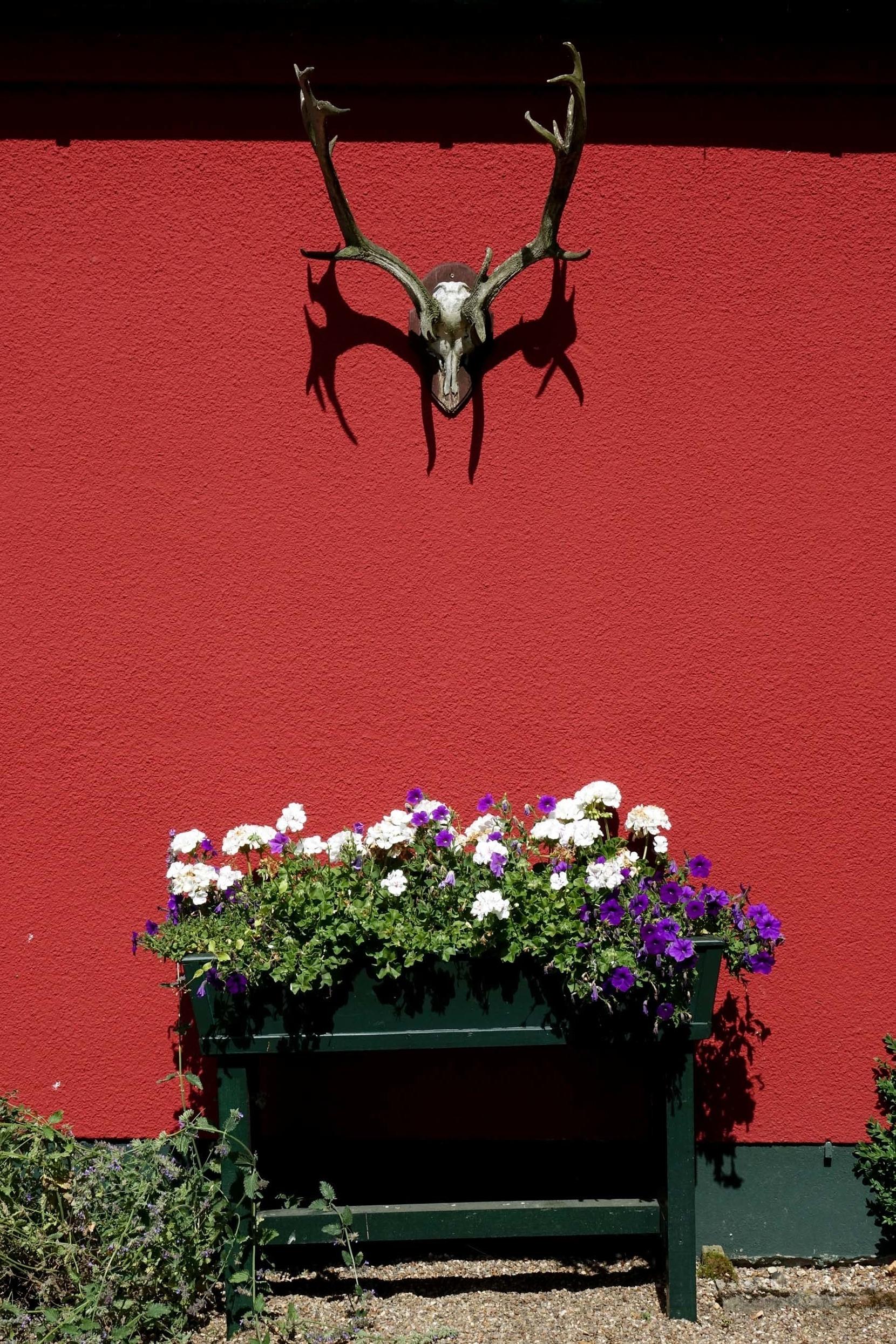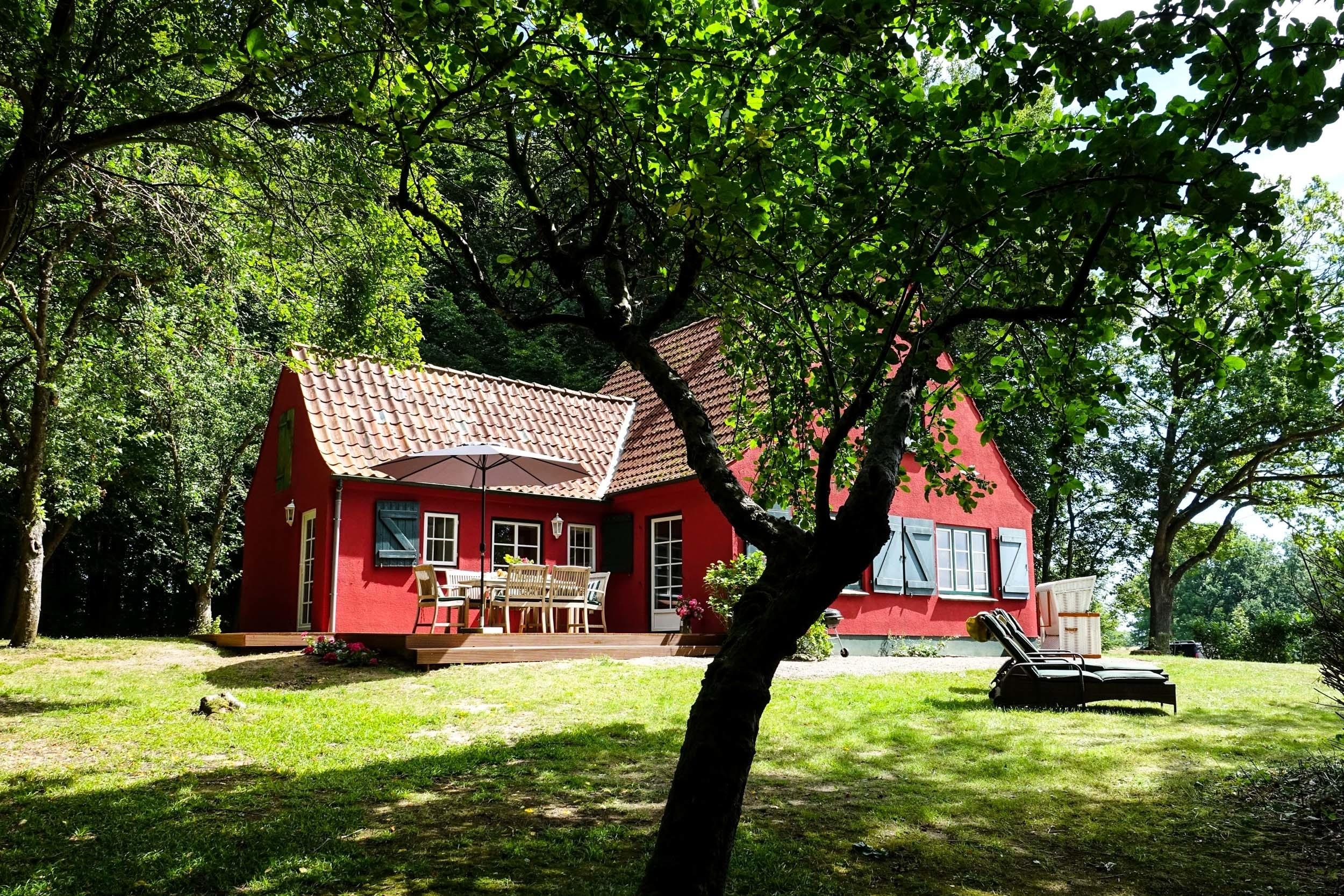 Als der Gutshof auf Beveroe mit seiner großen Walfischscheune noch auf der Geltinger Birk stand, wurde dieses Haus von einem ehemaligen geflohenem Gutsbesitzer, ganz in der Nähe erbaut. Die Försterei liegt am Waldrand, mitten im Landschaftsschutzgebiet in einer absoluten Alleinlage. Ochsenblutrot gestrichen ist es schon von der Mühle Charlotte in der Ferne liegend sichtbar und ebenso weit ist der Blick von der Terrasse und dem Garten, der heute über die Weiden der Wildpferde und Highland Rinder schweift, die zur Landschaftspflege des Gebiets eingesetzt werden.