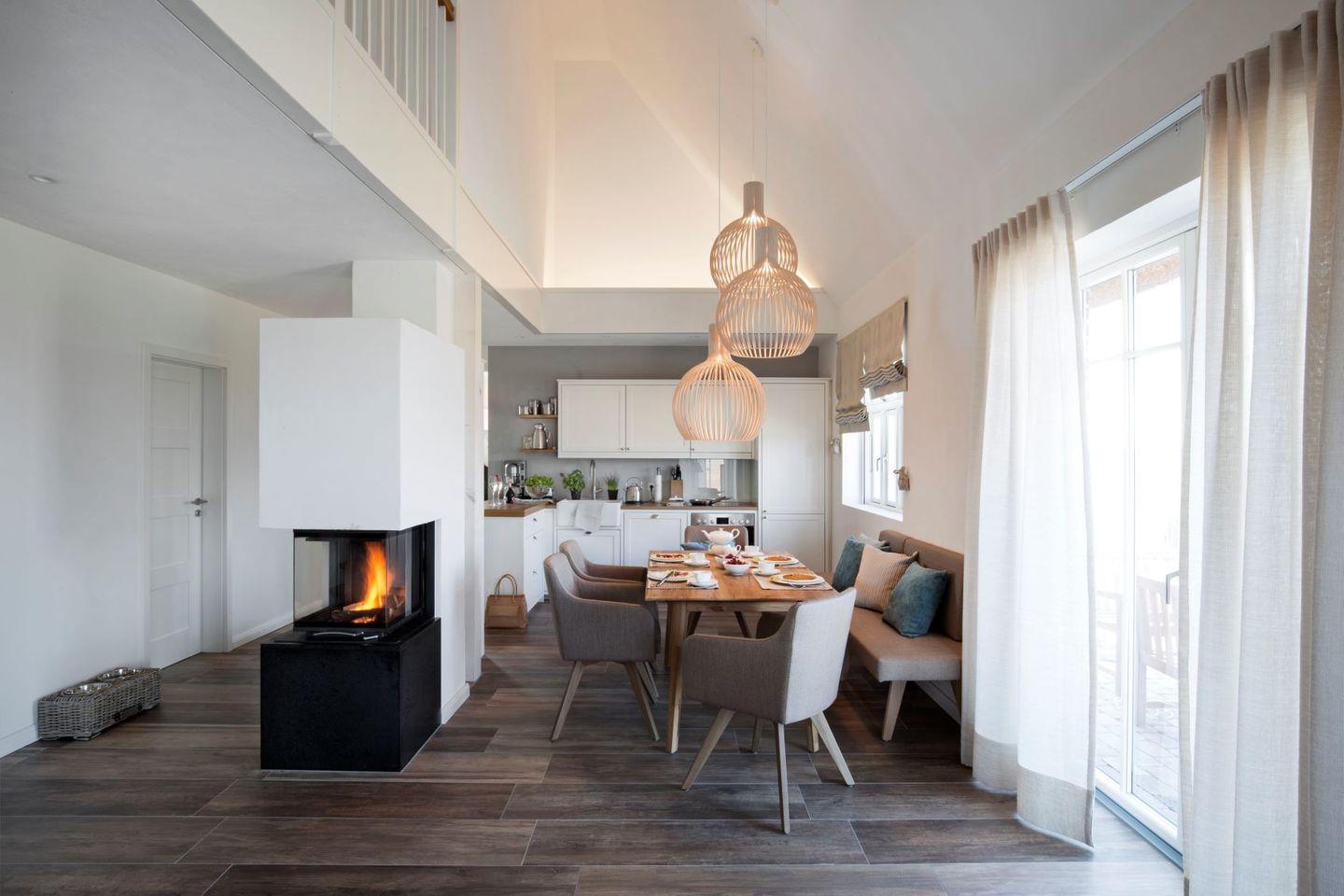 Auf 110 Quadratmetern Wohnfläche genießen Sie die Annehmlichkeiten der exklusiven Einrichtung in Ihrer Künstlerkate Eisvogel im Reetdorf Geltinger Birk. Kamin, Sauna und eine großzügige Terrasse mit Teakholzsitzecke und eigenem Strandkorb sind nur einige Aspekte der Wohlfühl-Oasen in diesem 5-Sterne-Ferienhaus. Es verfügt über zwei Doppel - und einem Einzelzimmer mit zwei Bädern, eines davon en-suite. Der untere Schlafbereich und das Bad im Erdgeschoss sind frei von Schwellen und Hindernissen.