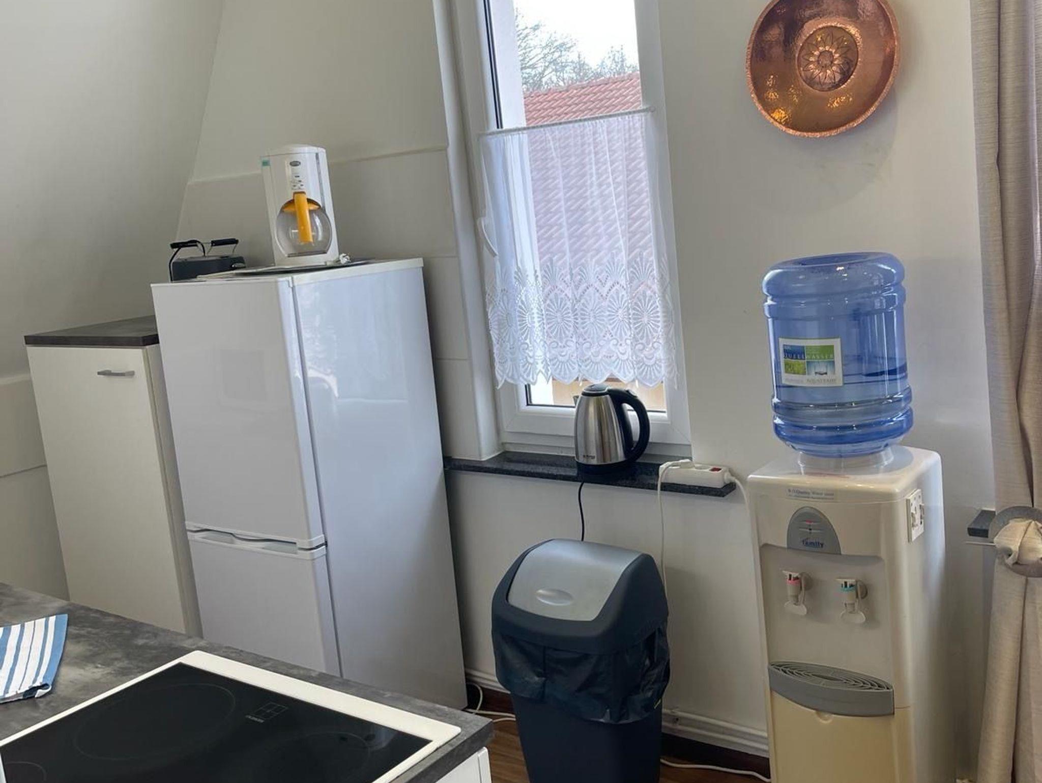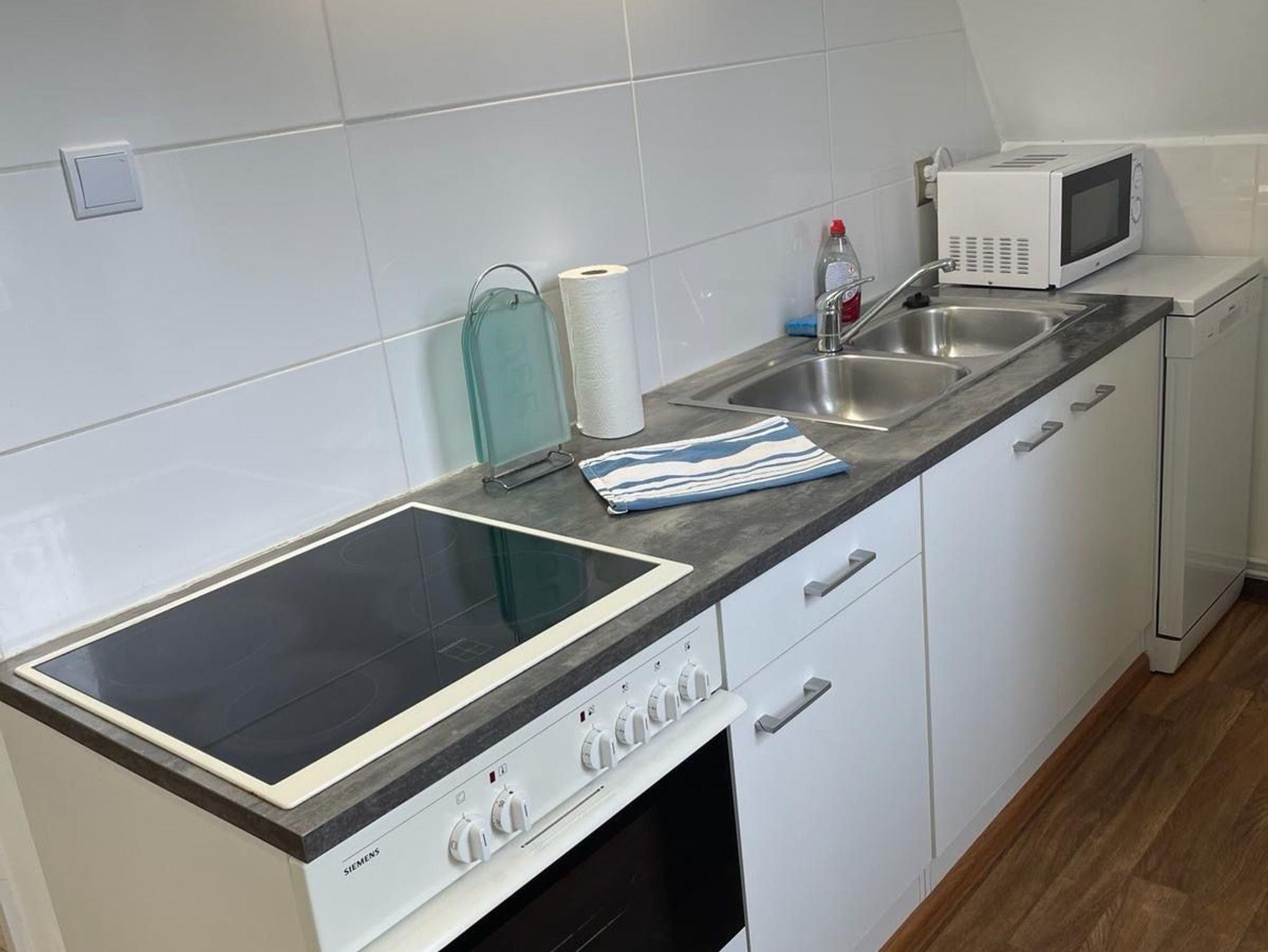 Die gemeinschaftliche Küche ist mit einem Kühlschrank, Geschirrspüler und Backofen sowie einer Mikrowelle ausgestattet, das gemeinschaftlich nutzbare Wohnzimmer mit einen TV Gerät.